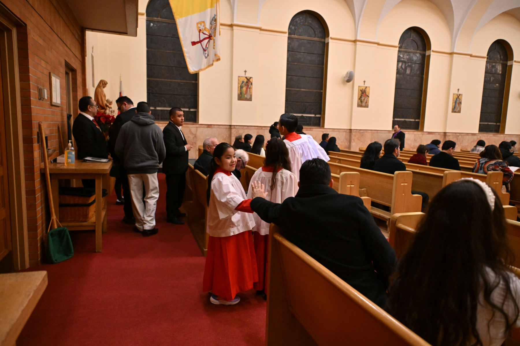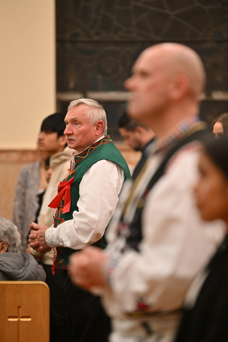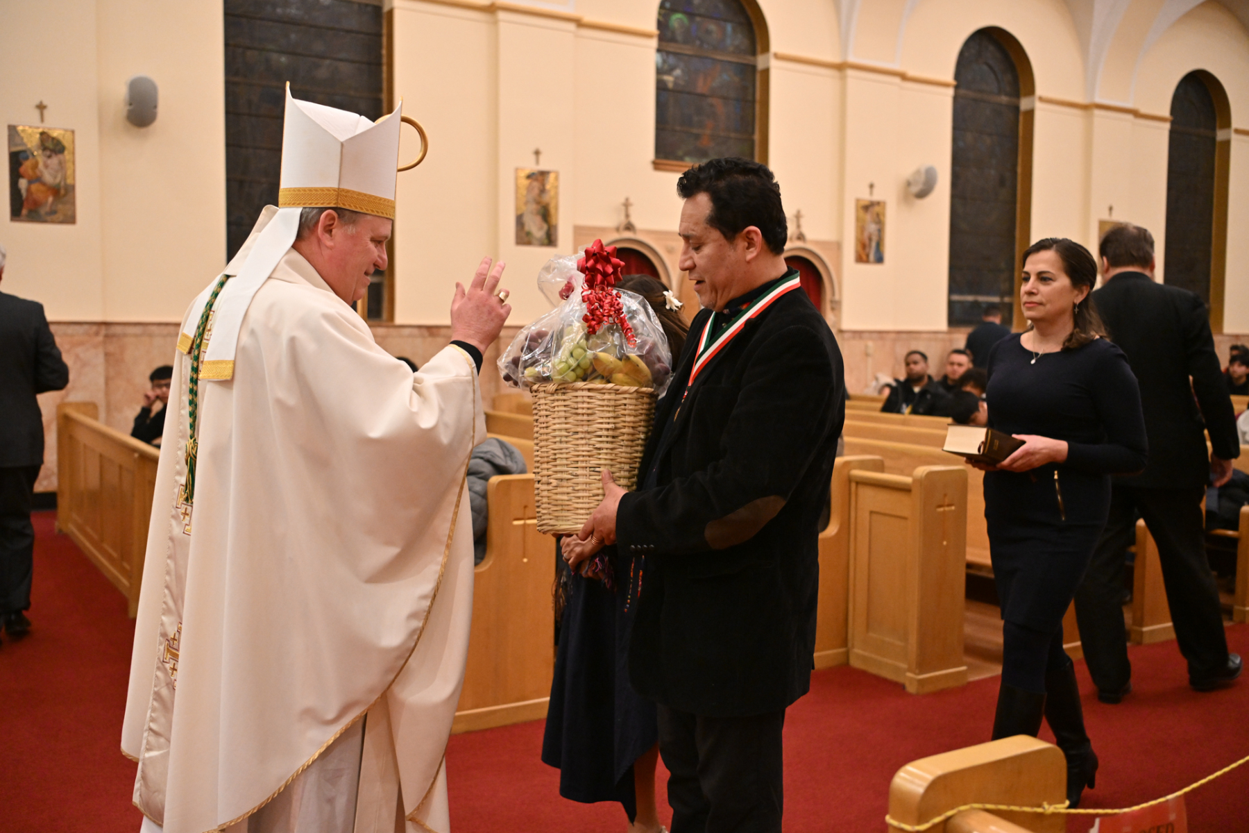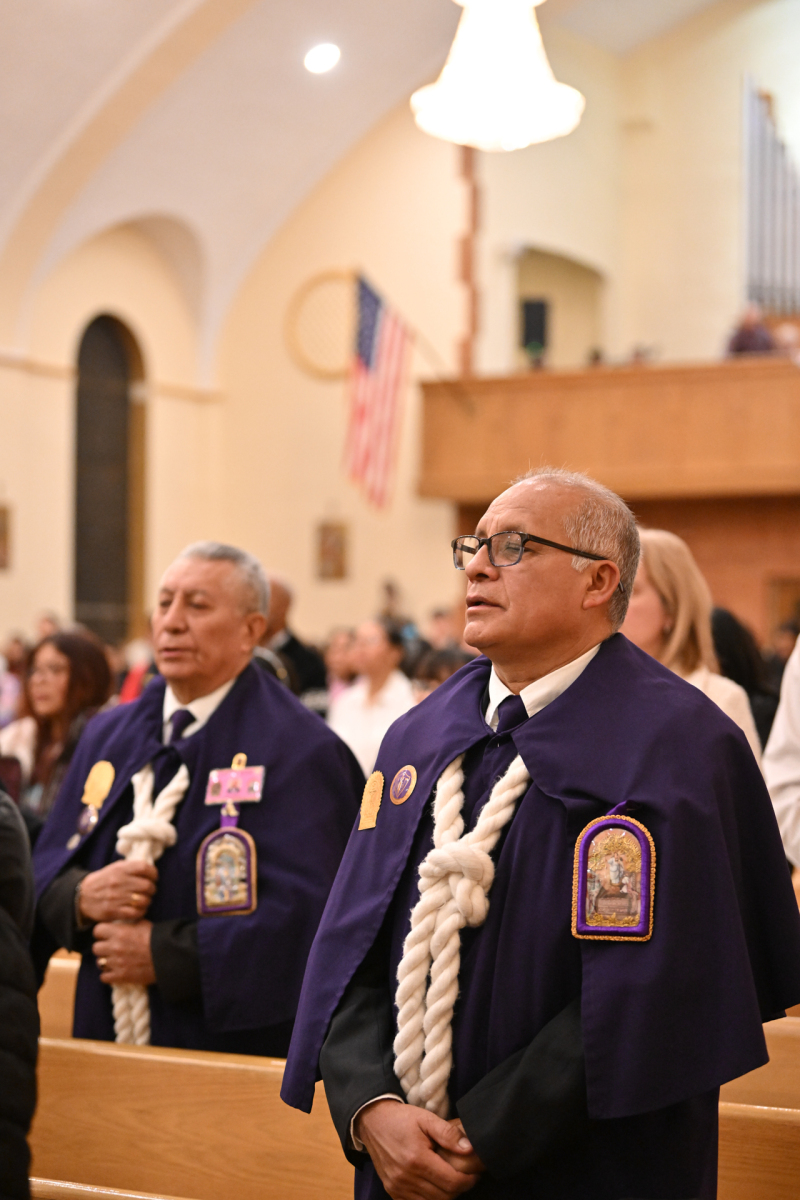 Some churchgoers wore ethnic clothing. The Knights of Columbus and members of the group Señor de los Milagros, or “Lord of the Miracles,” a devotion from Peru, participated in the Mass.