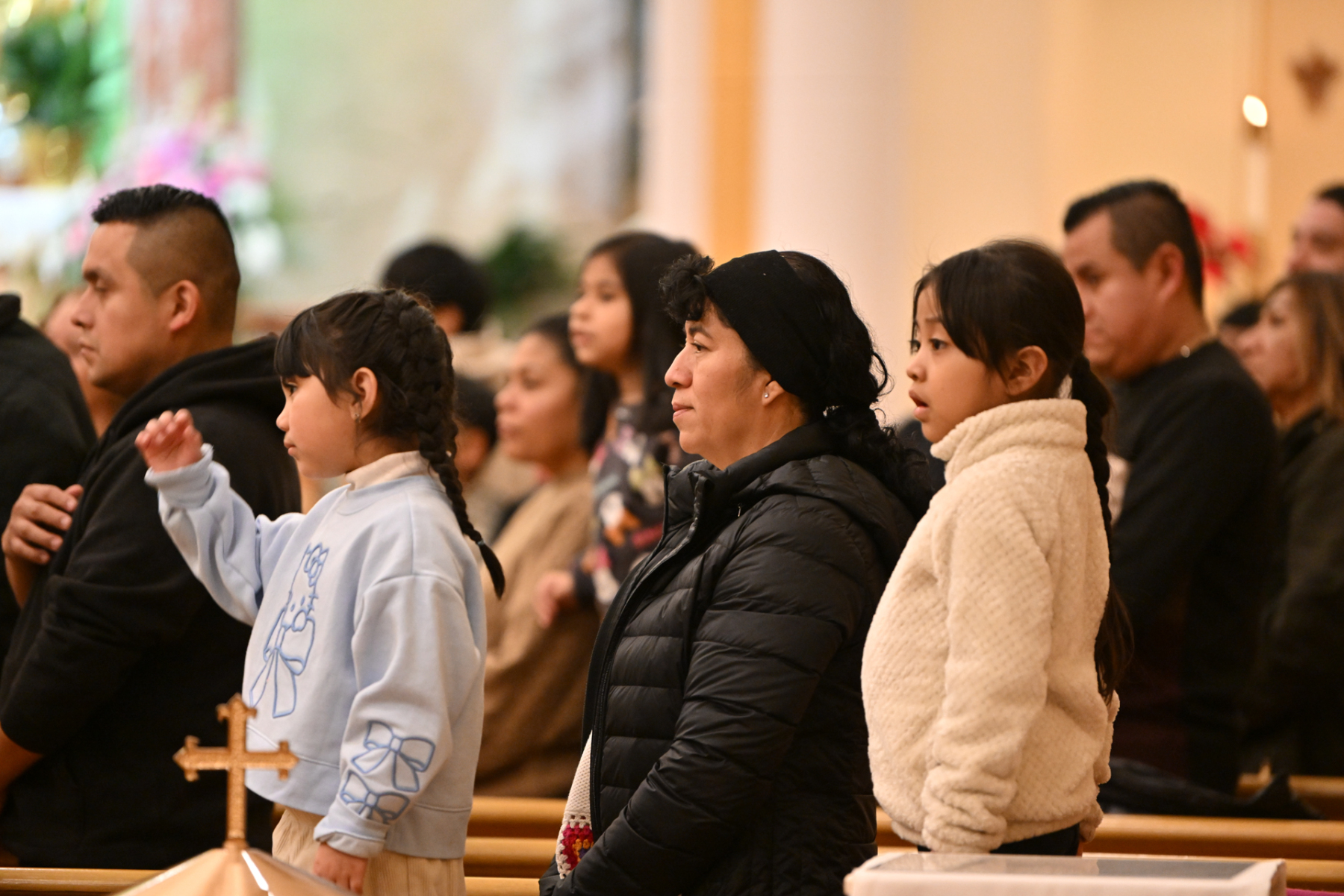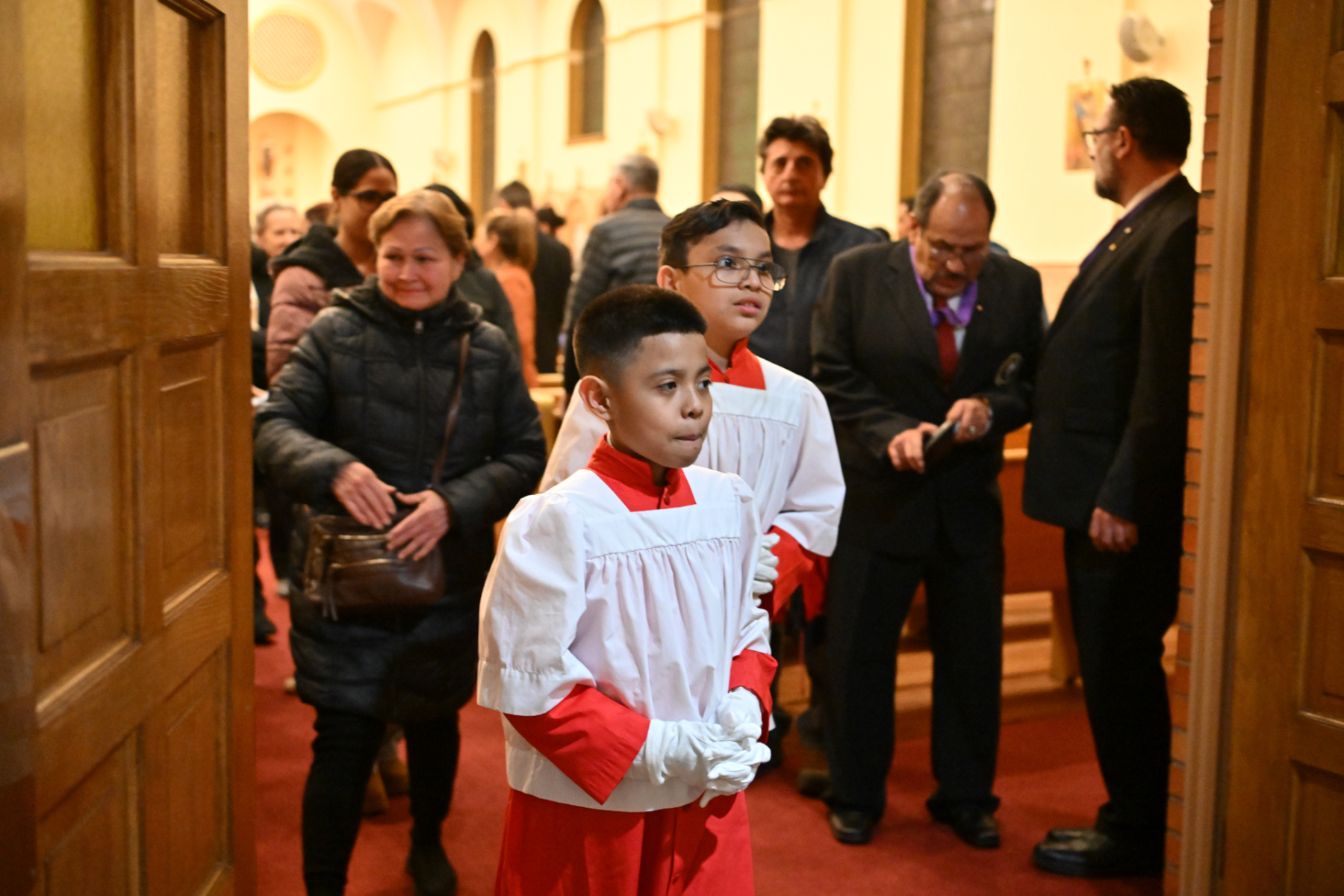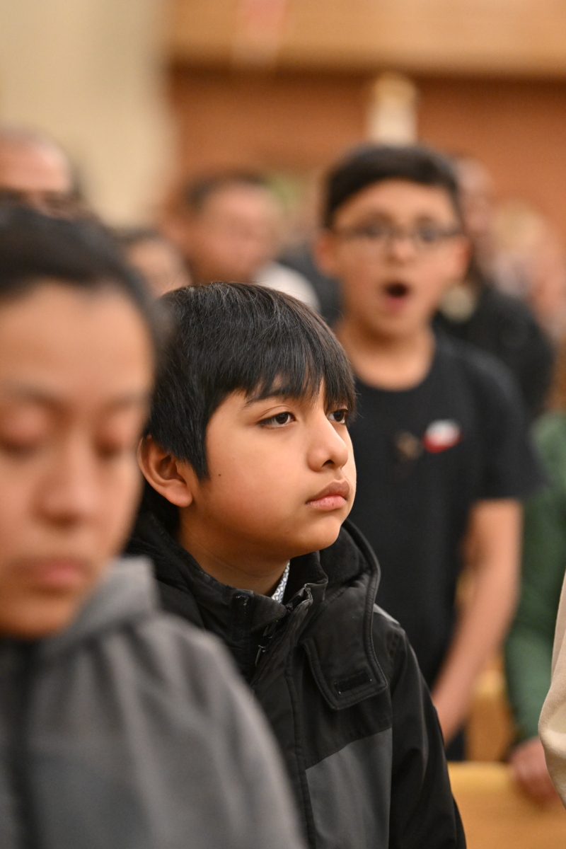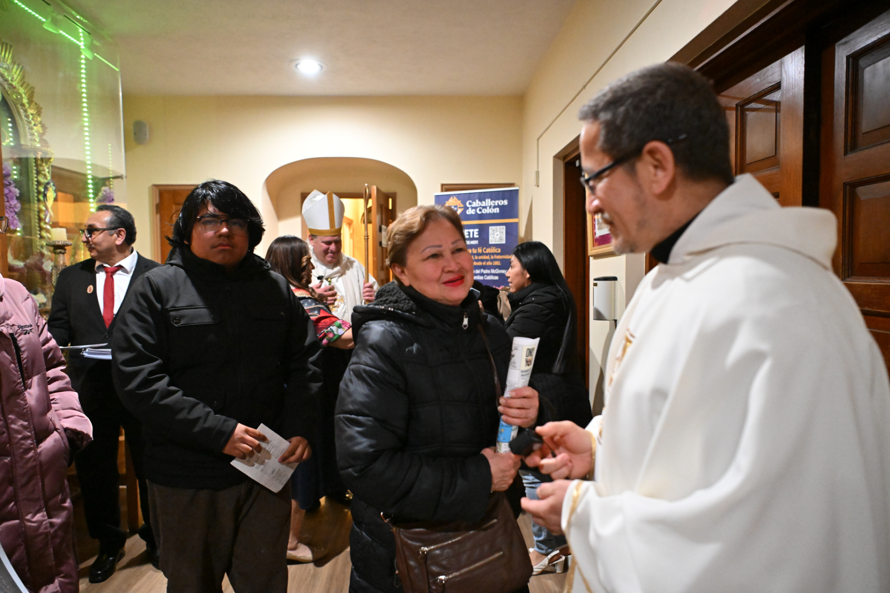 Some churchgoers wore ethnic clothing. The Knights of Columbus and members of the group Señor de los Milagros, or “Lord of the Miracles,” a devotion from Peru, participated in the Mass.