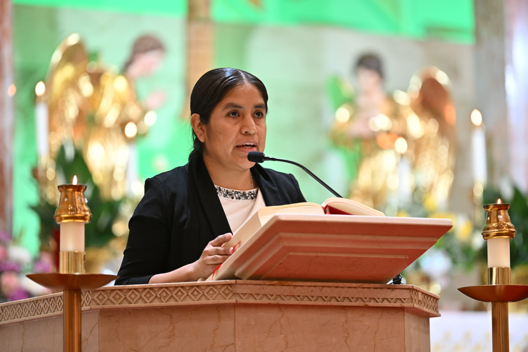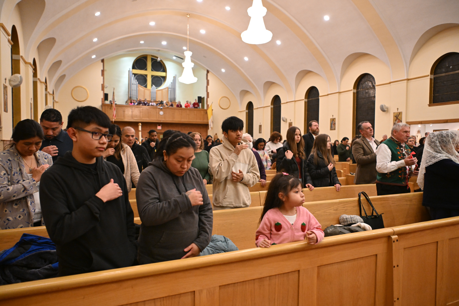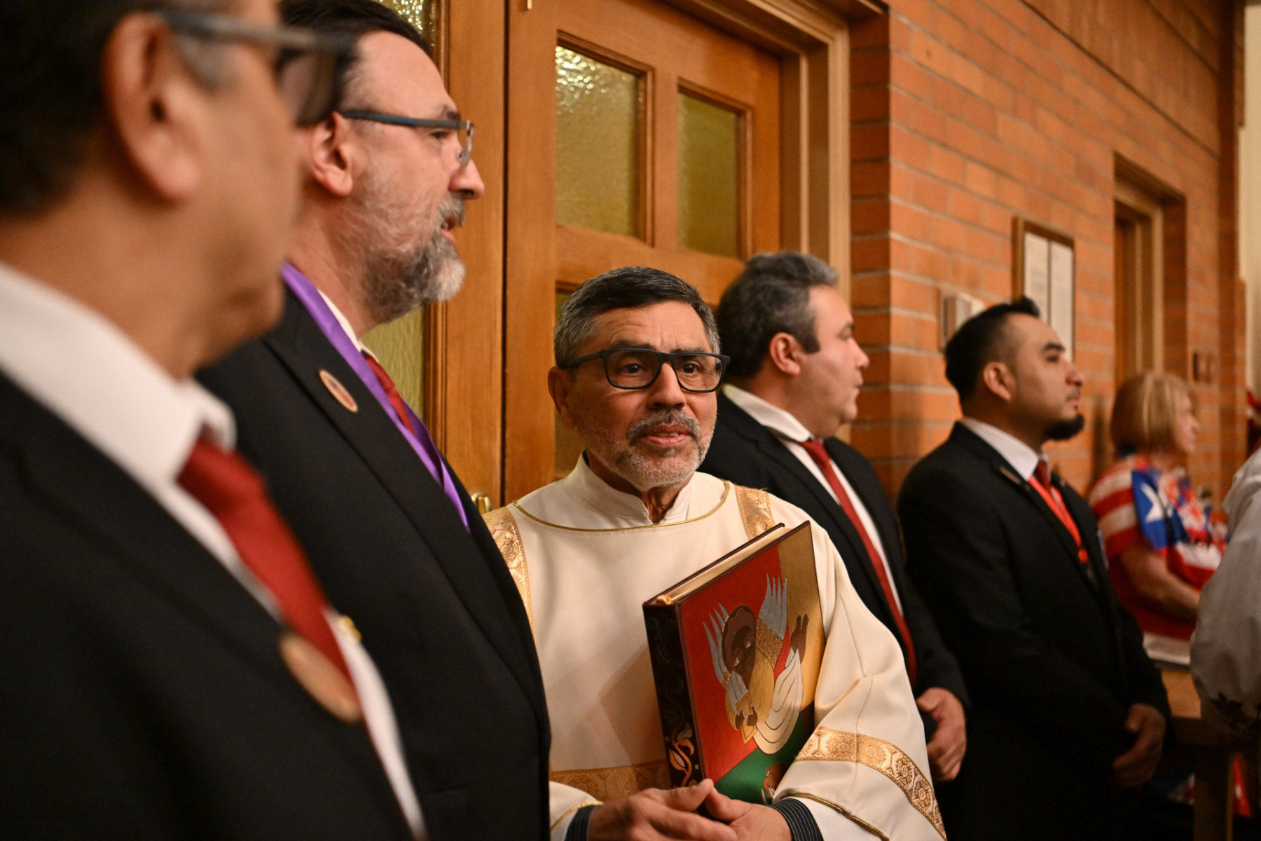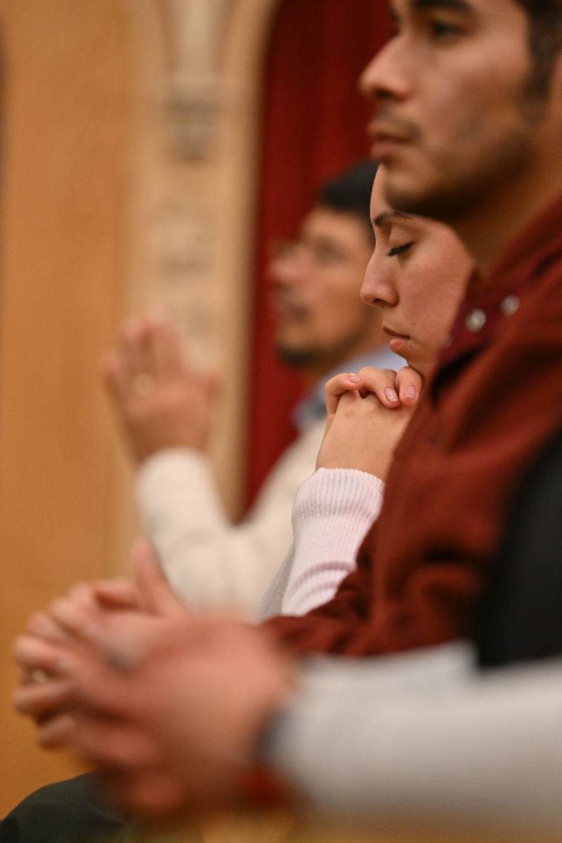 Some churchgoers wore ethnic clothing. The Knights of Columbus and members of the group Señor de los Milagros, or “Lord of the Miracles,” a devotion from Peru, participated in the Mass.