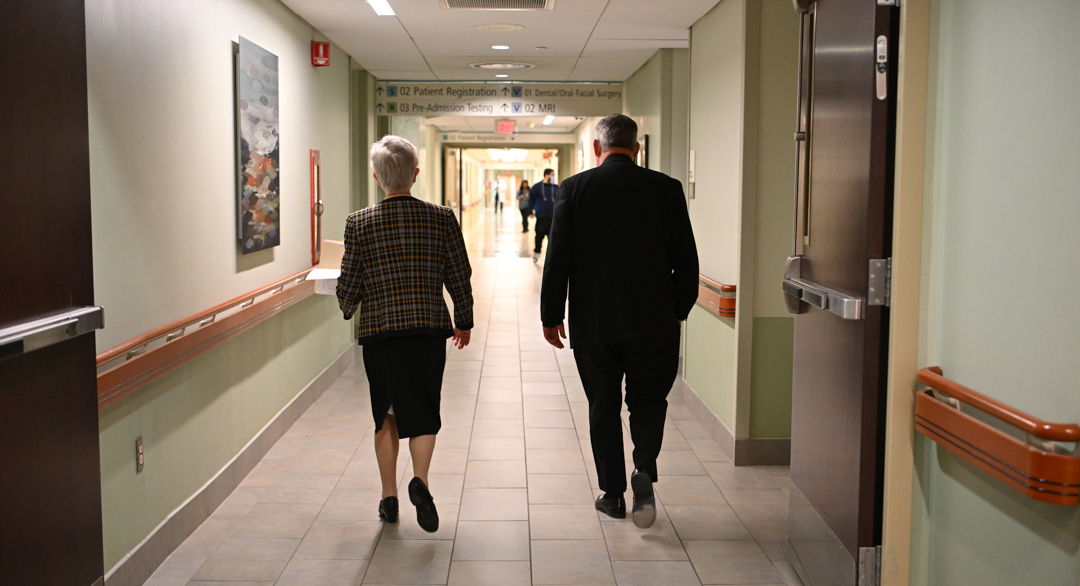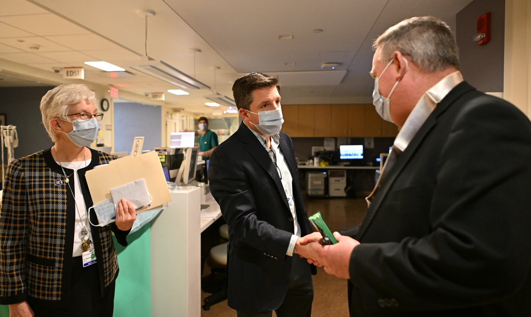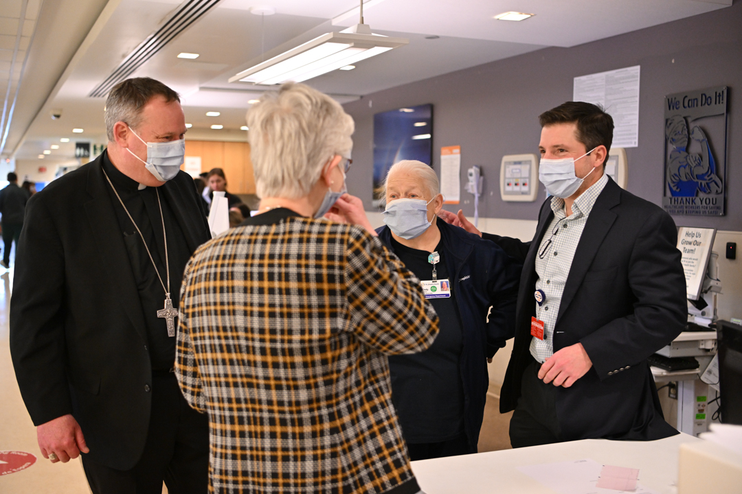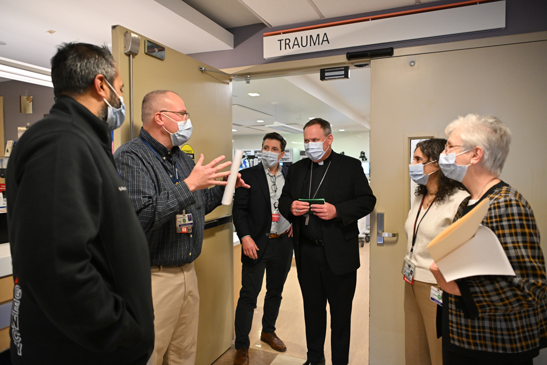 Dr. Dustin Riccio, president and CEO of St. Joseph’s Health; Sister of Charity Patricia Mennor, vice president of mission of St. Joseph’s Health; and Deacon Lawrence Duffy, pastoral care director, led Bishop Sweeney around the hospital.