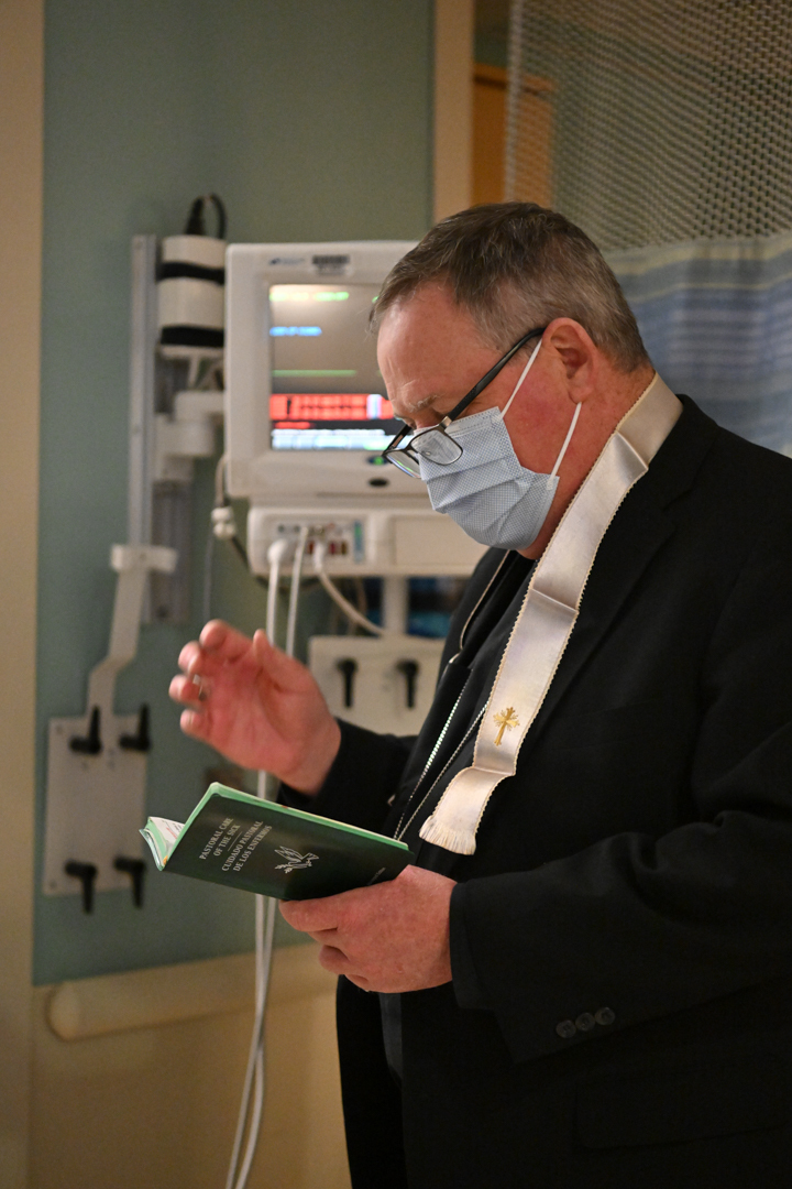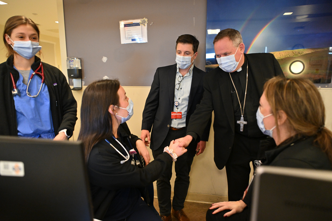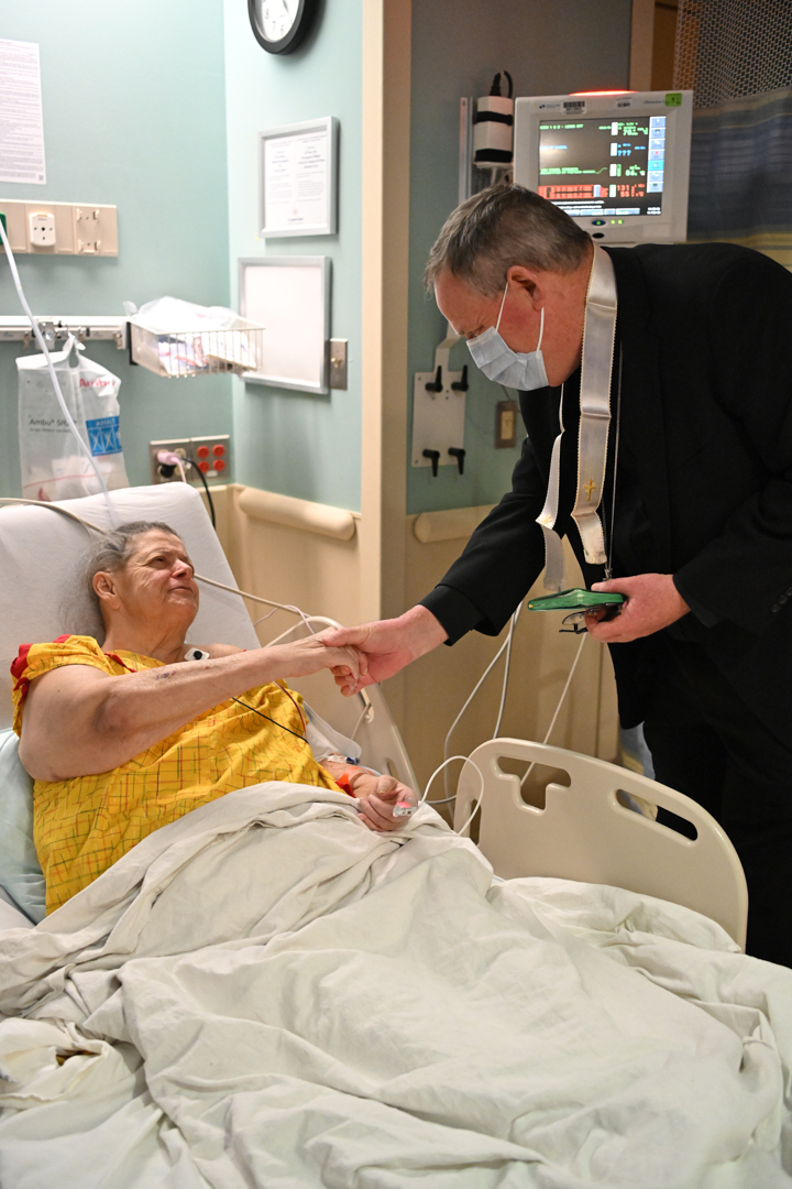 Bishop Sweeney visited Catholic patients in their rooms, talking and praying in English or Spanish. He also gave them blessings and, in some instances, the sacrament of Anointing of the Sick. The bishop also visited some patients, doctors, nurses, and other hospital emergency department staff.