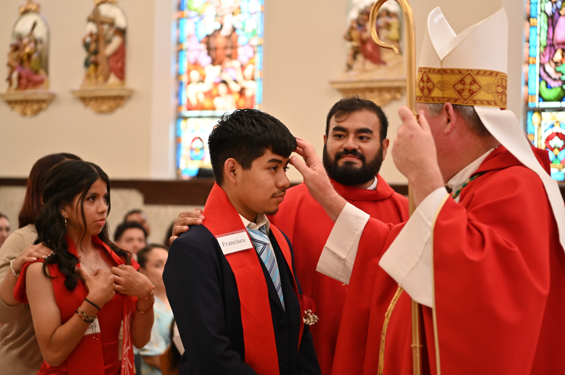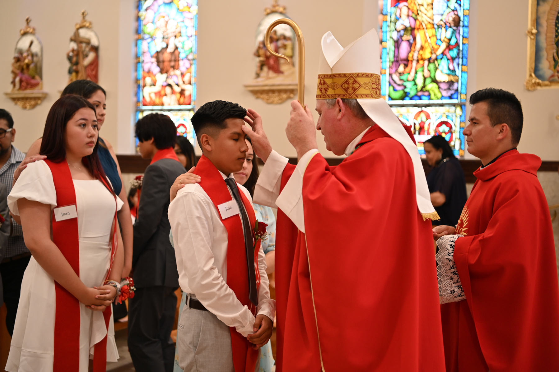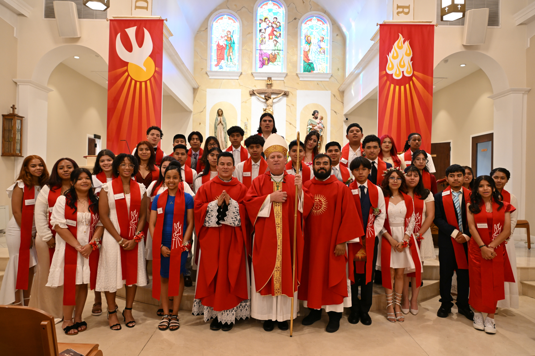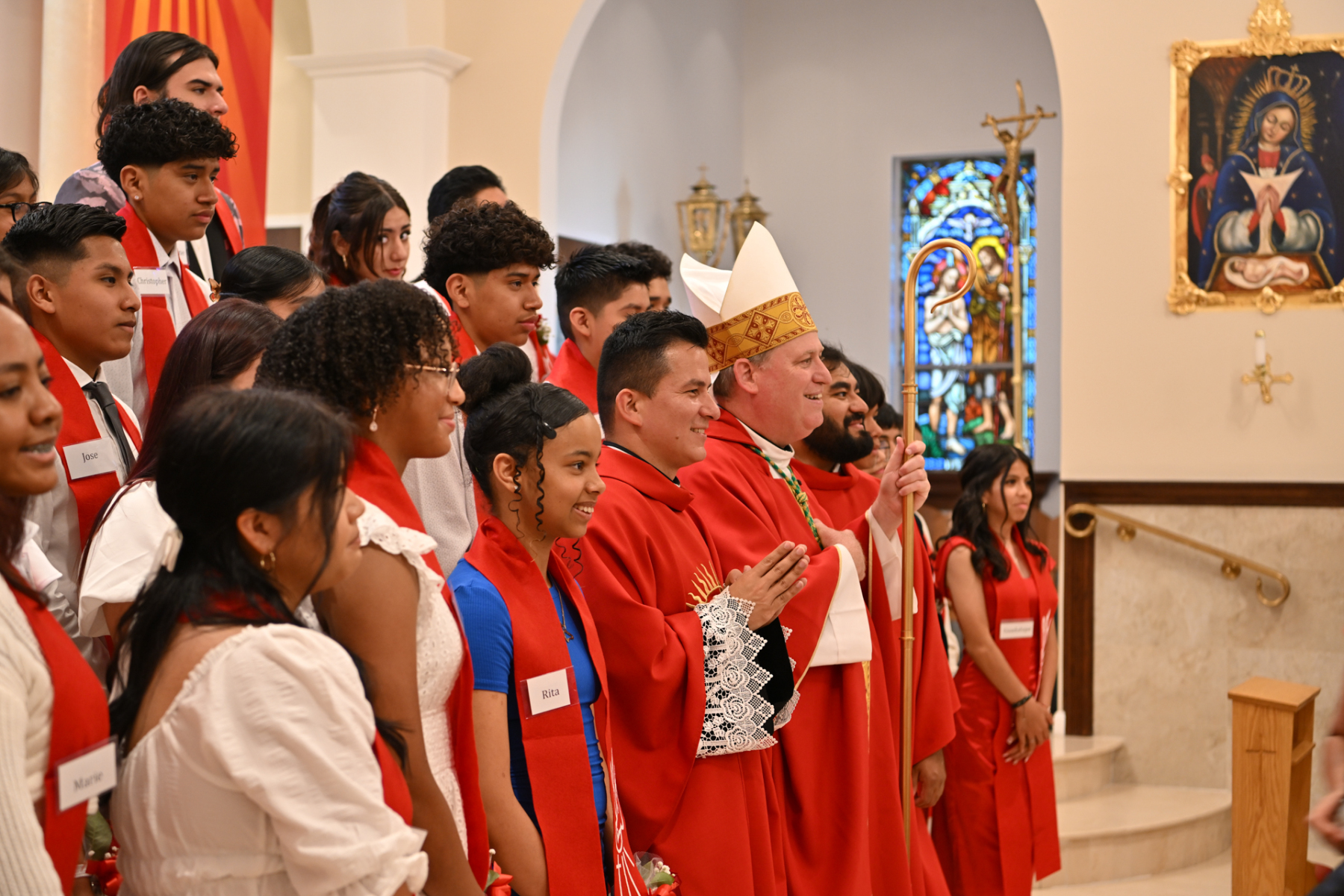 St. Anthony of Padua Parish in Passaic on June 22 welcomed Bishop Kevin J. Sweeney, who celebrated Mass. There, he administered the sacrament of confirmation to 32 parish youth, bringing them into full communion with the Church. Father Javier Bareno, St. Anthony’s pastor, and Father Jose Zuniga, parochial vicar, concelebrated the Mass with Bishop Sweeney.