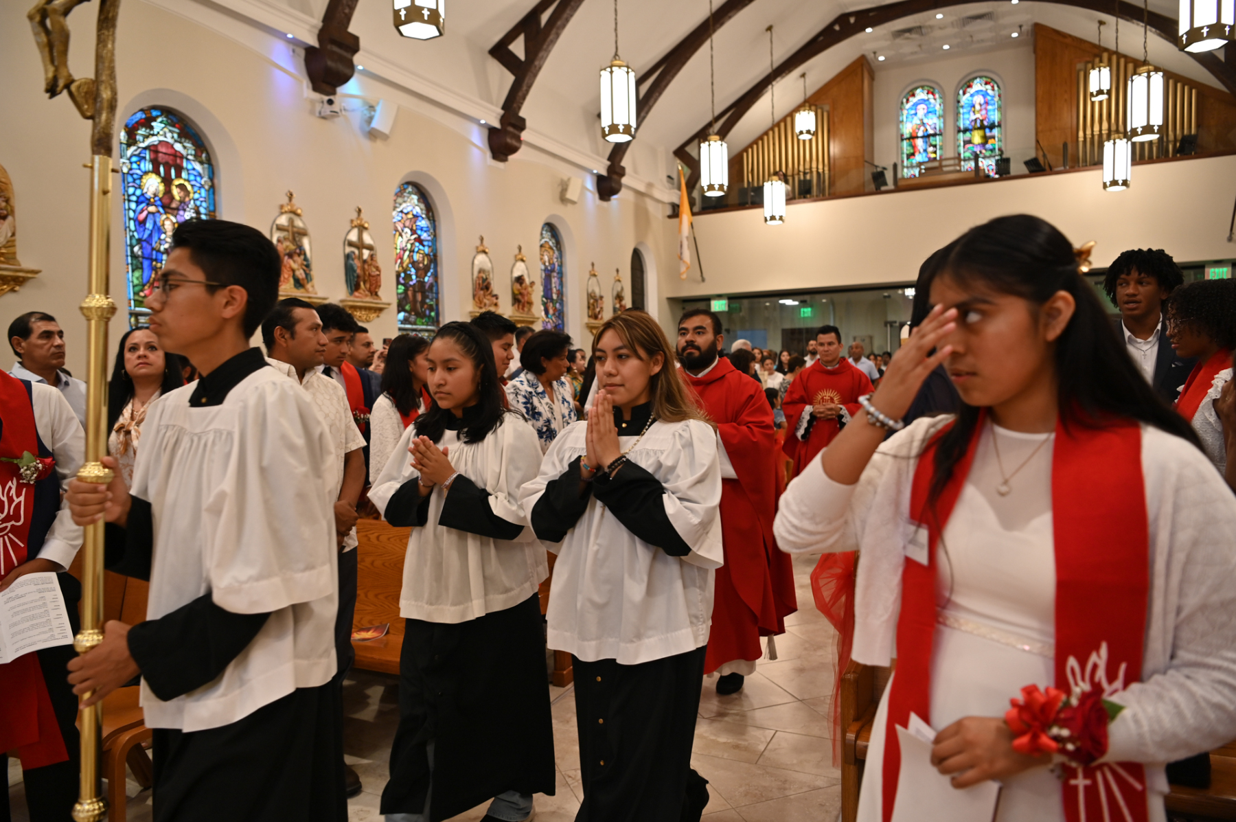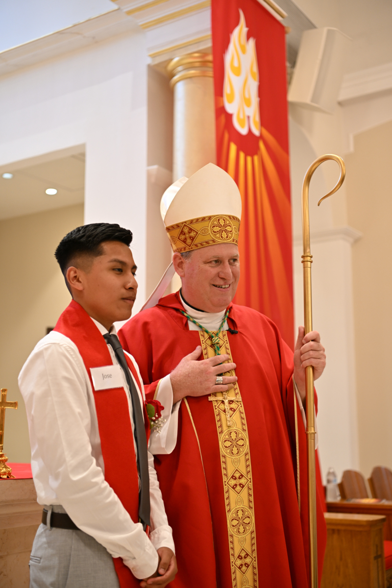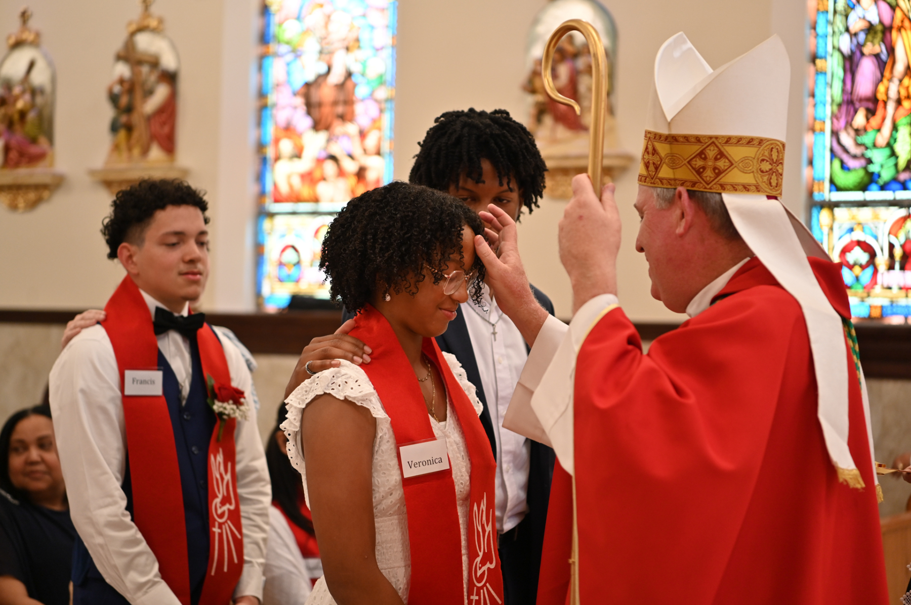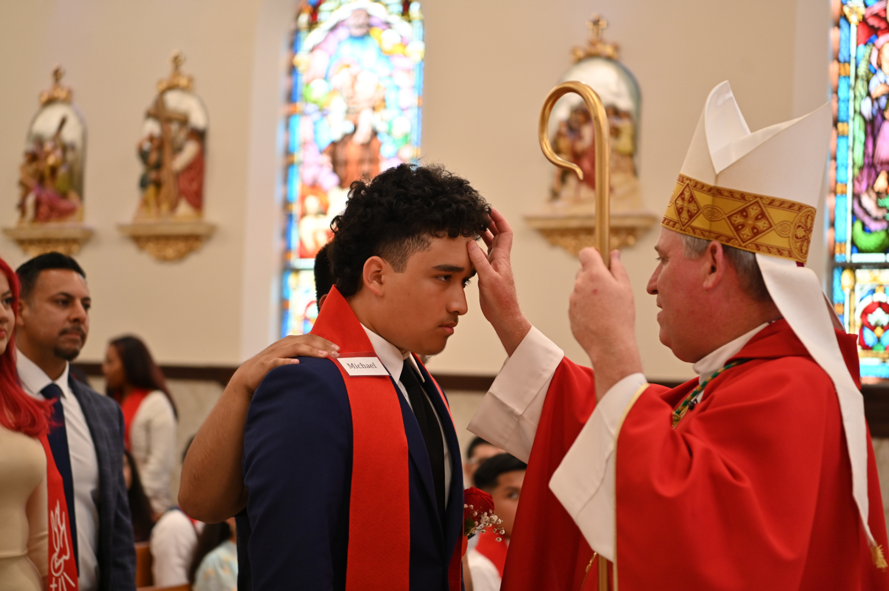 St. Anthony of Padua Parish in Passaic on June 22 welcomed Bishop Kevin J. Sweeney, who celebrated Mass. There, he administered the sacrament of confirmation to 32 parish youth, bringing them into full communion with the Church. Father Javier Bareno, St. Anthony’s pastor, and Father Jose Zuniga, parochial vicar, concelebrated the Mass with Bishop Sweeney.