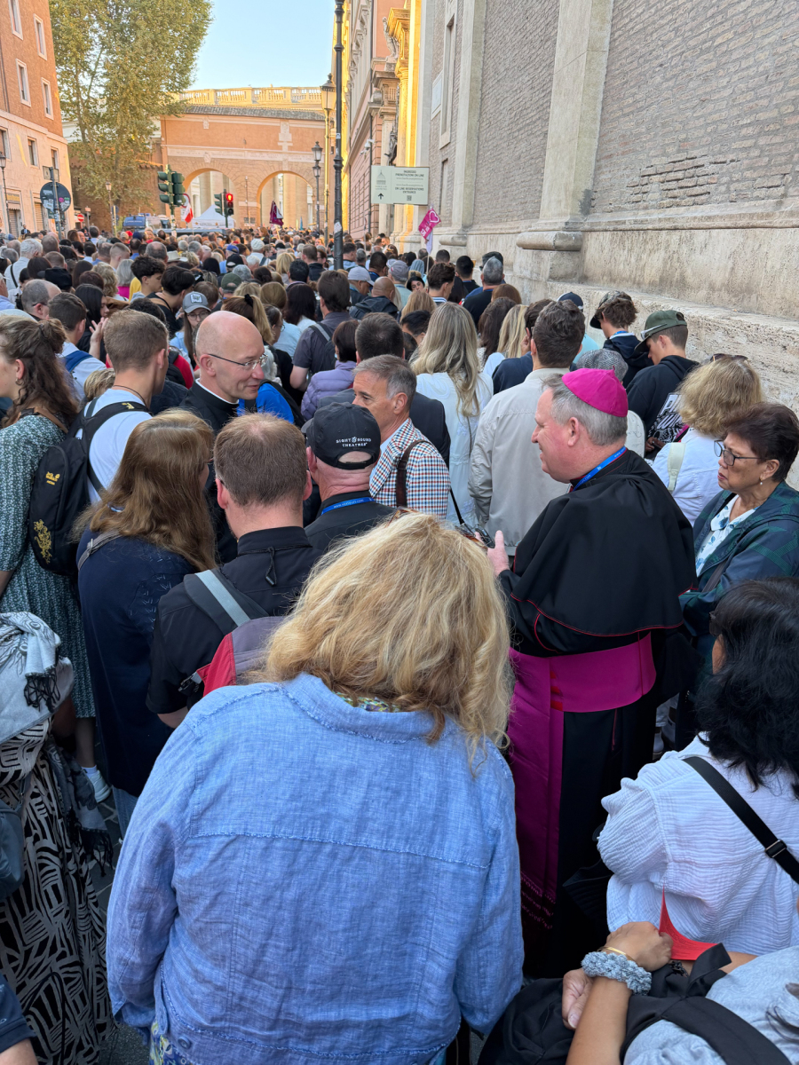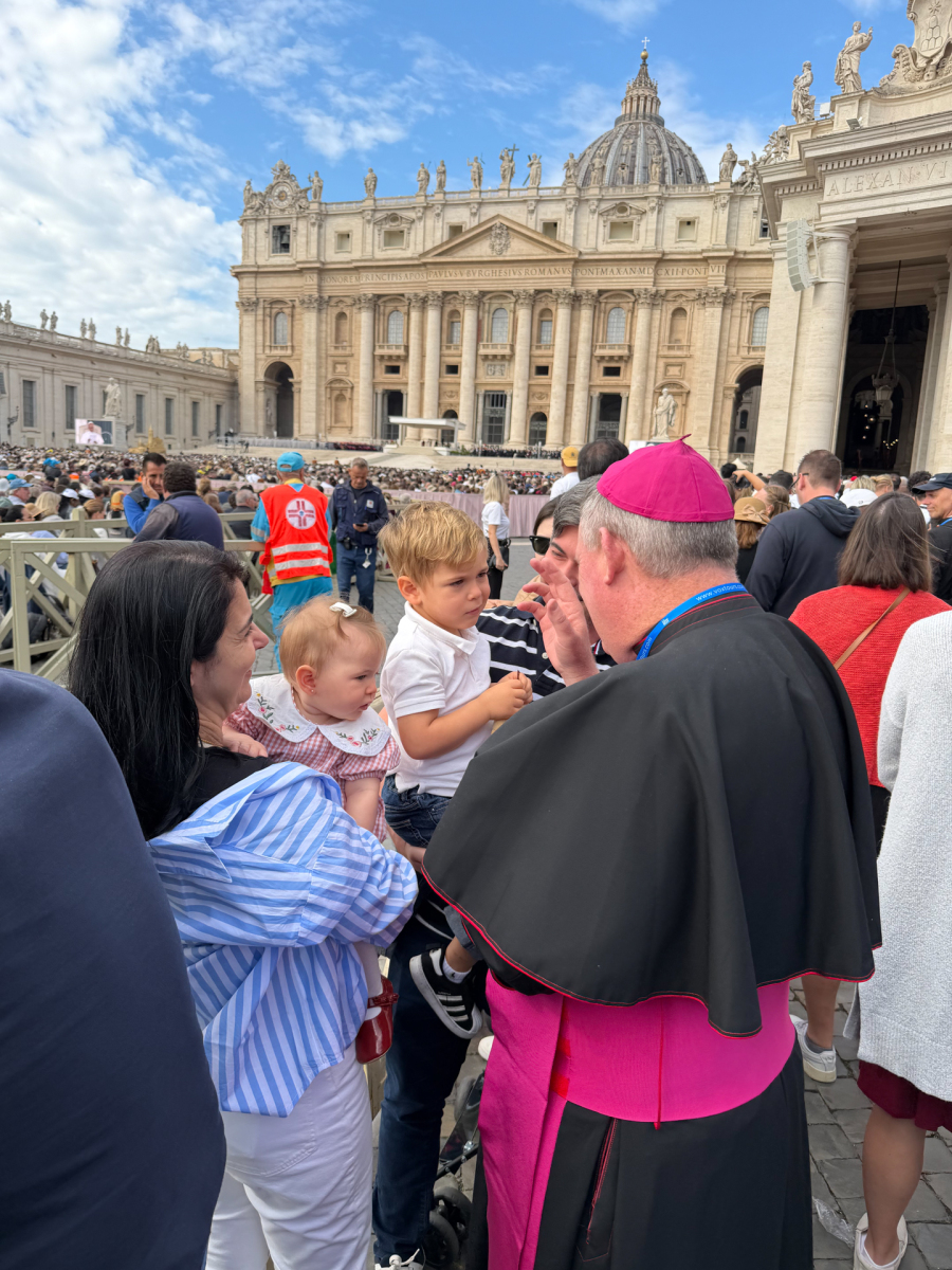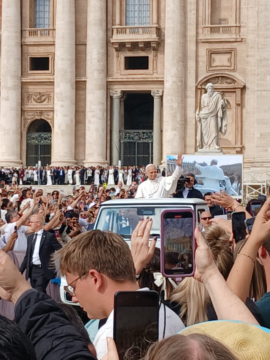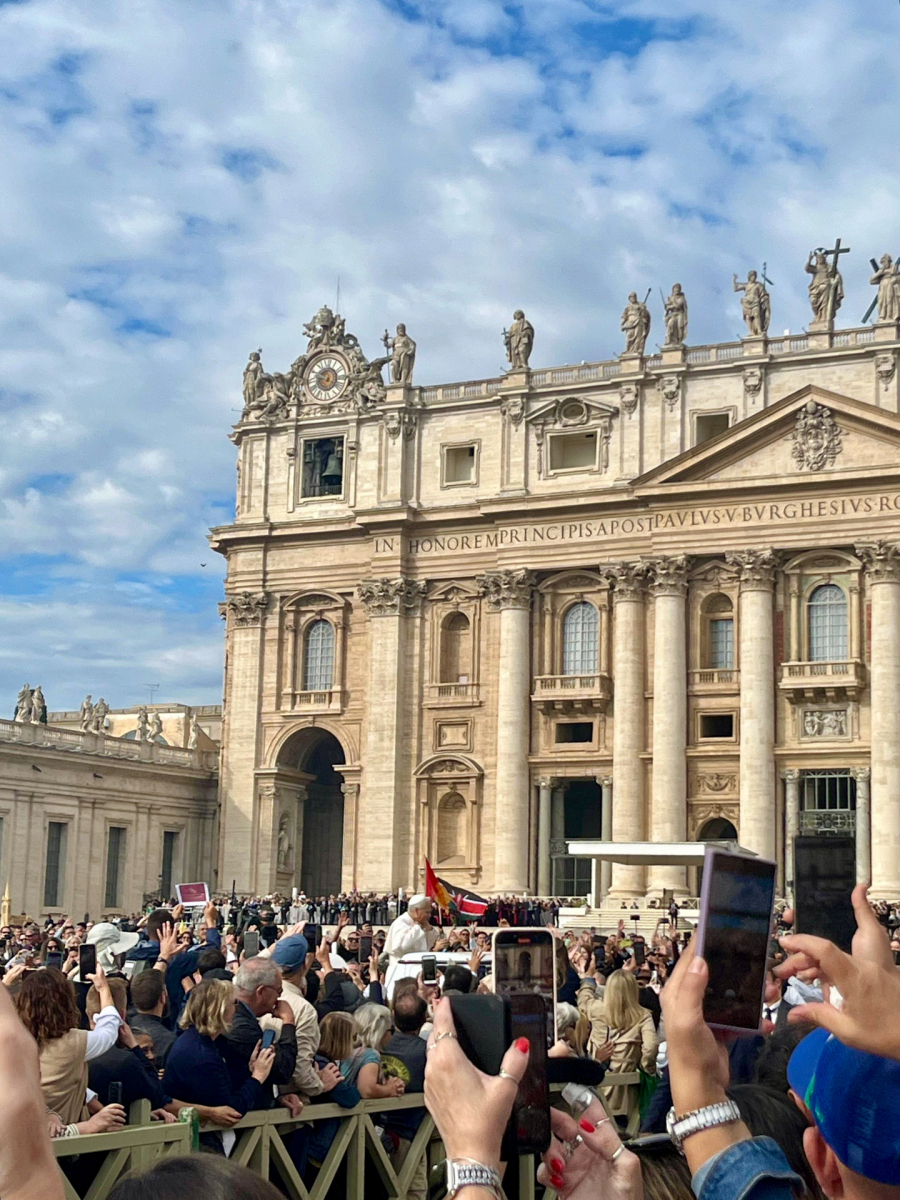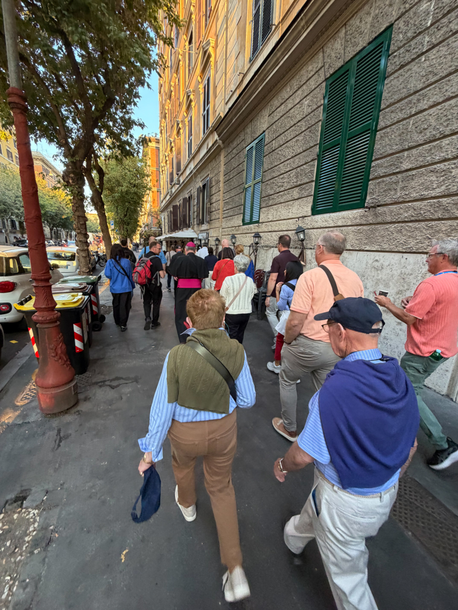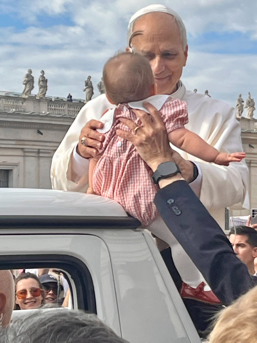 Day 5 of our Pilgrimage, on Oct. 1, the Feast of St. Therese, the Little Flower, we had another beautiful morning as we made our way to St. Peter’s Square for the Pope’s Wednesday General Audience. Our guide helped us find a good spot — next to the rail and NEXT to a BABY! So, as you will see, we were able to get very close to Pope Leo!