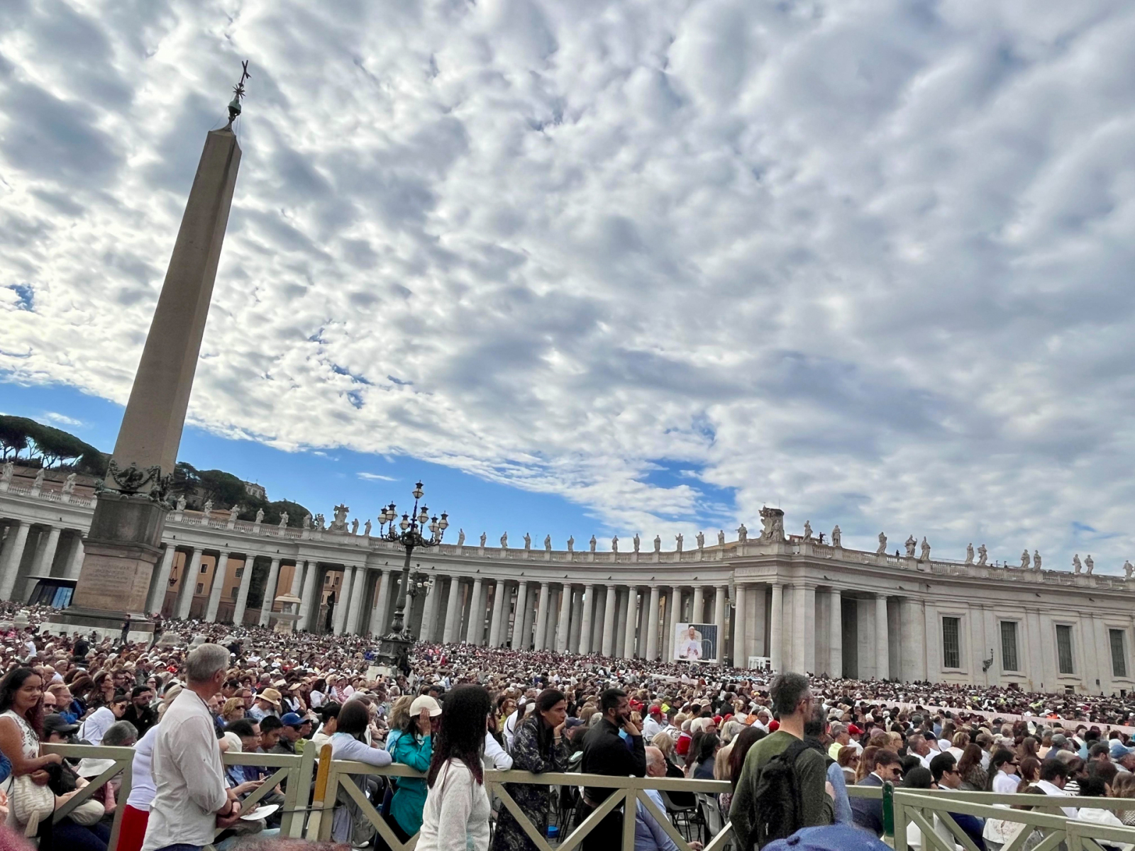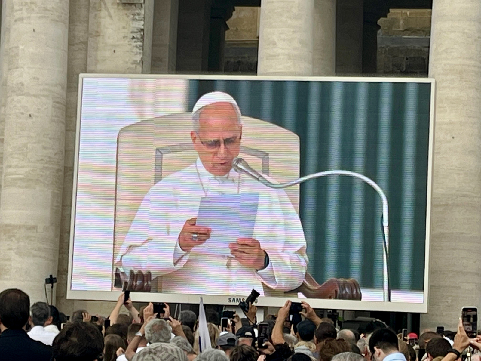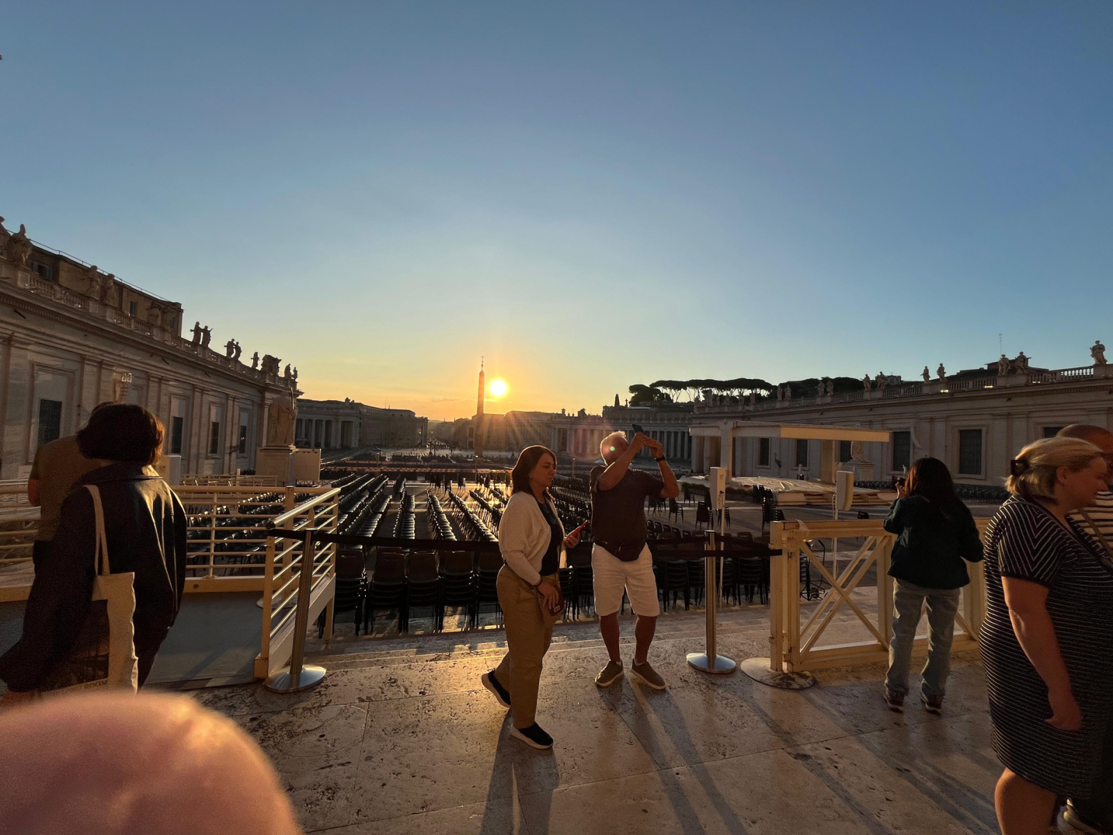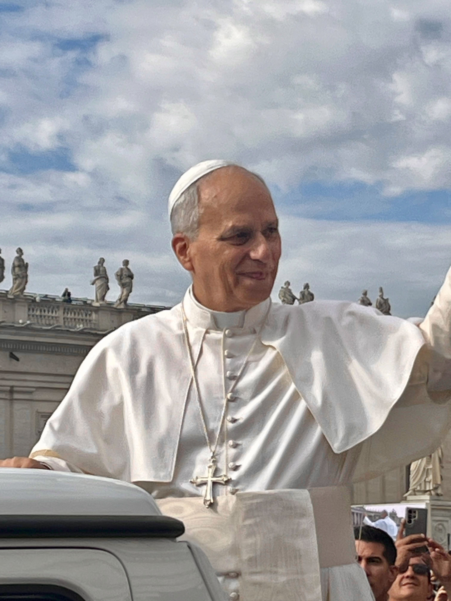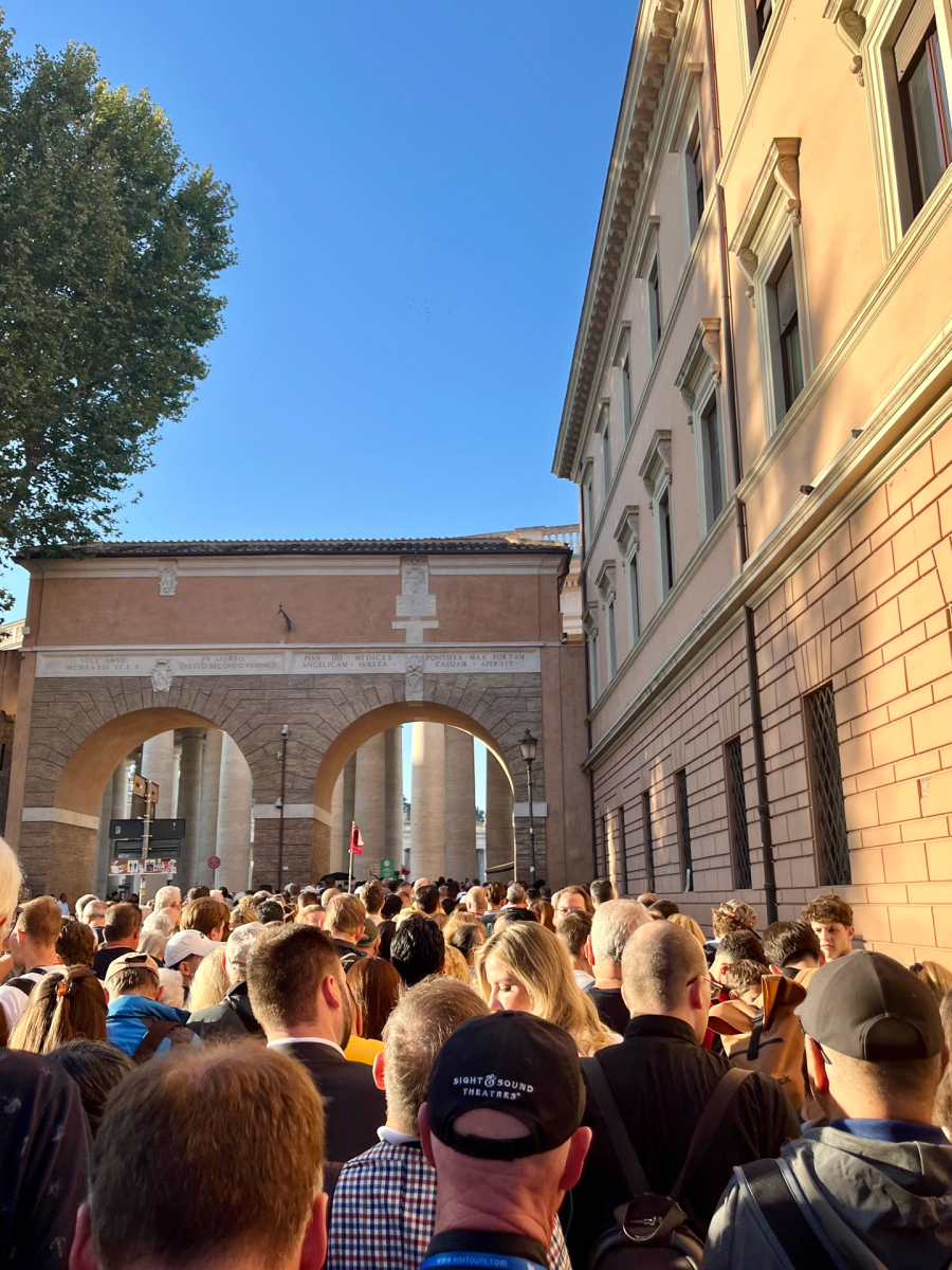 Day 5 of our Pilgrimage, on Oct. 1, the Feast of St. Therese, the Little Flower, we had another beautiful morning as we made our way to St. Peter’s Square for the Pope’s Wednesday General Audience. Our guide helped us find a good spot — next to the rail and NEXT to a BABY! So, as you will see, we were able to get very close to Pope Leo!