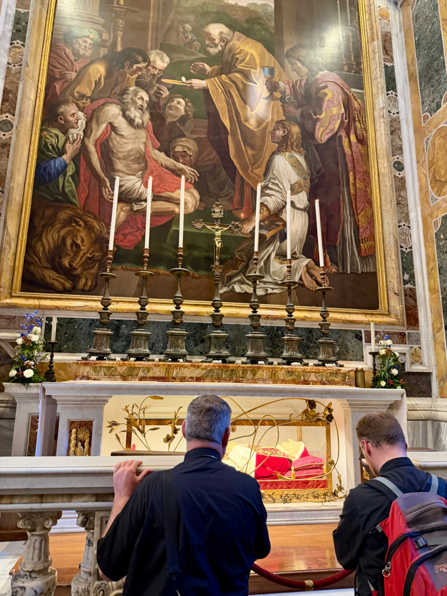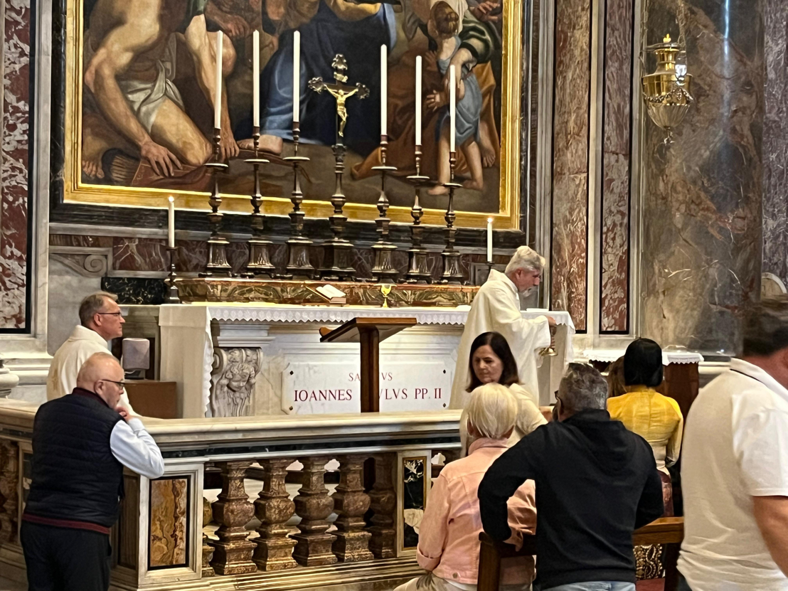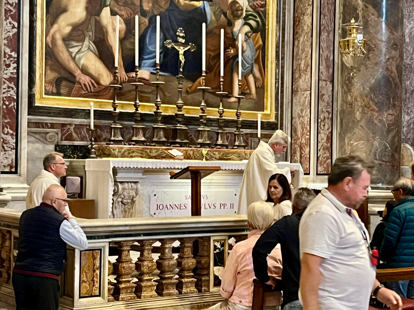Another Beautiful Morning as we begin Day 4, the Feast of St. Jerome. We had an early start and walked to St. Peter’s Basilica, where we had the privilege of celebrating Mass at the Altar of St. Columba in the “Irish Chapel.” I had not made a special request – it was just a happy coincidence!