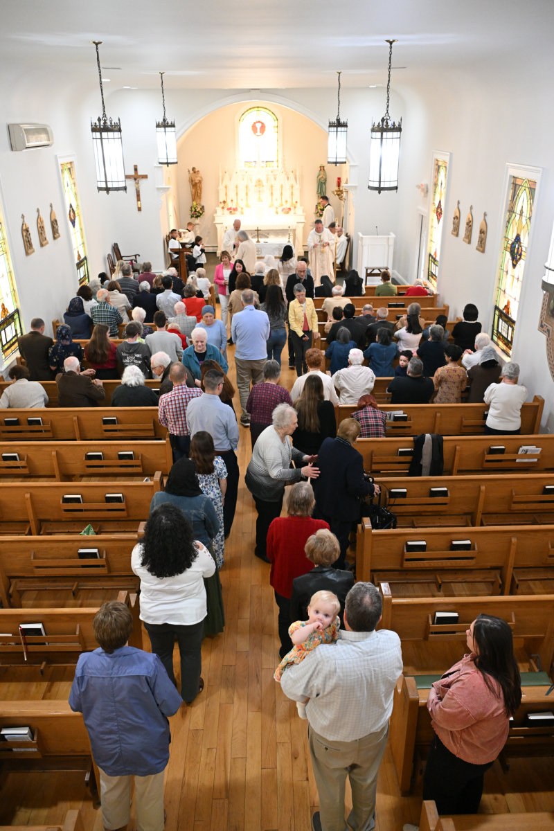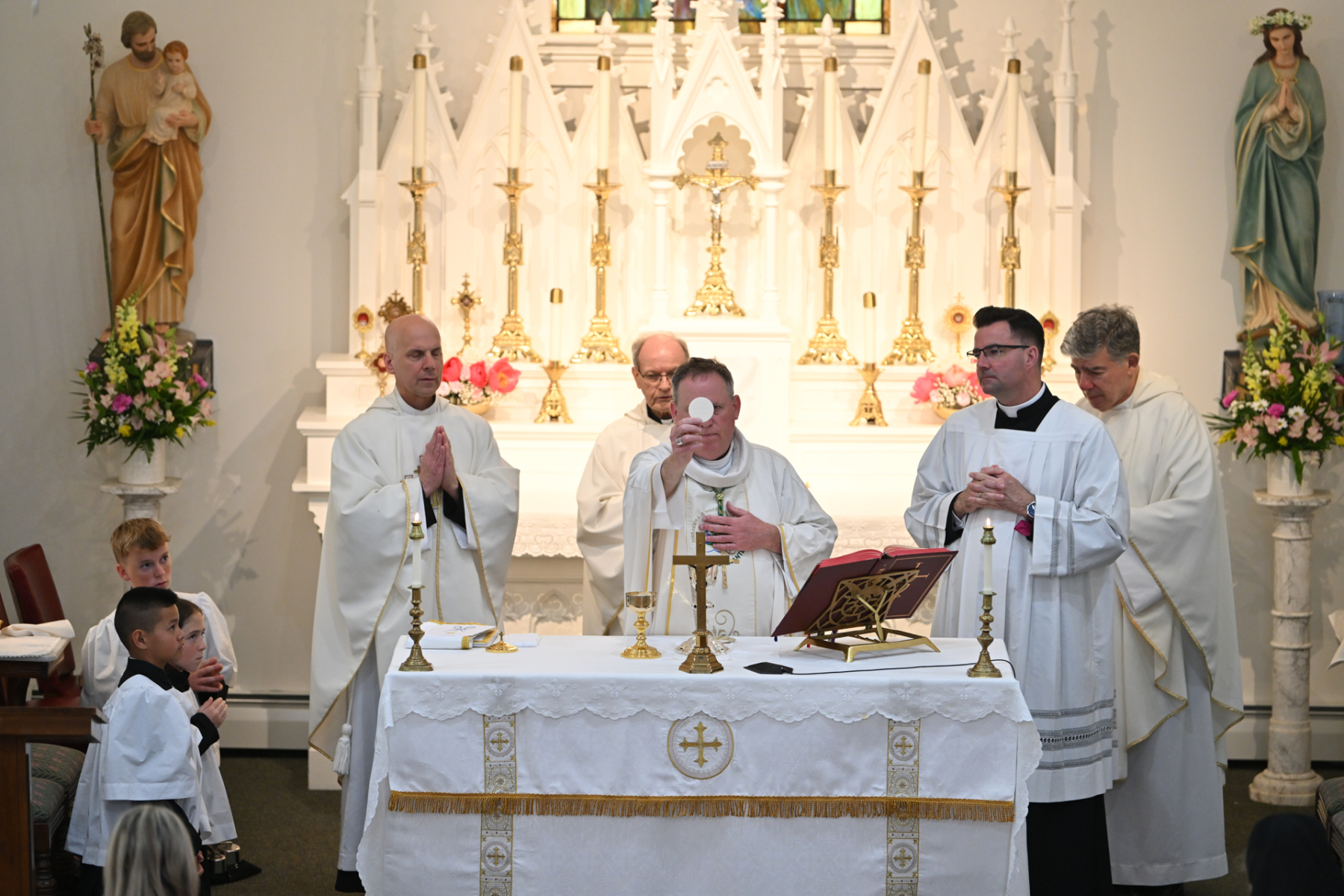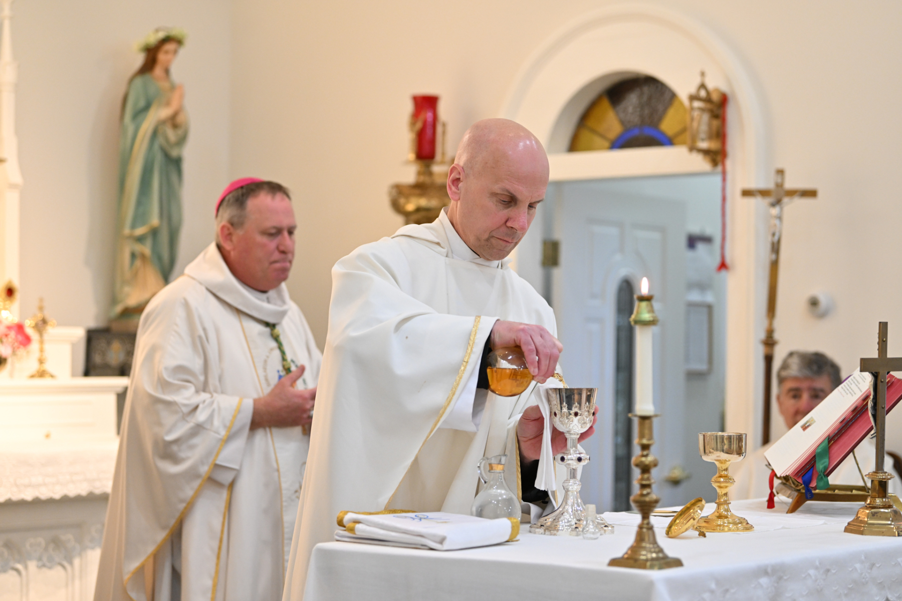 Bishop Sweeney was the main celebrant of the installation Mass. Concelebrating the liturgy were Father Rama, Father Nicholas Bozza, pastor of St. Lawrence the Martyr Parish in Chester, and Father Alfred Lampron, a retired diocesan priest who had served as pastor of St. Bernard’s for 18 years. Father Jared Brogan, diocesan Worship Office director, was the master of ceremonies for the liturgy.