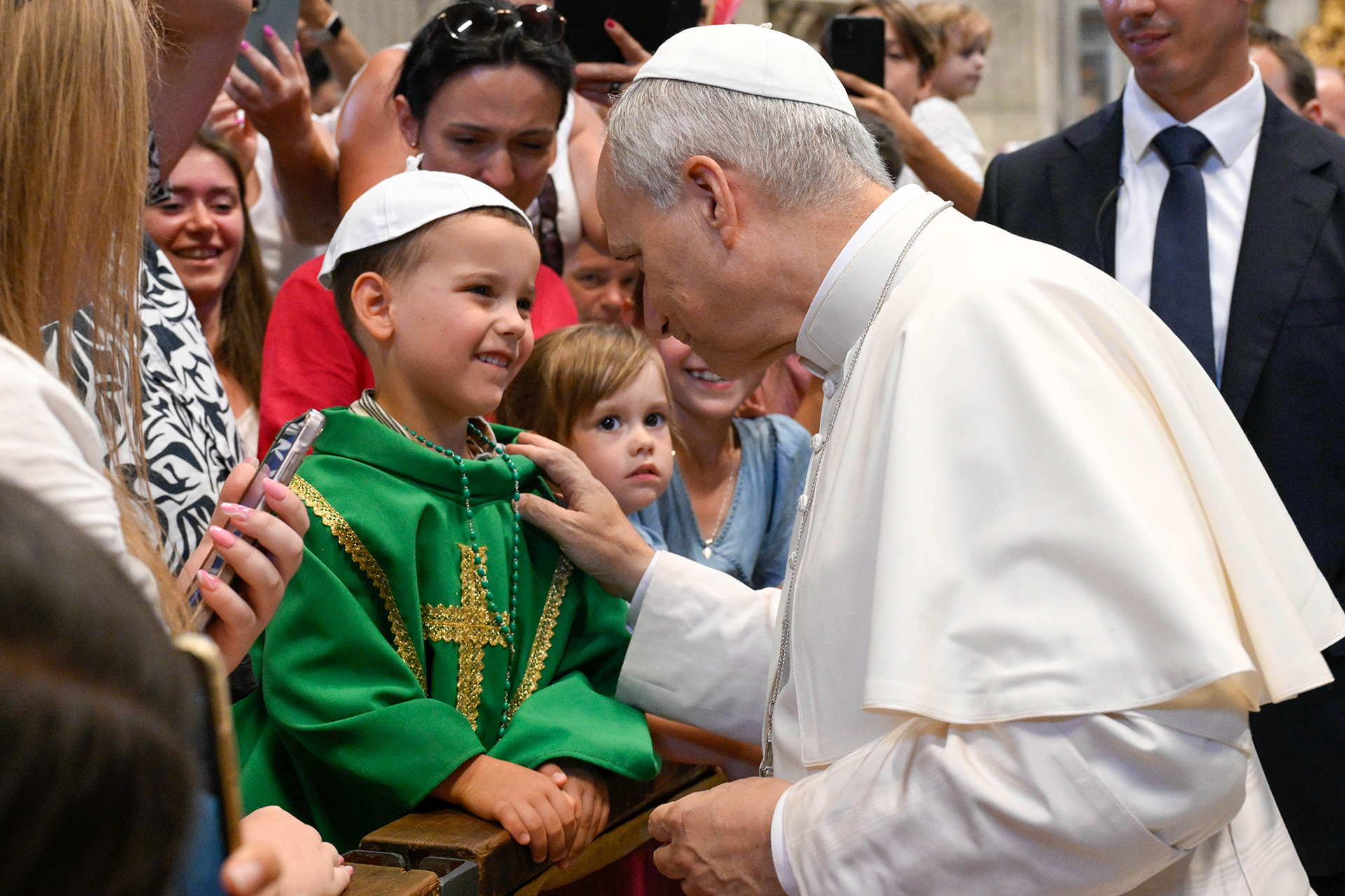 He then headed to St. Peter’s Basilica to greet those who could not fit in the large audience hall and blessed people who were waiting in the parking area outside the hall. Because of the high temperatures outside, the general audience was being held in two parts — in the hall and in the basilica — so people would not have to be under the hot sun.