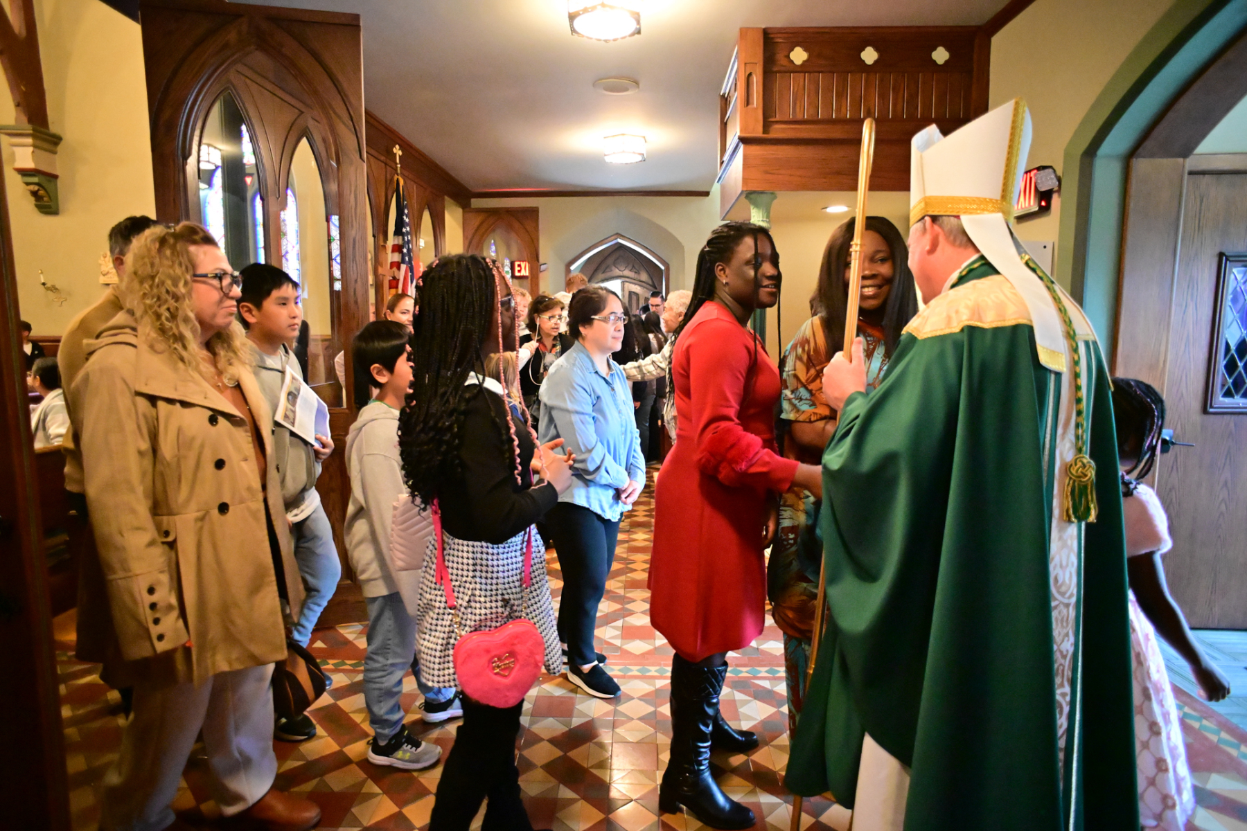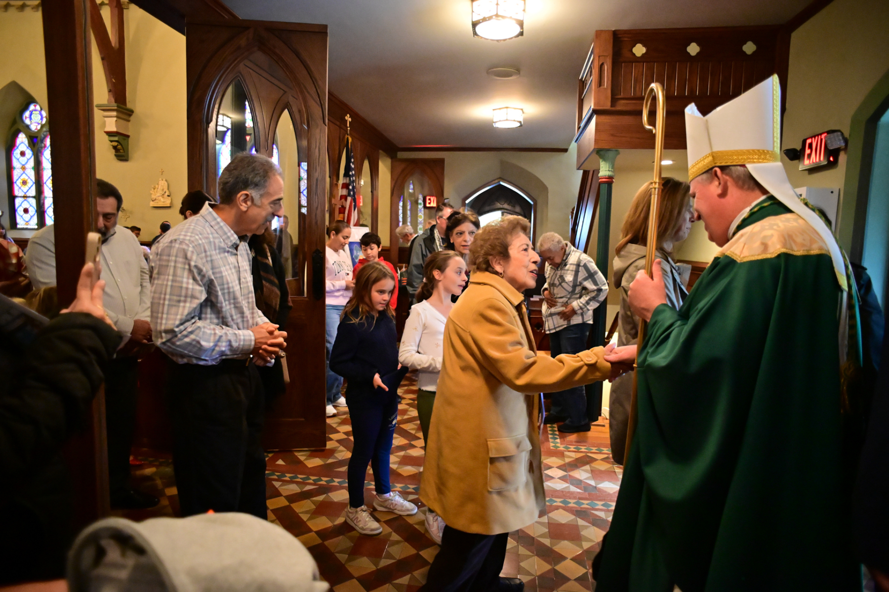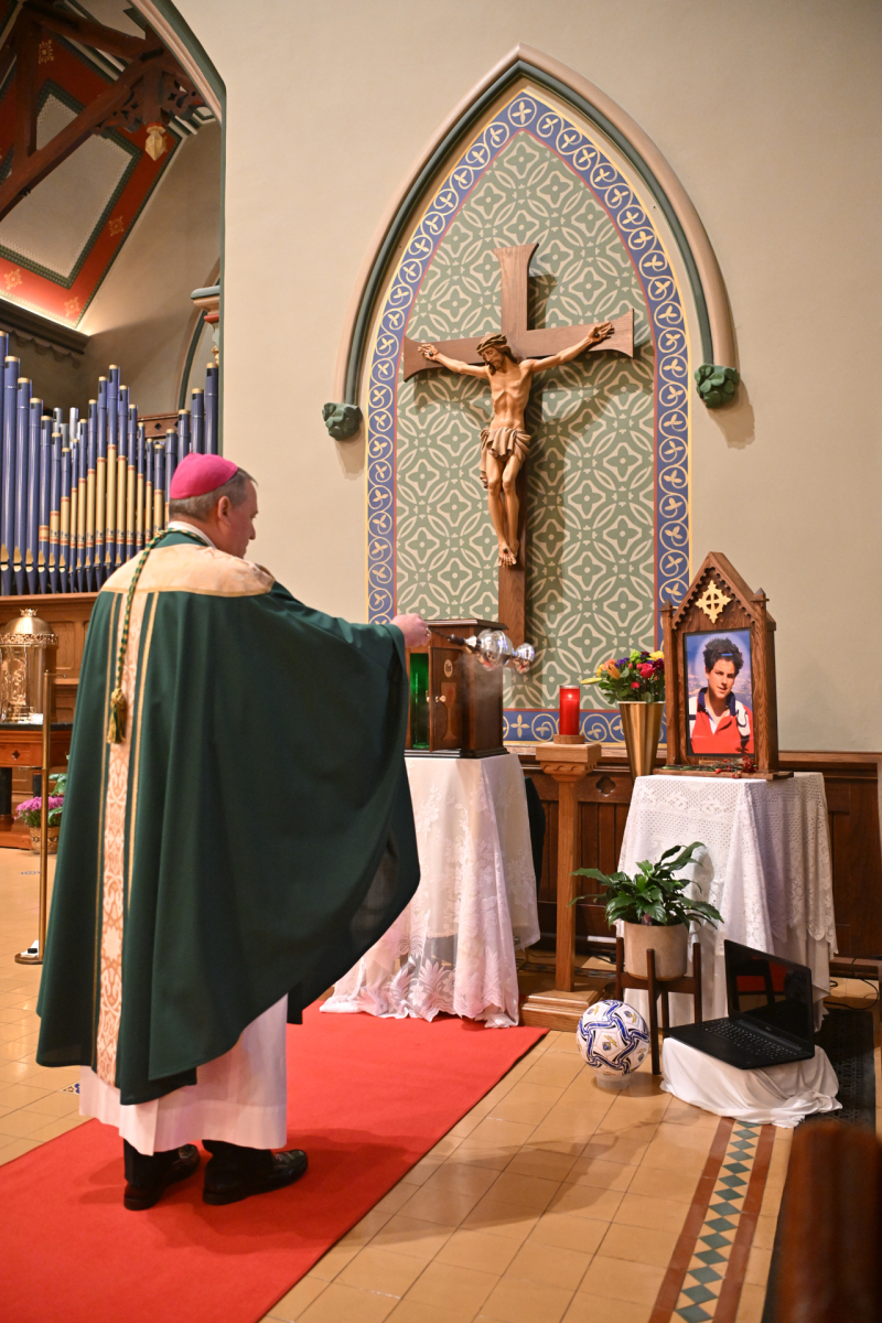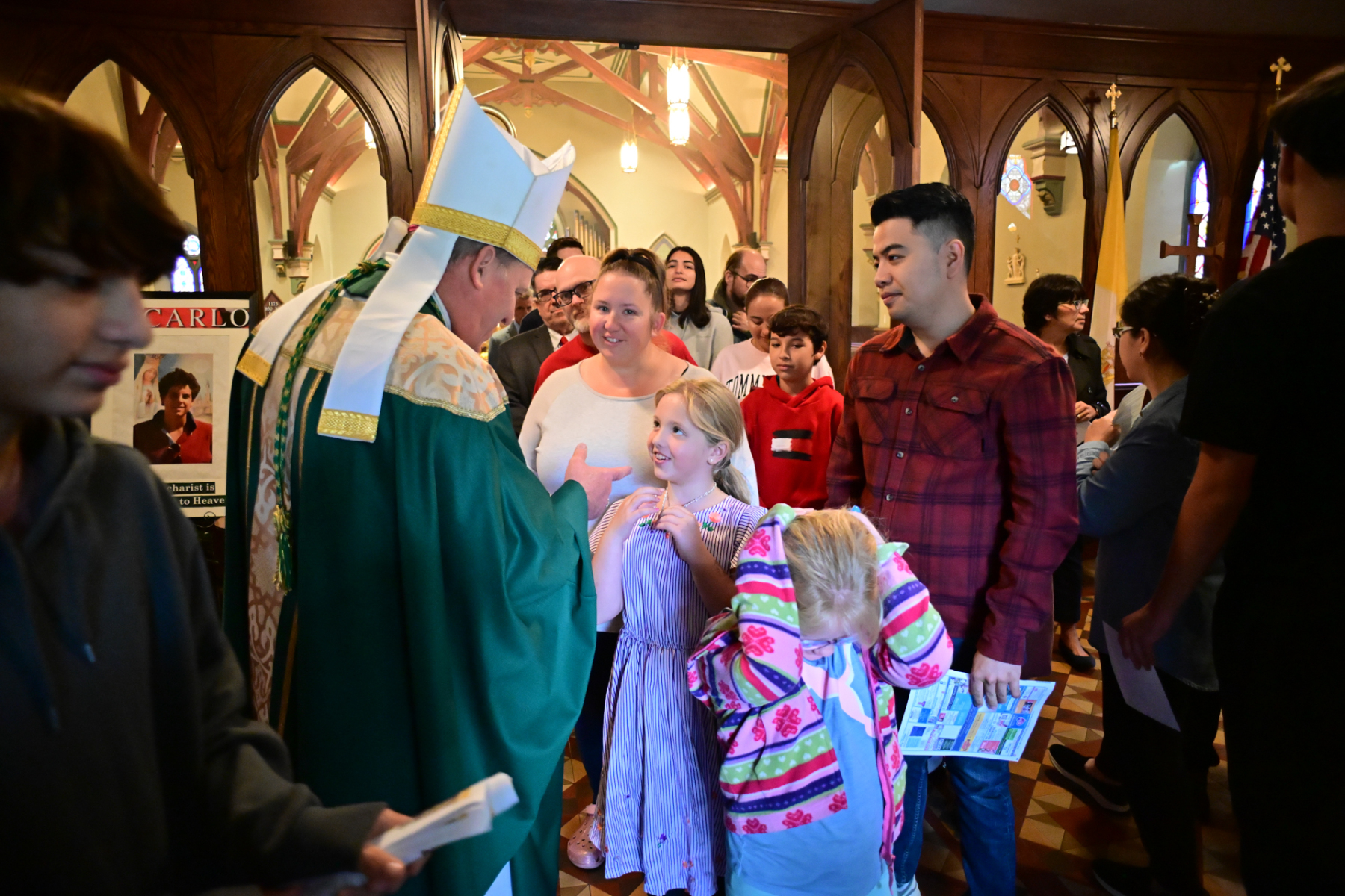 Bishop Kevin J. Sweeney was the main celebrant and homilist of the Mass, which Father Lemmuel Camacho, pastor of St. Mary’s, concelebrated. The parish’s devotion to St. Carlo, one of its patron saints, included the creation of a special place in the church for the faithful to venerate the saint, who was devoted to Jesus’ Real Presence in the Eucharist. The space features a first-class relic of St. Carlo, his portrait, candles, and flowers.