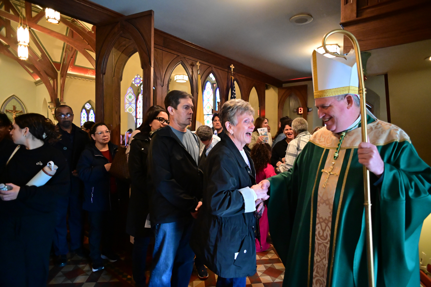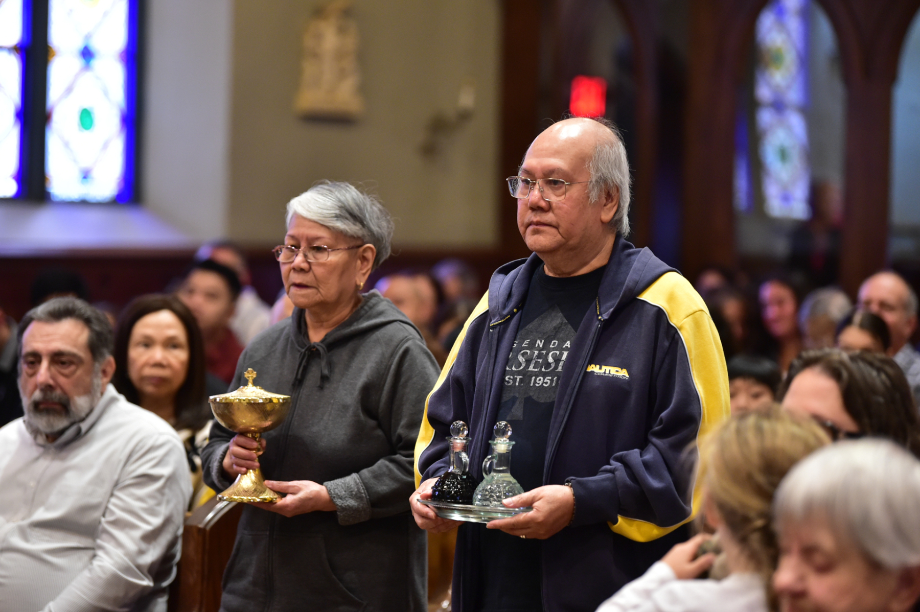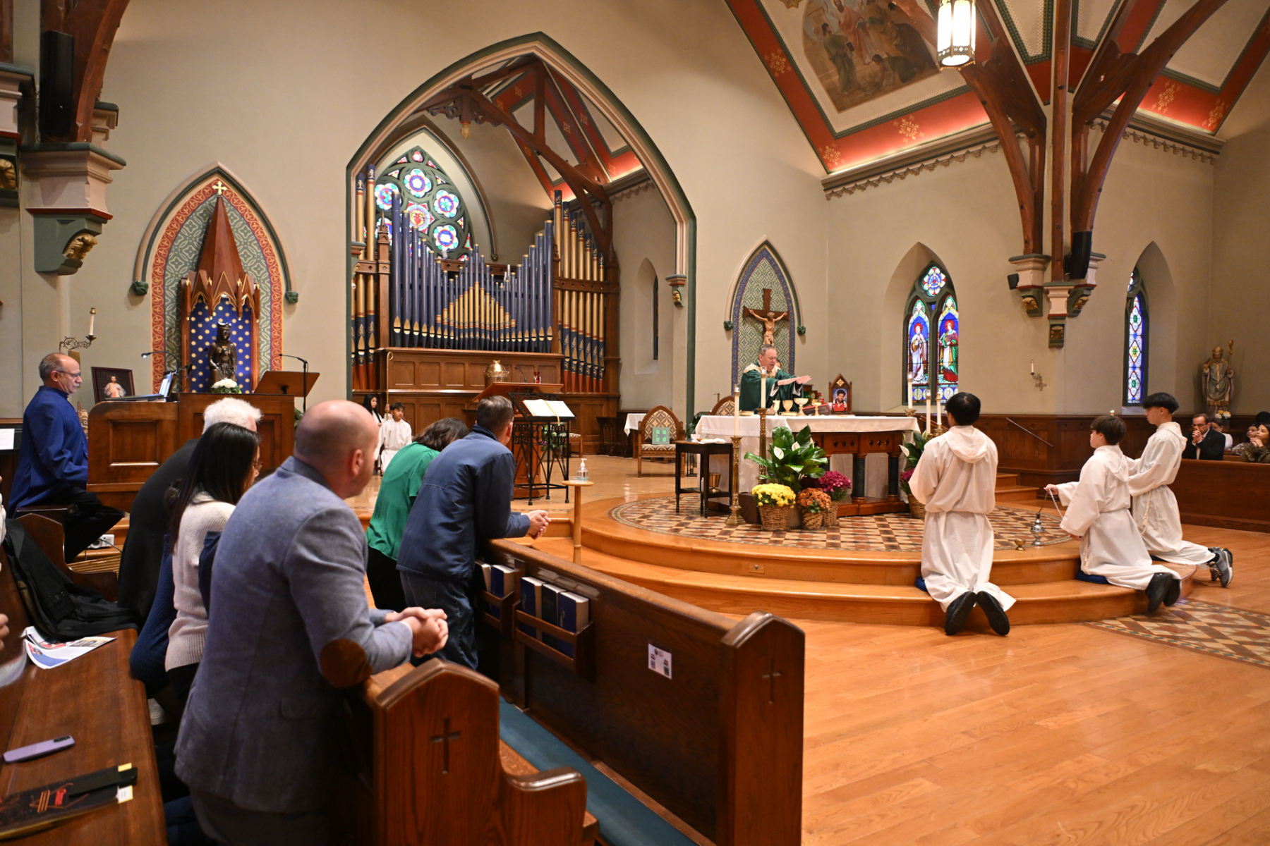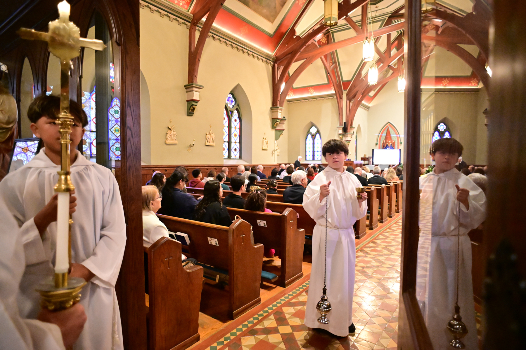 Bishop Kevin J. Sweeney was the main celebrant and homilist of the Mass, which Father Lemmuel Camacho, pastor of St. Mary’s, concelebrated. The parish’s devotion to St. Carlo, one of its patron saints, included the creation of a special place in the church for the faithful to venerate the saint, who was devoted to Jesus’ Real Presence in the Eucharist. The space features a first-class relic of St. Carlo, his portrait, candles, and flowers.