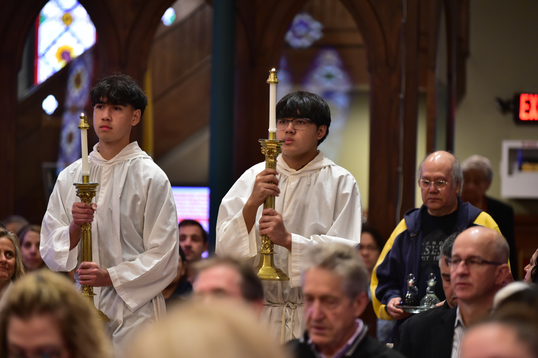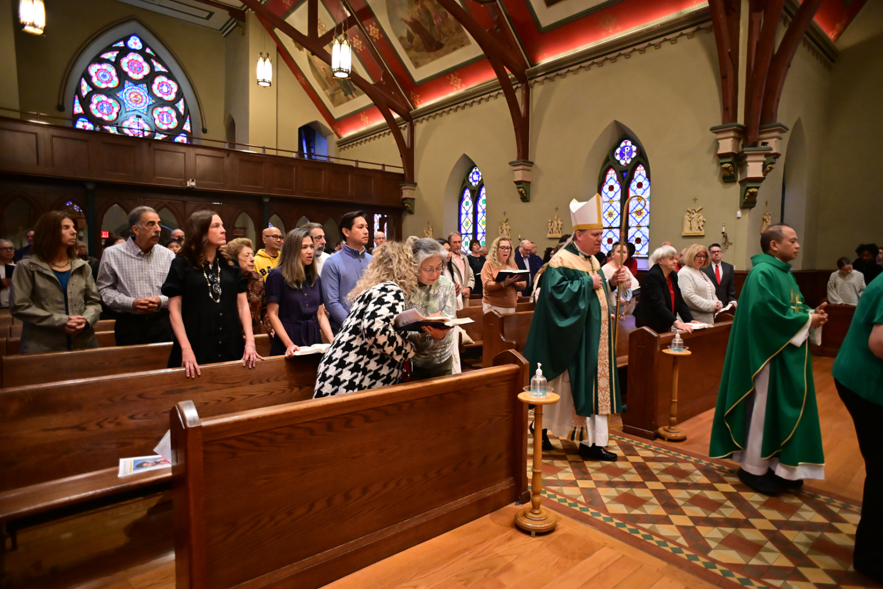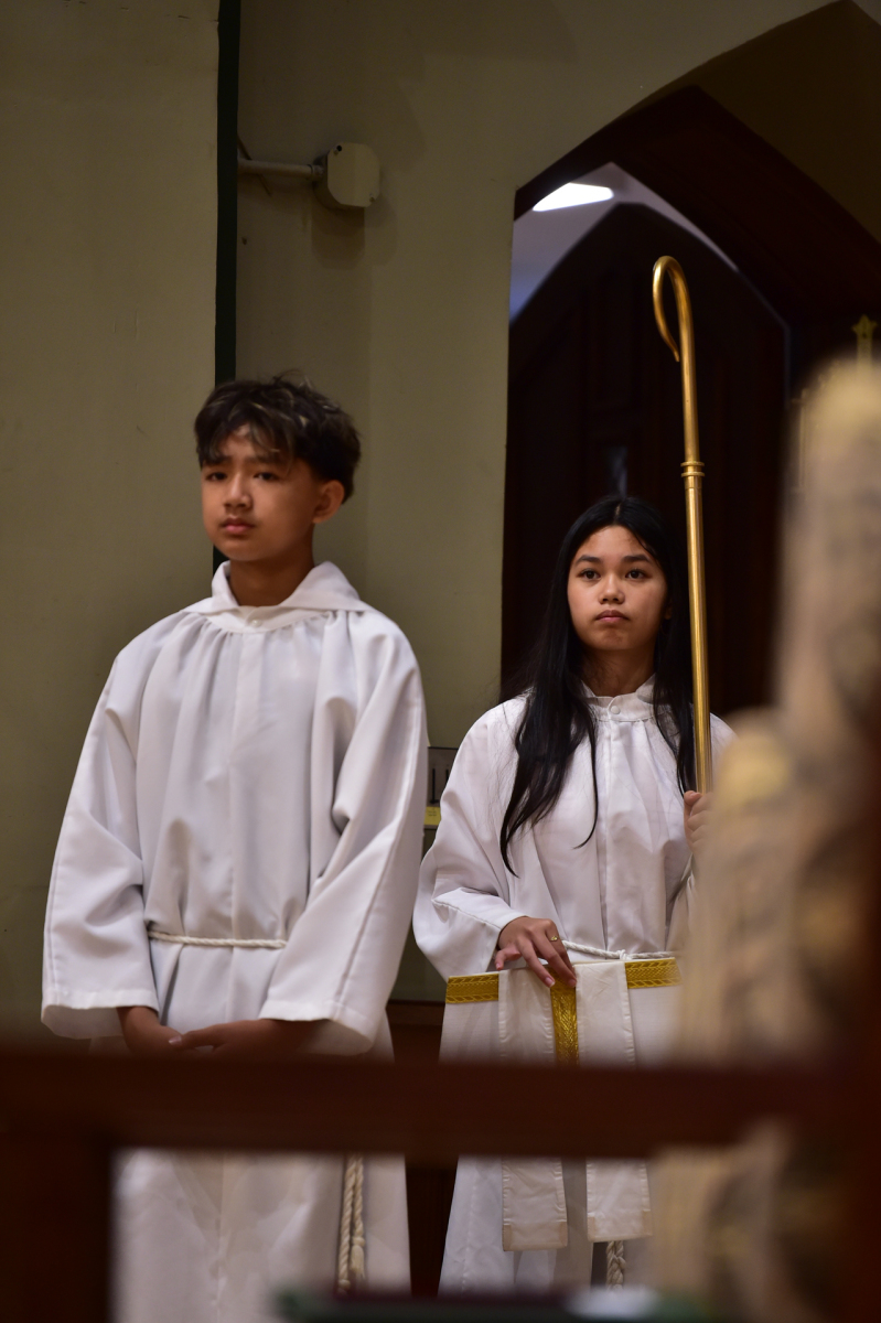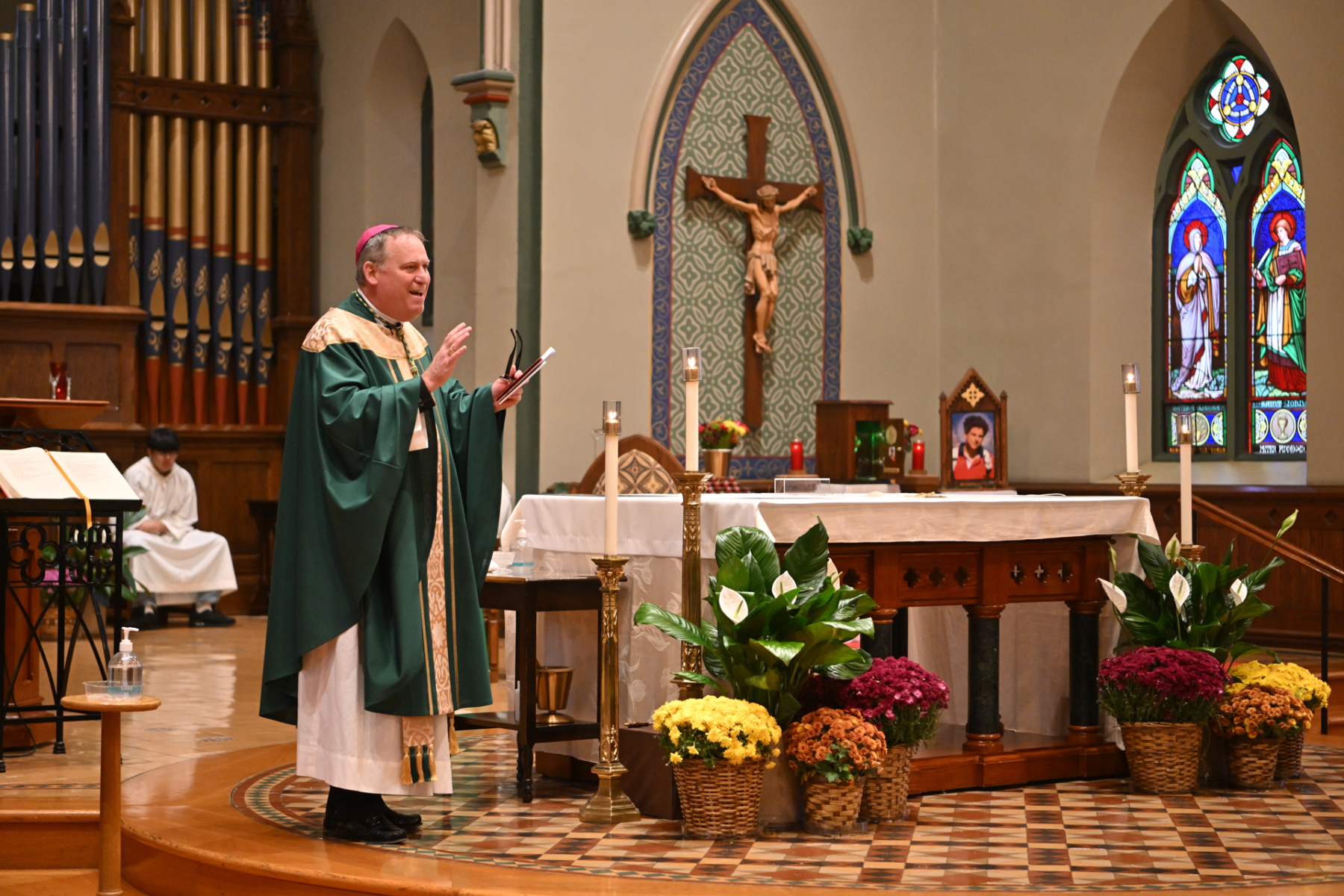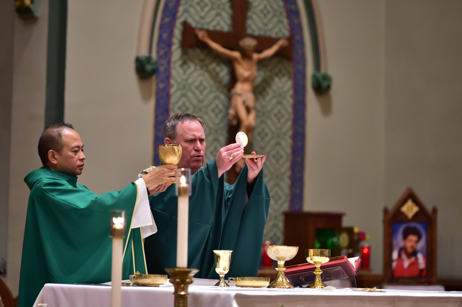 Bishop Kevin J. Sweeney was the main celebrant and homilist of the Mass, which Father Lemmuel Camacho, pastor of St. Mary’s, concelebrated. The parish’s devotion to St. Carlo, one of its patron saints, included the creation of a special place in the church for the faithful to venerate the saint, who was devoted to Jesus’ Real Presence in the Eucharist. The space features a first-class relic of St. Carlo, his portrait, candles, and flowers.