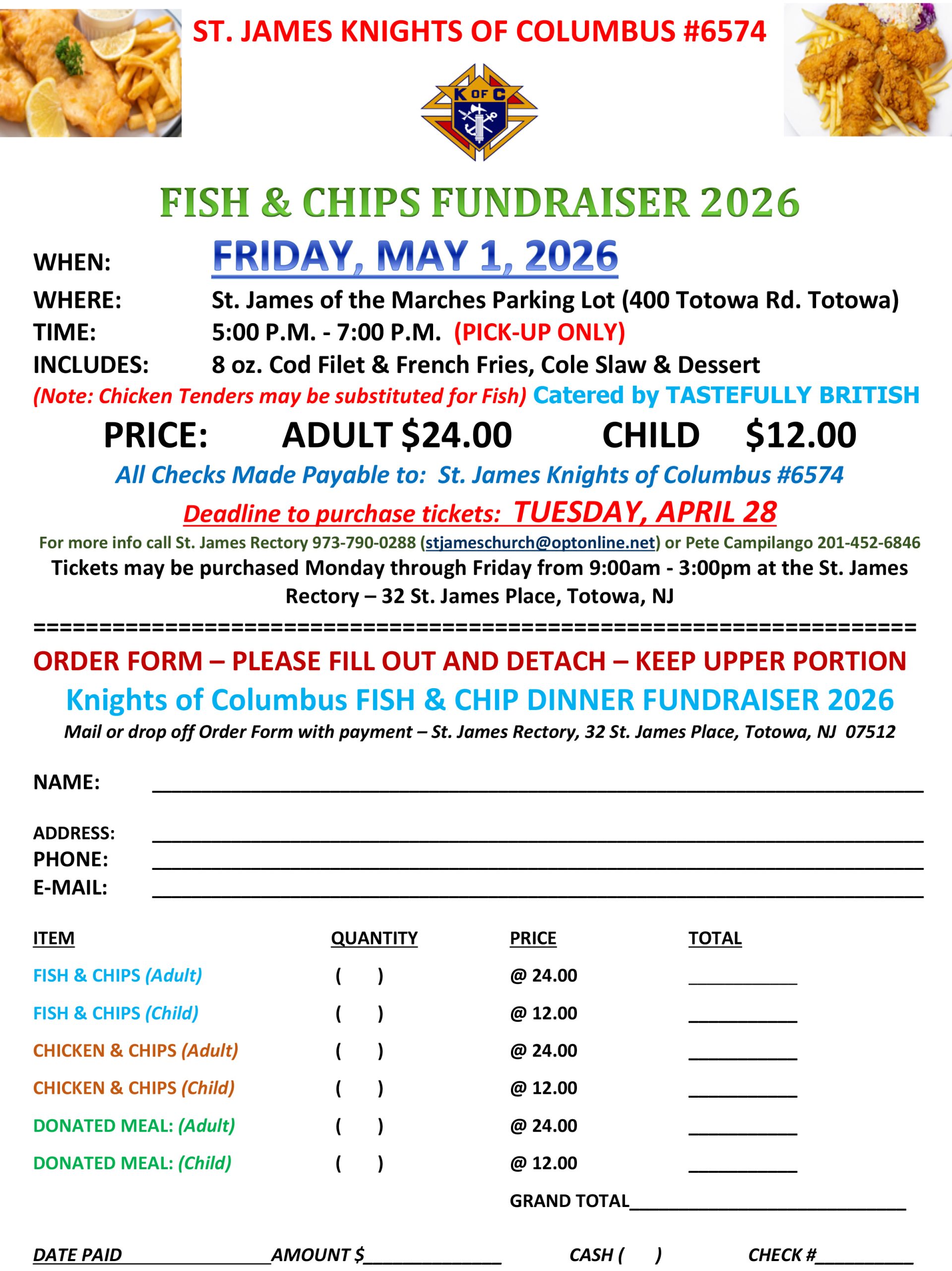 St. James of the Marches Knights of Columbus Council 6574 in Totowa is sponsoring a Fish & Chips Fundraiser on Friday, May 1, from 5 to 7 p.m. Pick-up only.