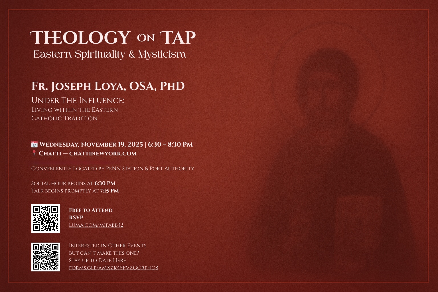 Our guest speaker, Fr. Joseph Loya, O.S.A., Ph.D., is an Augustinian priest and Associate Professor of Historical Theology at Villanova University. Fr. Joe will share insights from his talk, “Under the Influence: Living within the Eastern Catholic Tradition.” Drawing on decades of teaching and ministry, and his upbringing in the Byzantine Catholic Church, Fr. Joe invites us to consider how the Eastern Christian spiritual path helps us live more authentically, joyfully, and faithfully in a complex world.