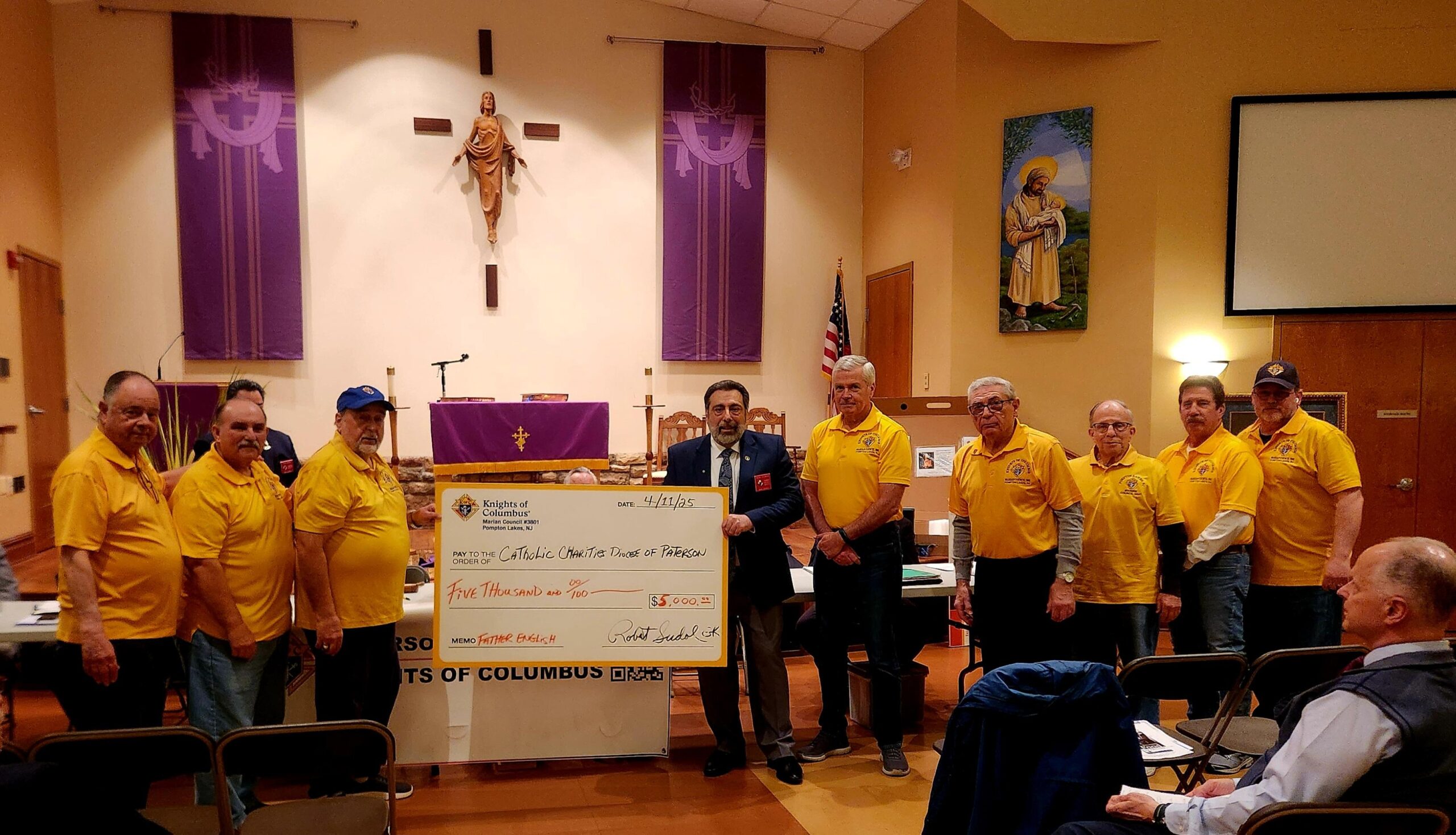 The Knights of Columbus Marian Council 3801 in Pompton Lakes on April 11 presented a $5,000 check to Catholic Charities of the Paterson Diocese for much-needed major renovations to its Father English Community Center in Paterson. The collection was conducted at a Paterson Federation Knights of Columbus meeting.