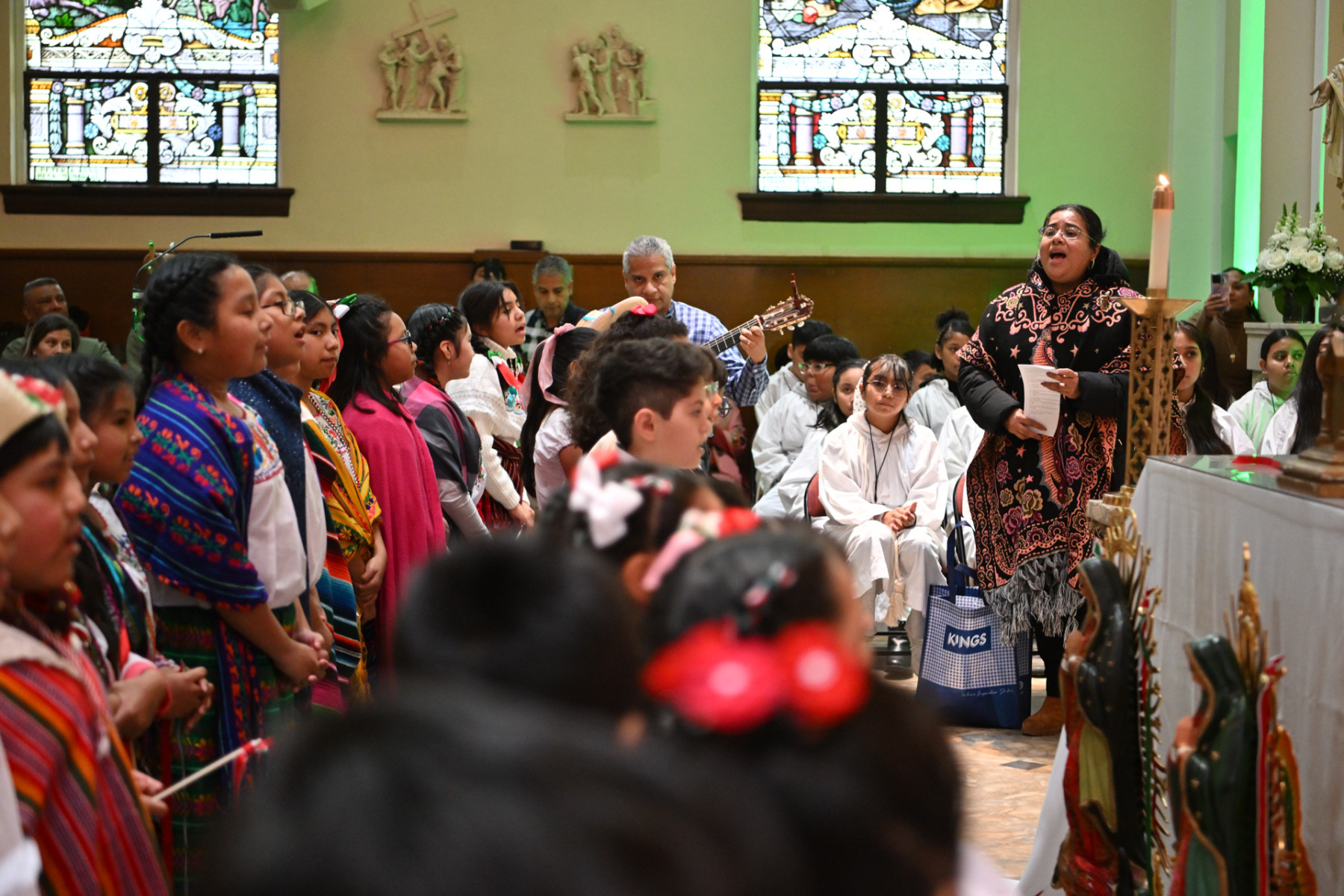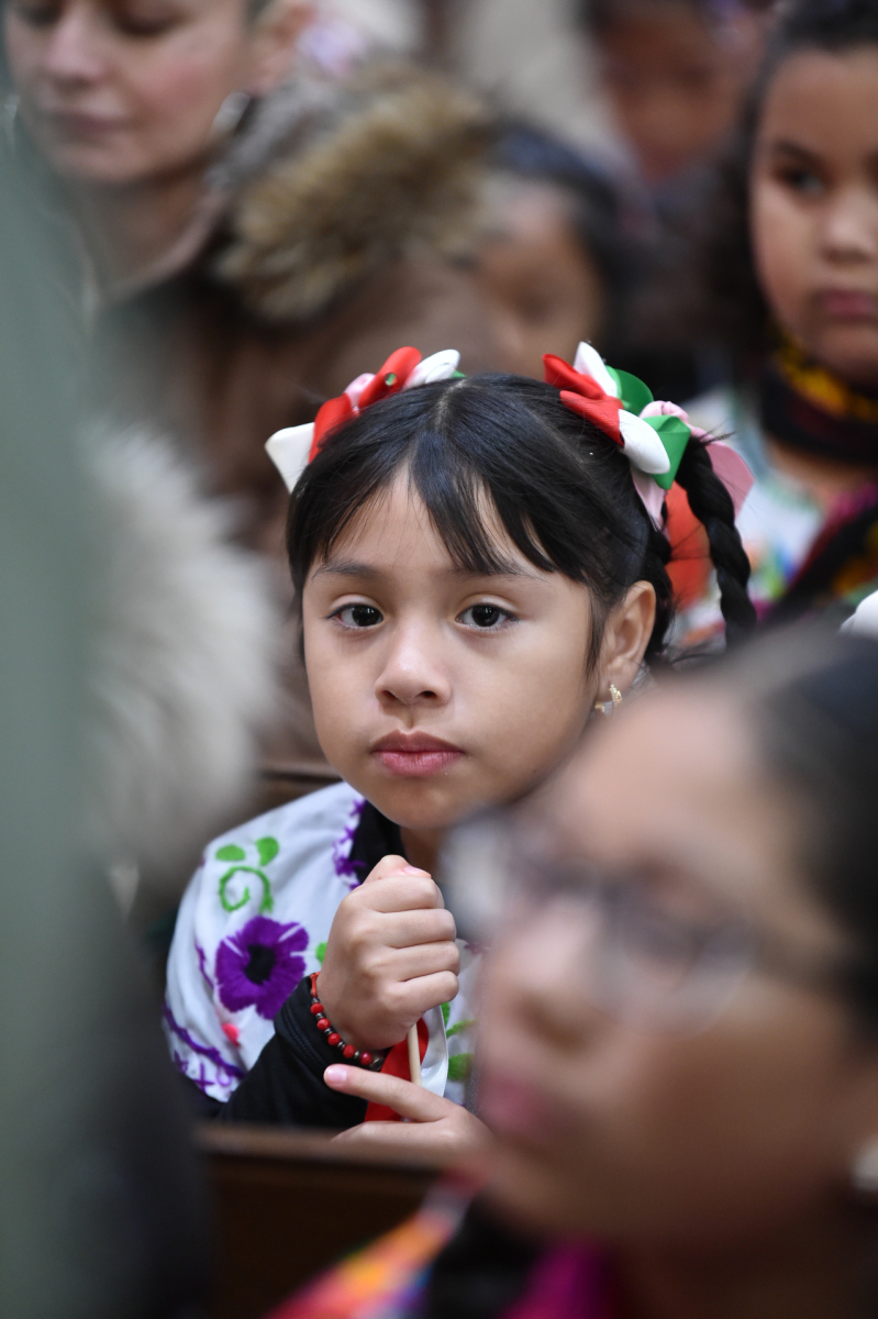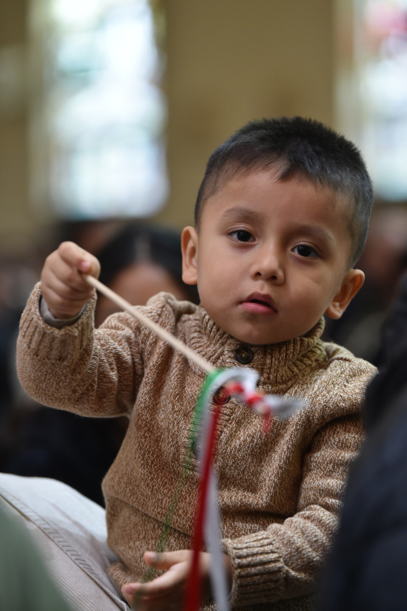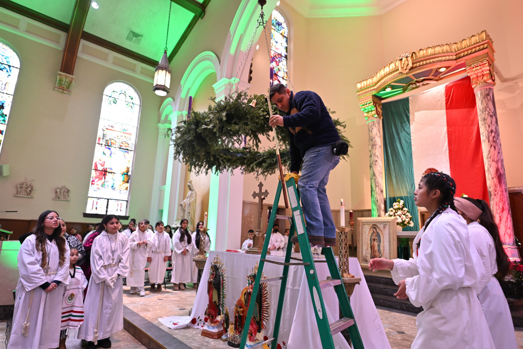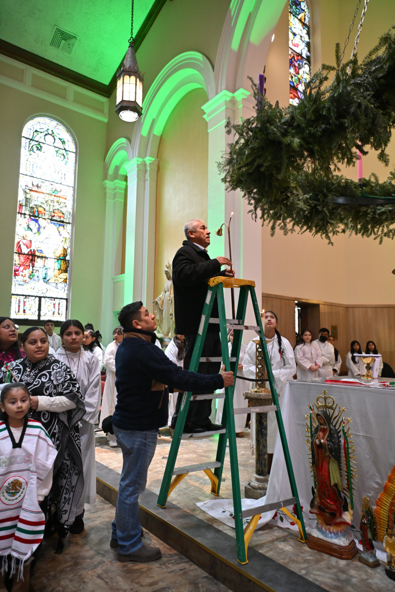 Many churchgoers dressed in native garments or clothing bearing the image of Our Lady of Guadalupe and joined in singing Spanish hymns during the Mass. Representatives of the Pricio and Delgado families offered public reflections and lit the candles of the parish’s Advent wreath. They climbed a ladder to reach the wreath hanging above the altar—a tradition at Holy Trinity started by the German Catholics who founded the parish.