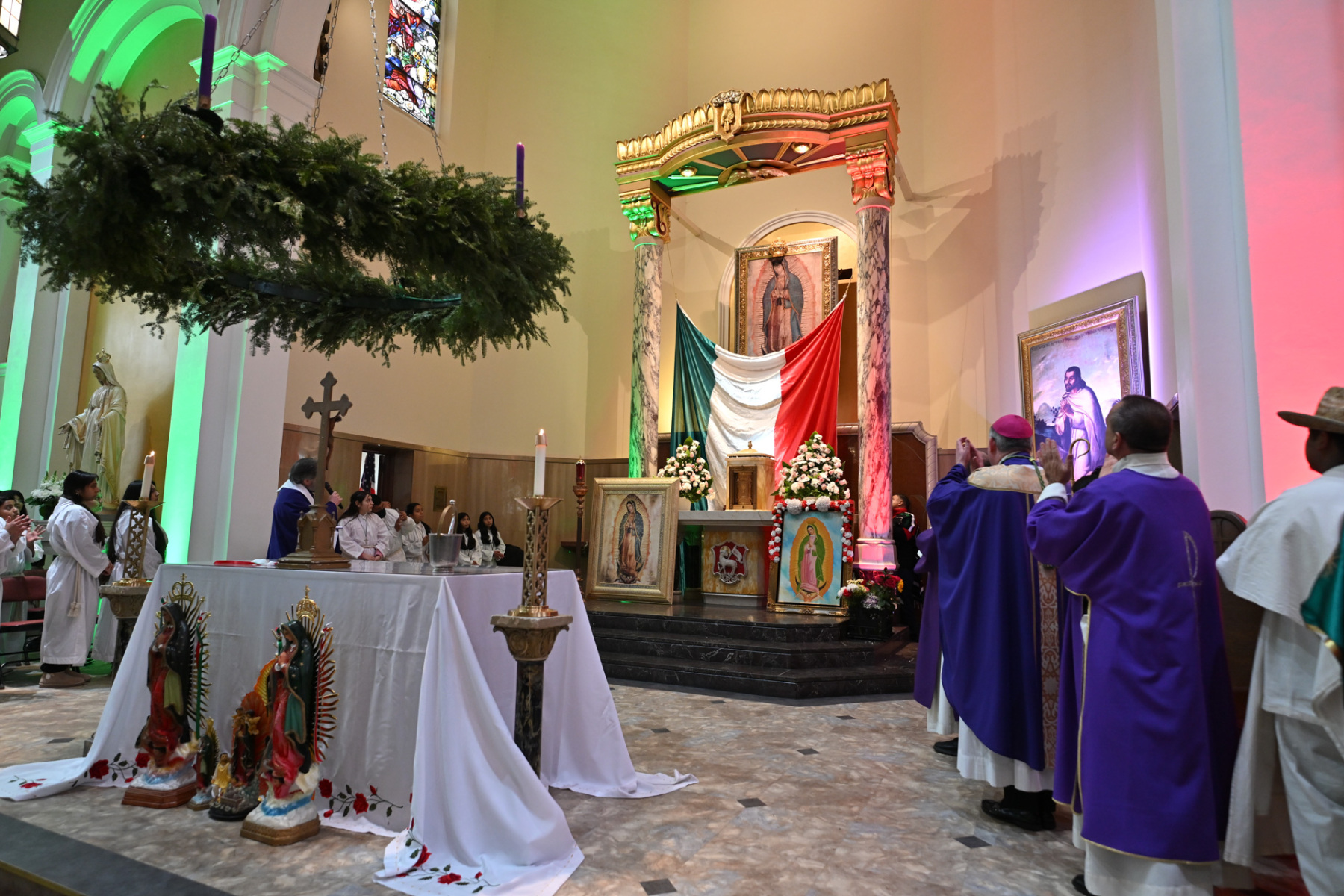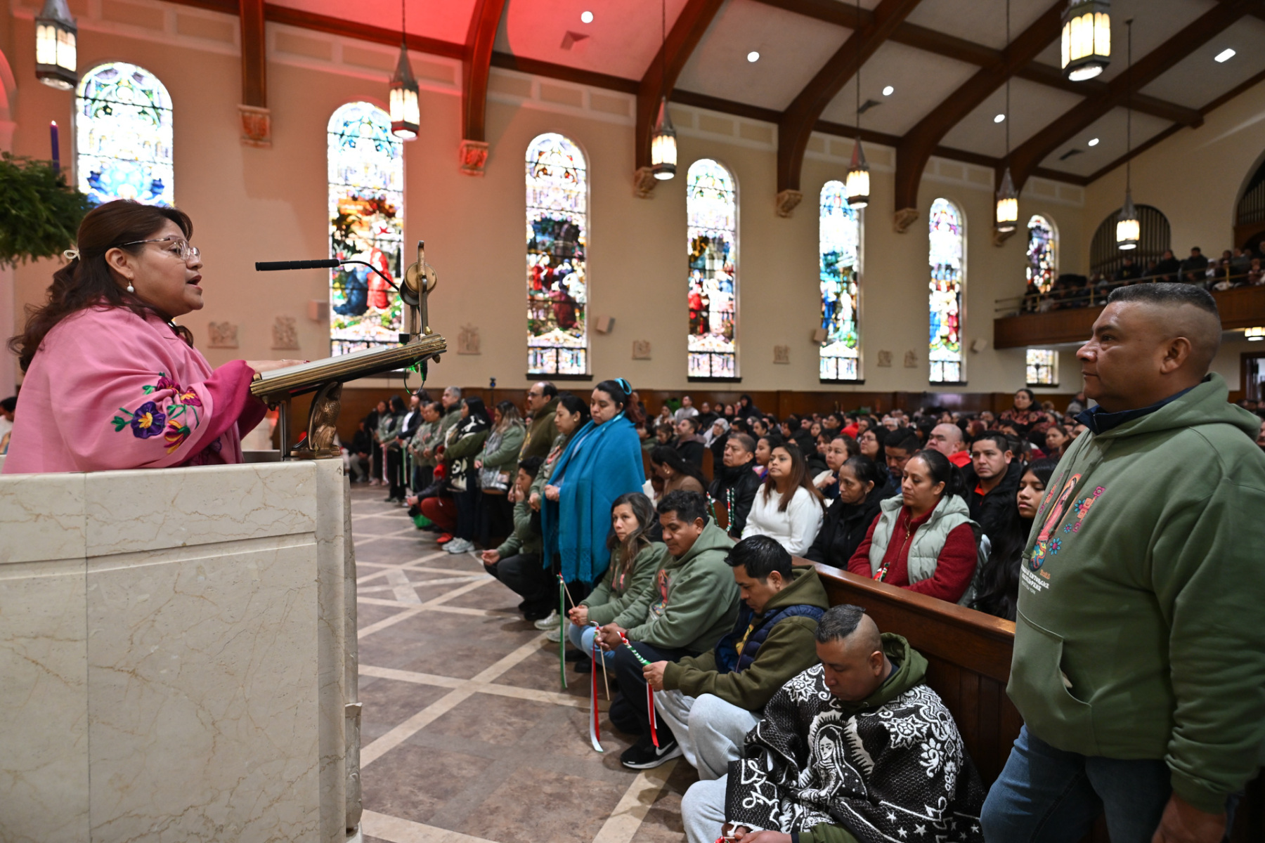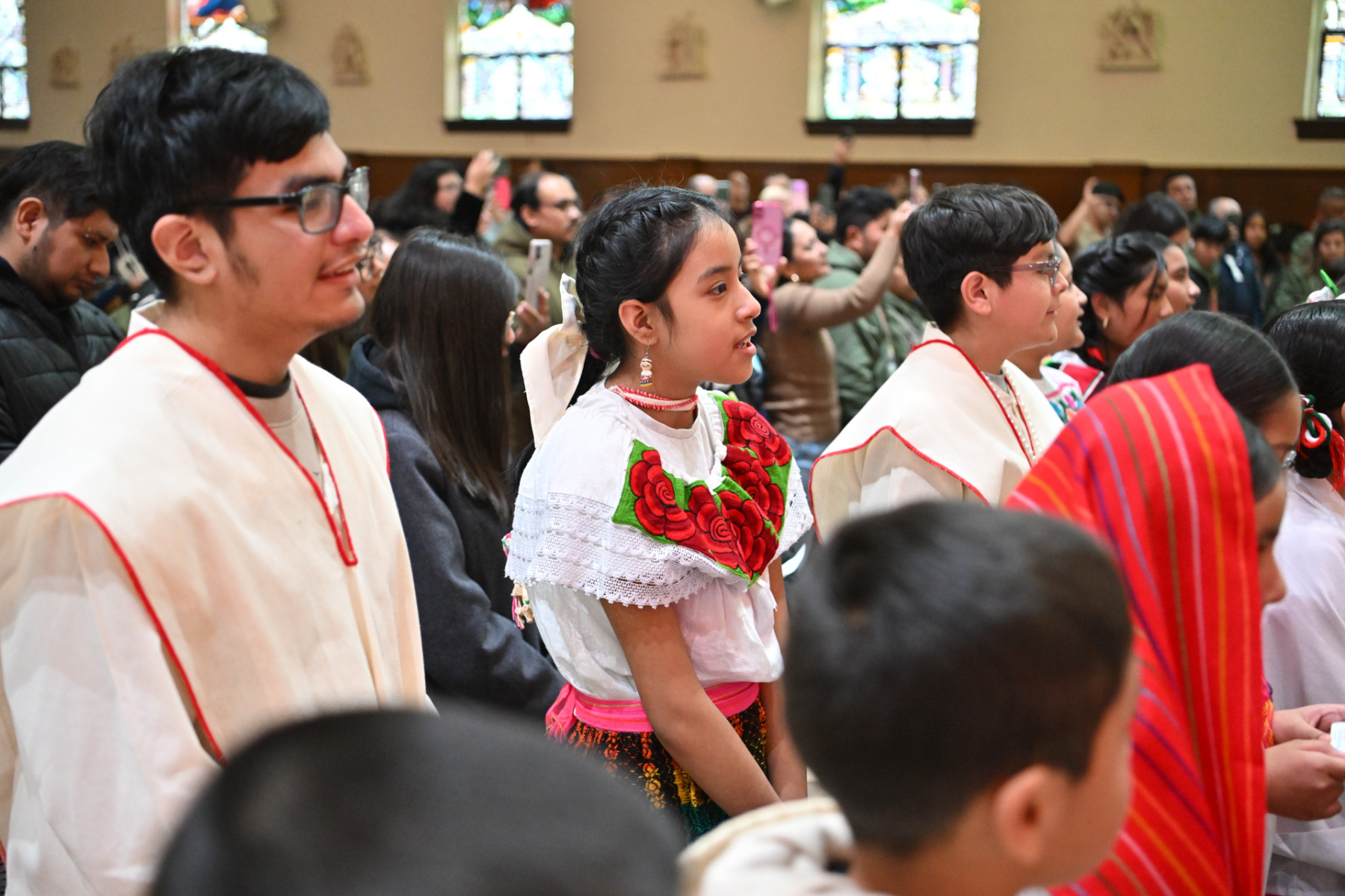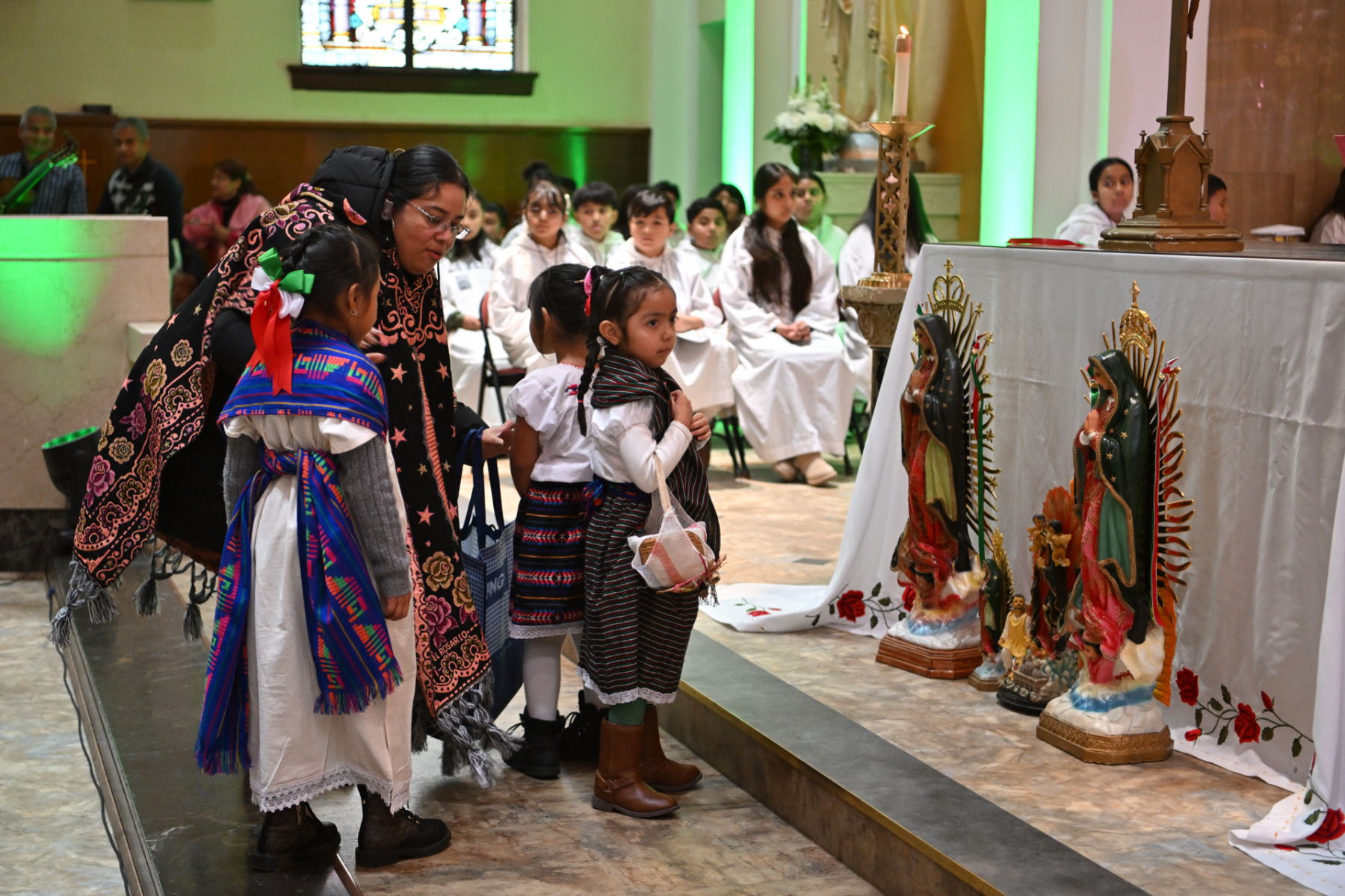 Many churchgoers dressed in native garments or clothing bearing the image of Our Lady of Guadalupe and joined in singing Spanish hymns during the Mass. Representatives of the Pricio and Delgado families offered public reflections and lit the candles of the parish’s Advent wreath. They climbed a ladder to reach the wreath hanging above the altar—a tradition at Holy Trinity started by the German Catholics who founded the parish.