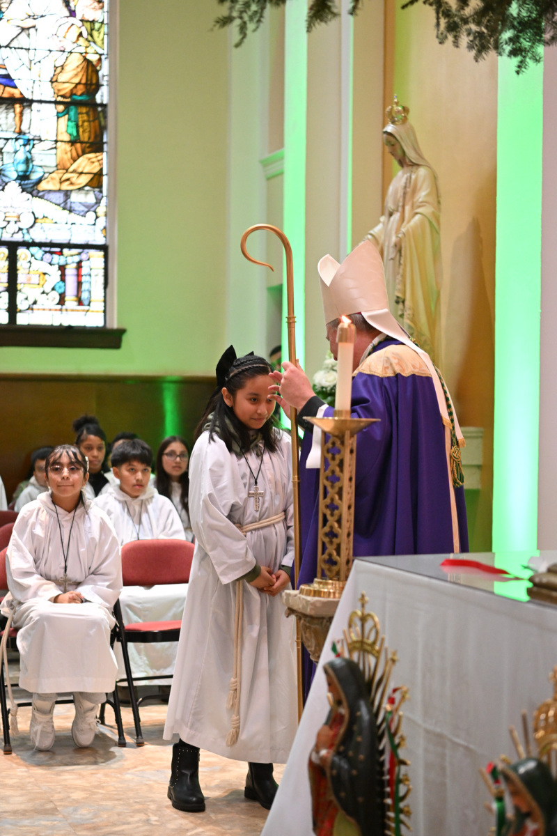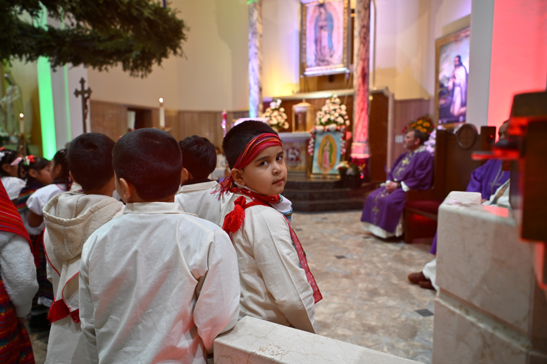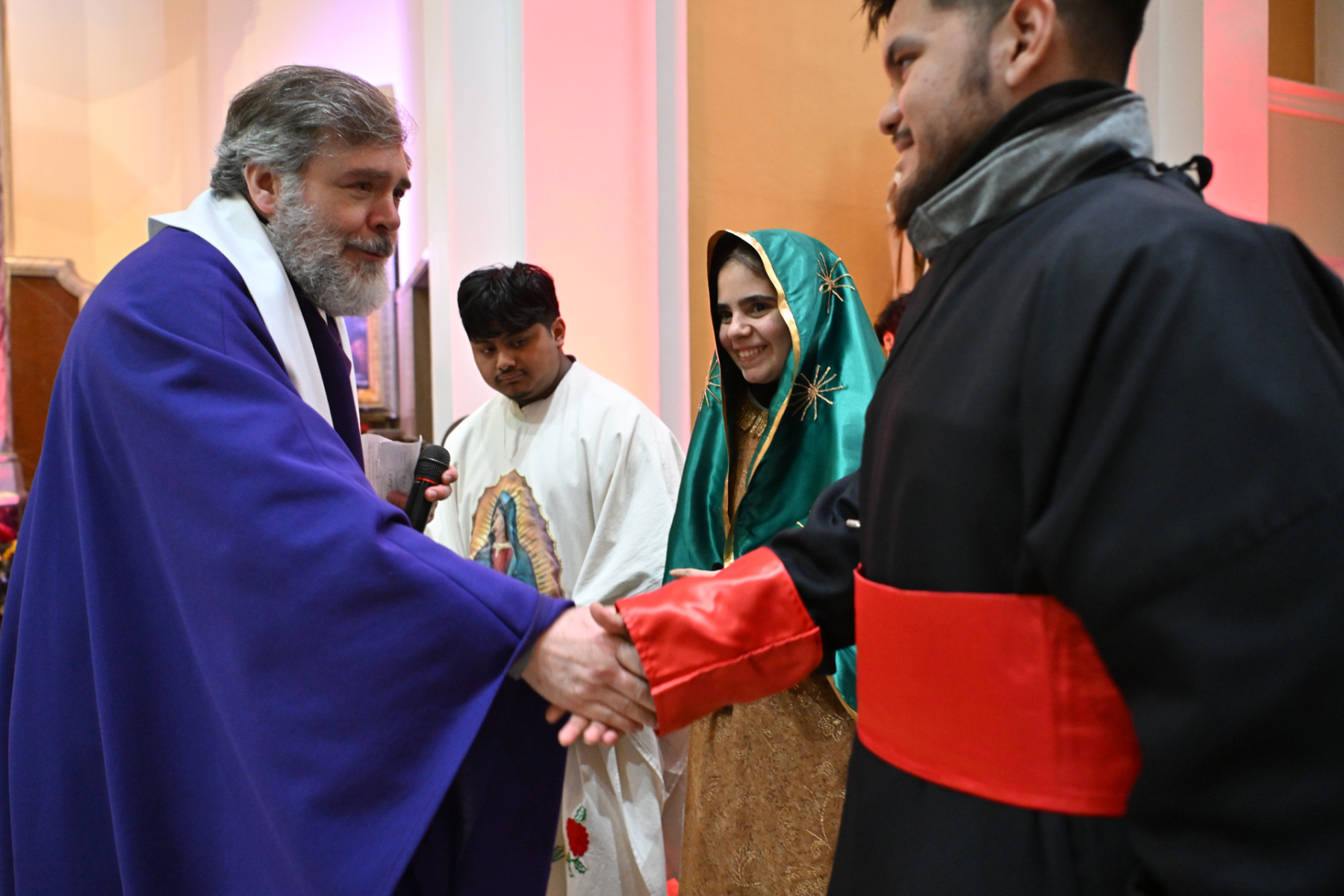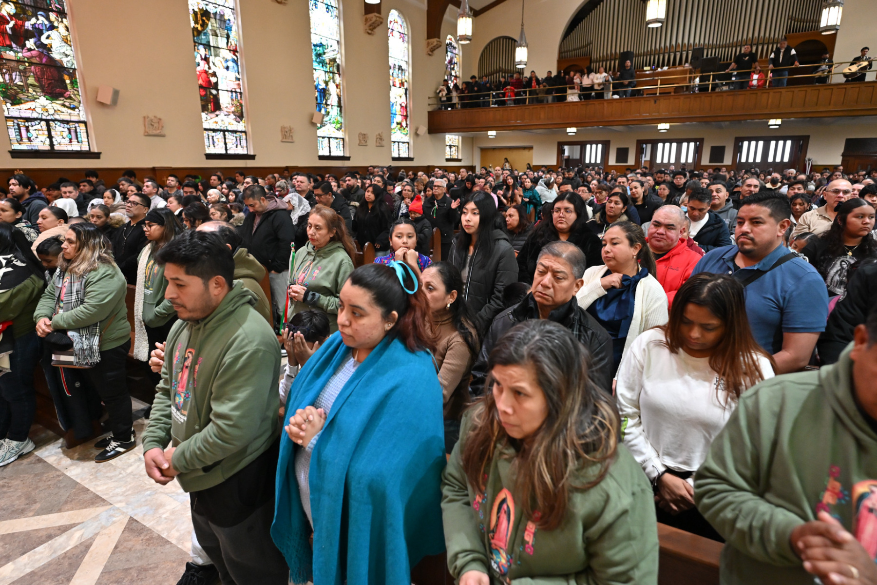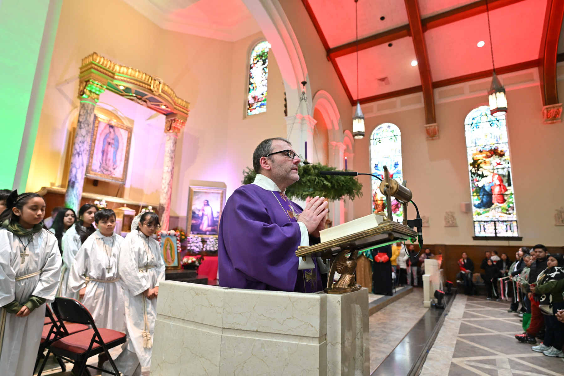Many churchgoers dressed in native garments or clothing bearing the image of Our Lady of Guadalupe and joined in singing Spanish hymns during the Mass. Representatives of the Pricio and Delgado families offered public reflections and lit the candles of the parish’s Advent wreath. They climbed a ladder to reach the wreath hanging above the altar—a tradition at Holy Trinity started by the German Catholics who founded the parish.