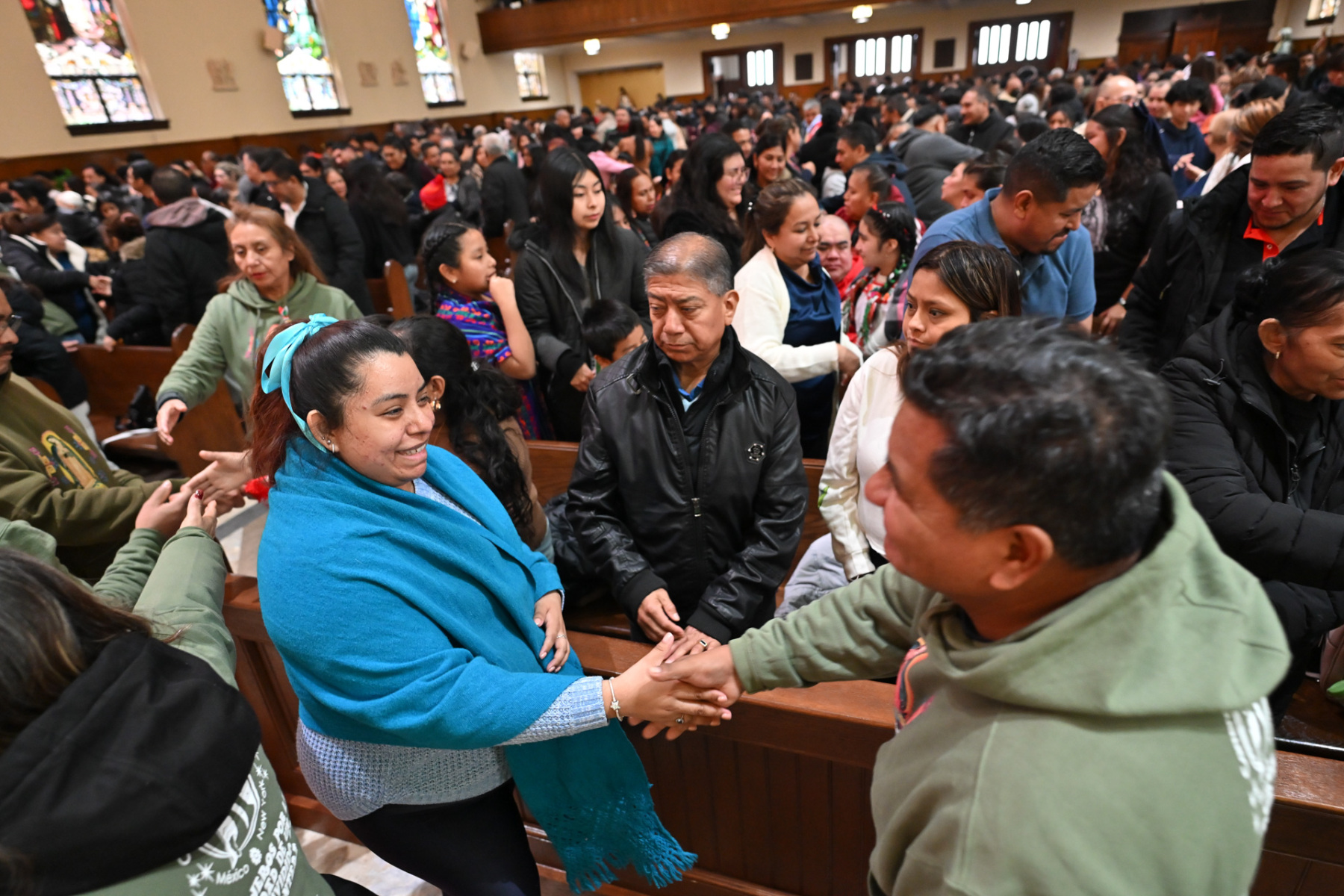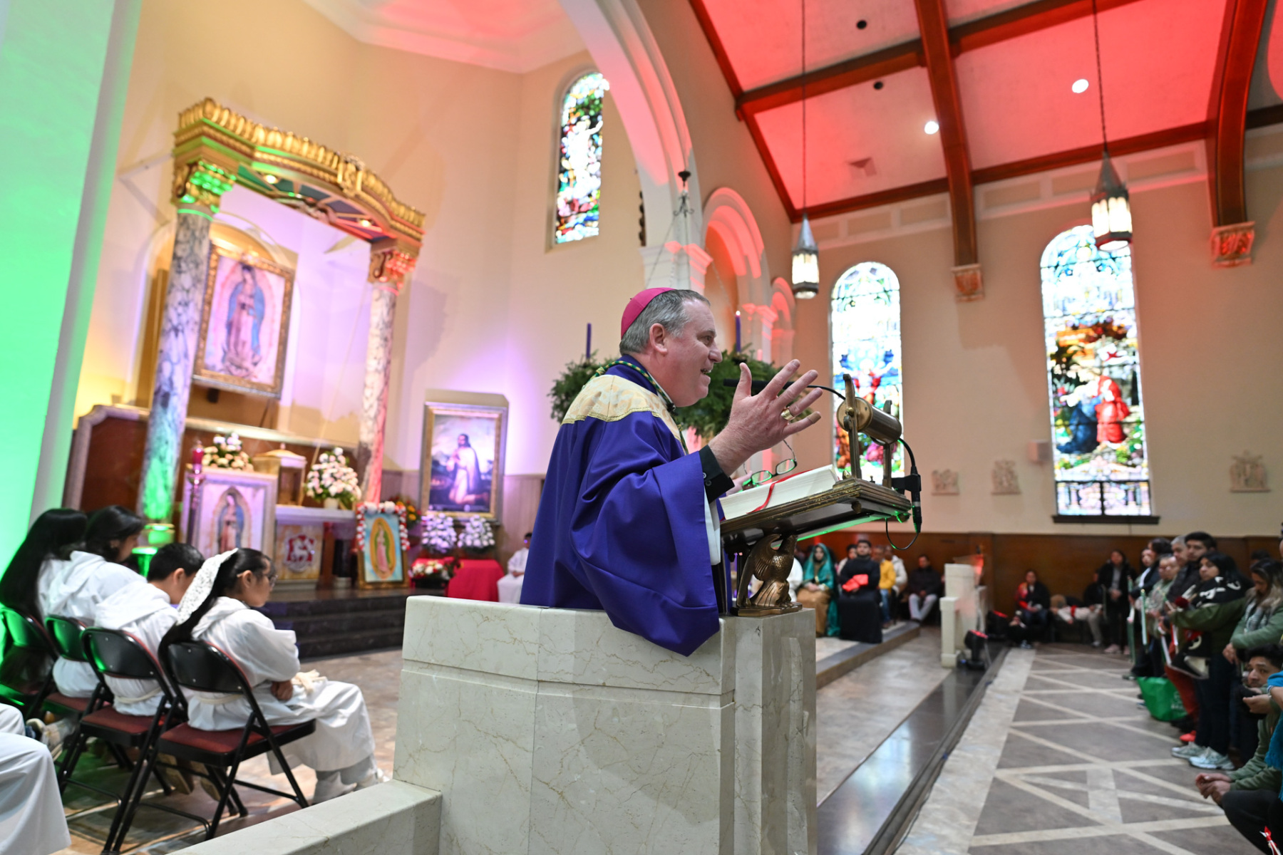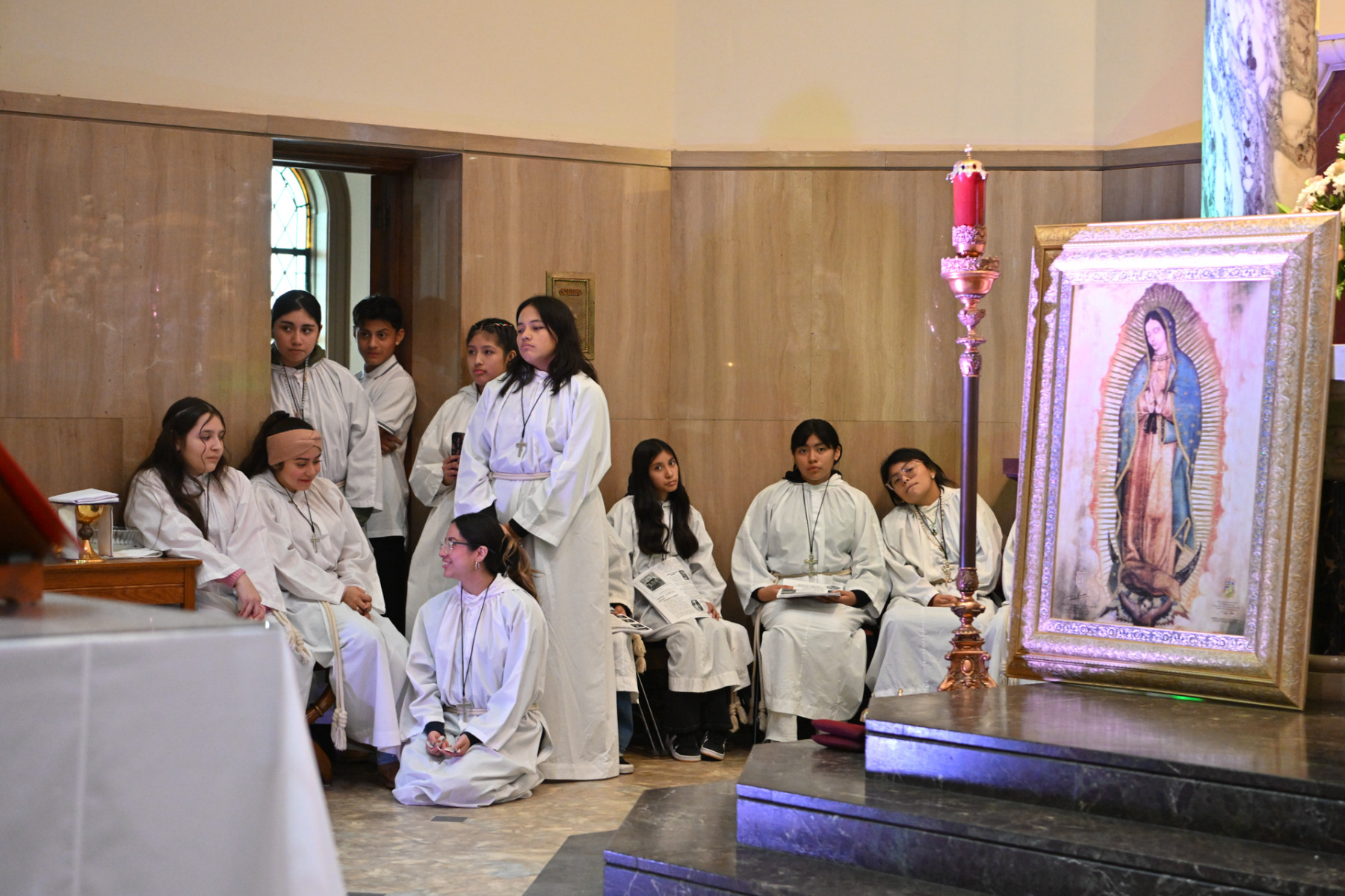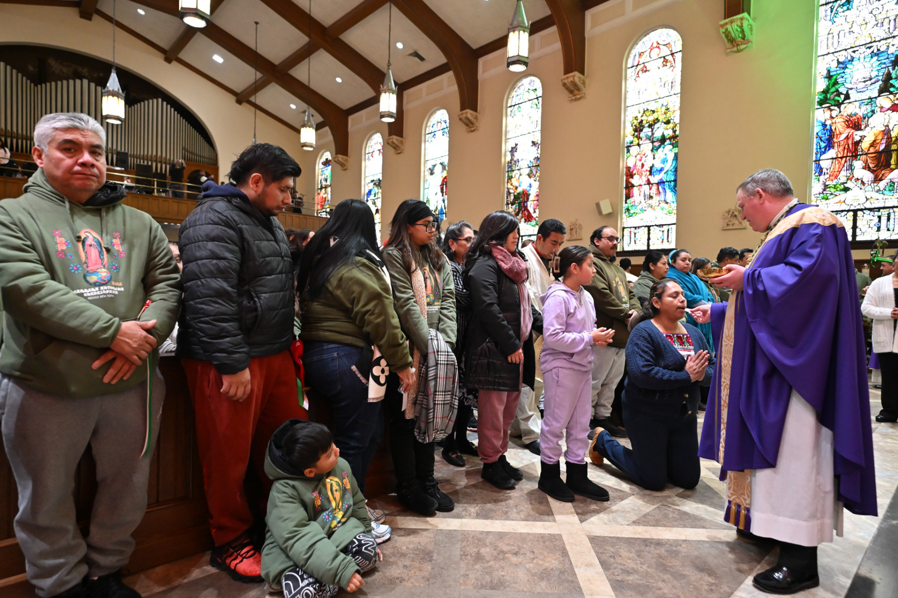 Many churchgoers dressed in native garments or clothing bearing the image of Our Lady of Guadalupe and joined in singing Spanish hymns during the Mass. Representatives of the Pricio and Delgado families offered public reflections and lit the candles of the parish’s Advent wreath. They climbed a ladder to reach the wreath hanging above the altar—a tradition at Holy Trinity started by the German Catholics who founded the parish.