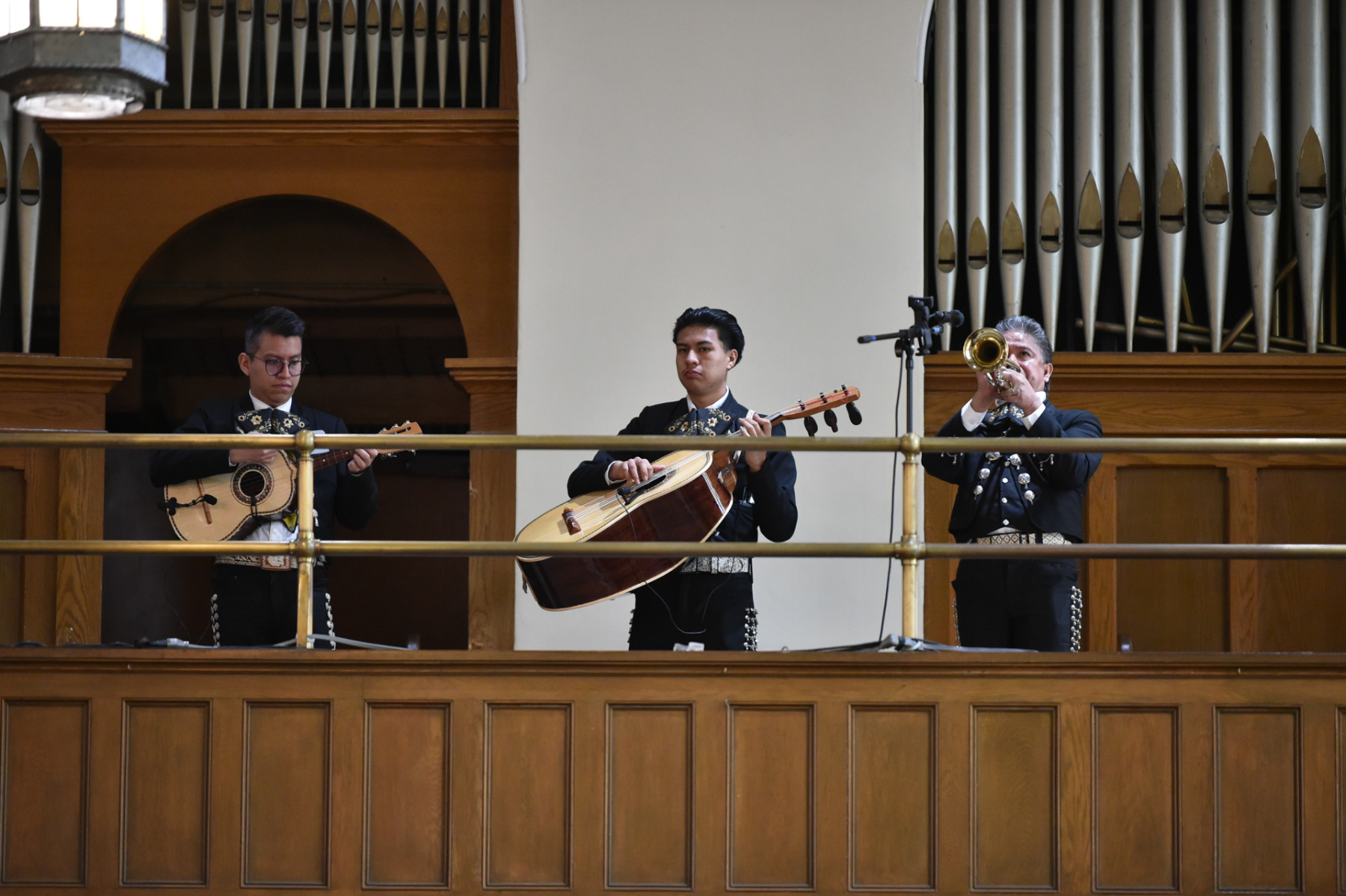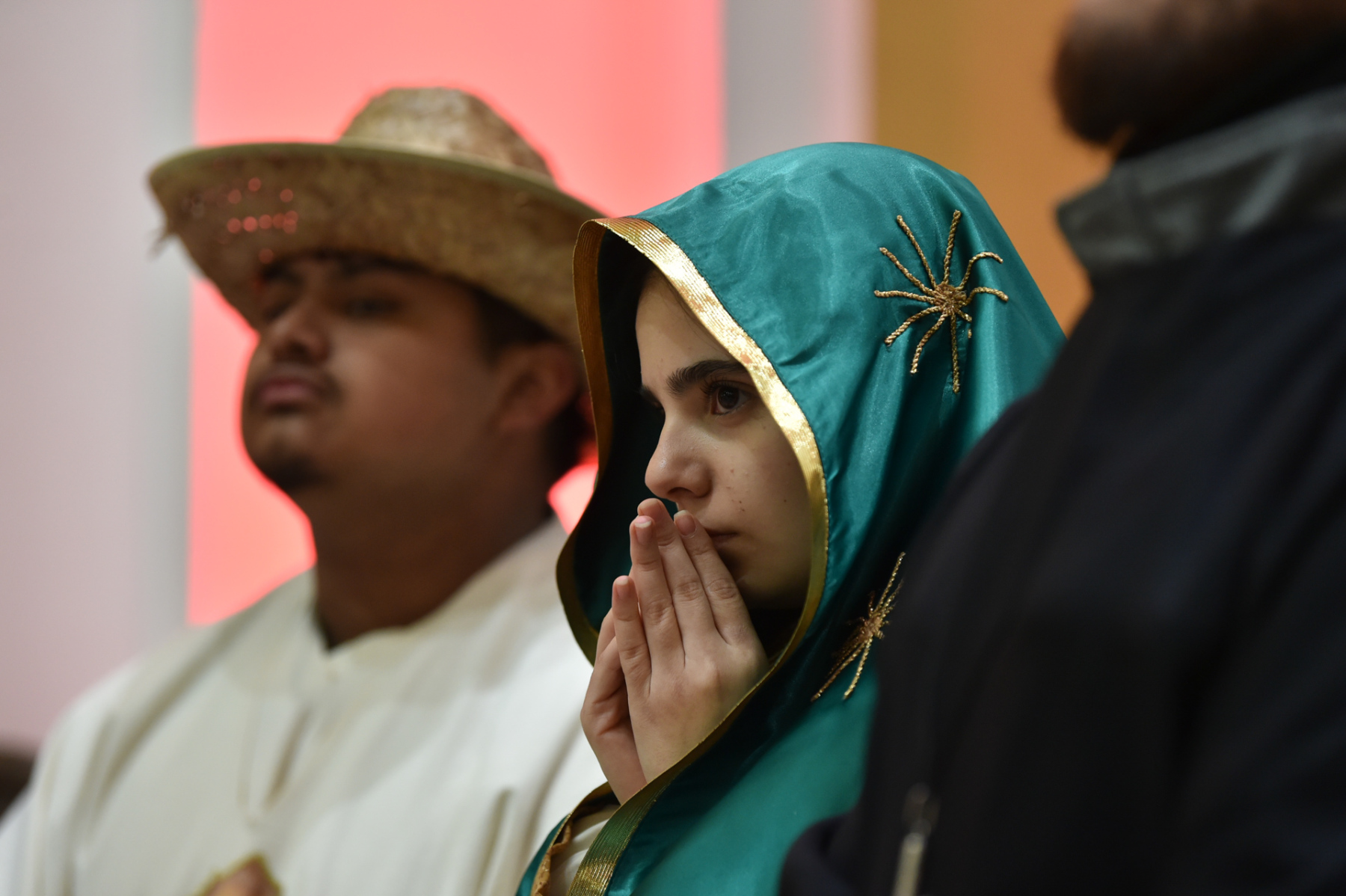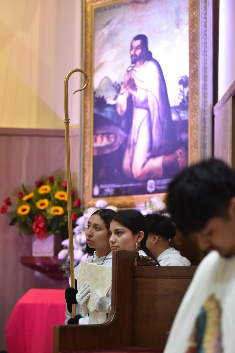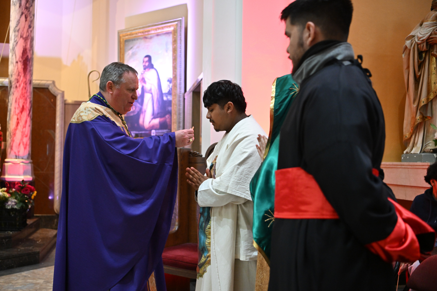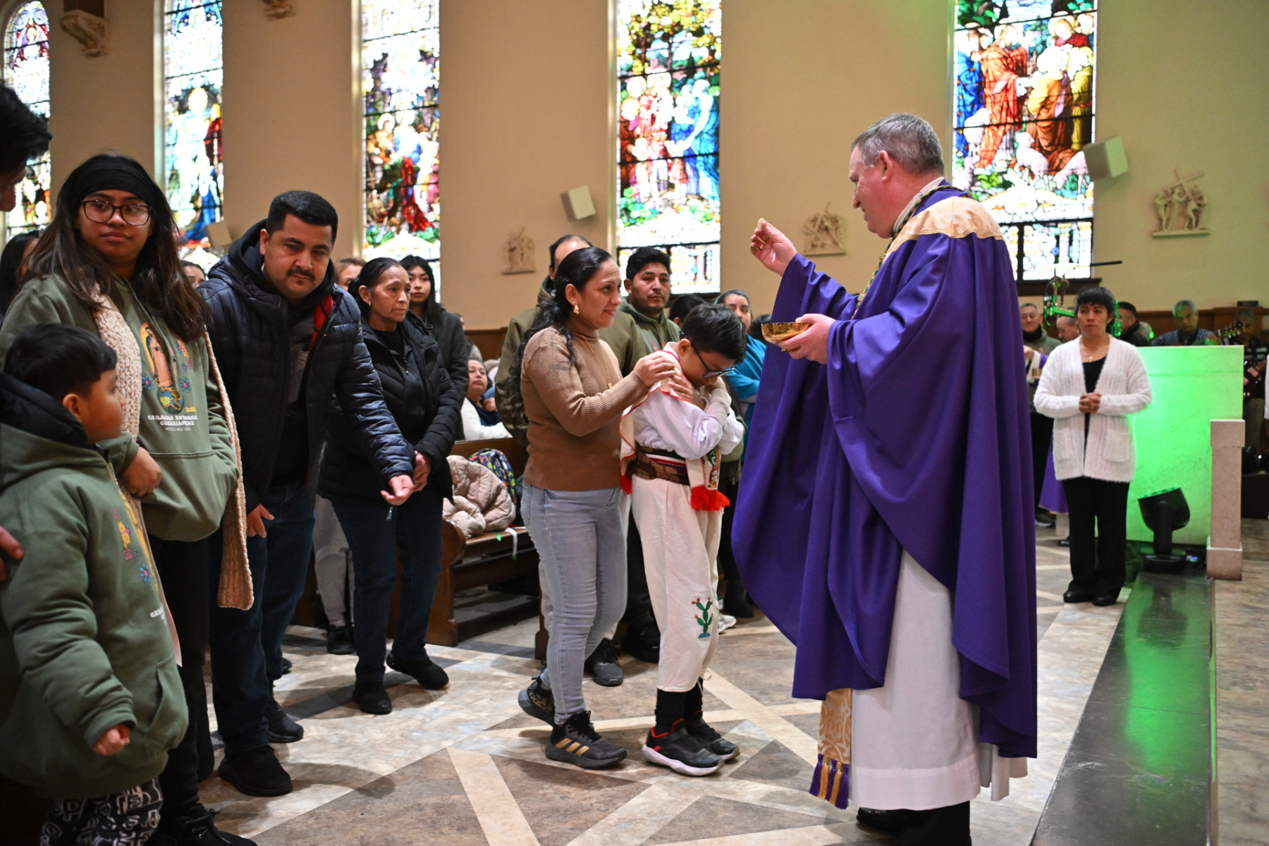Many churchgoers dressed in native garments or clothing bearing the image of Our Lady of Guadalupe and joined in singing Spanish hymns during the Mass. Representatives of the Pricio and Delgado families offered public reflections and lit the candles of the parish’s Advent wreath. They climbed a ladder to reach the wreath hanging above the altar—a tradition at Holy Trinity started by the German Catholics who founded the parish.