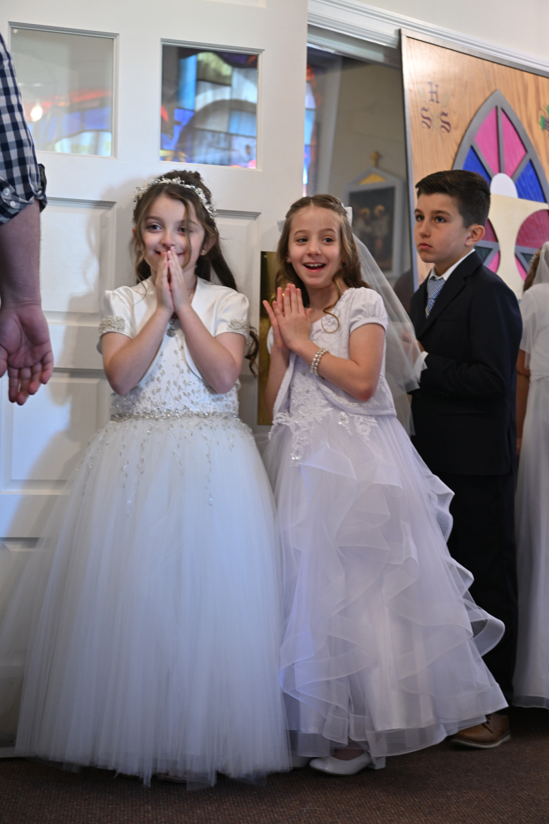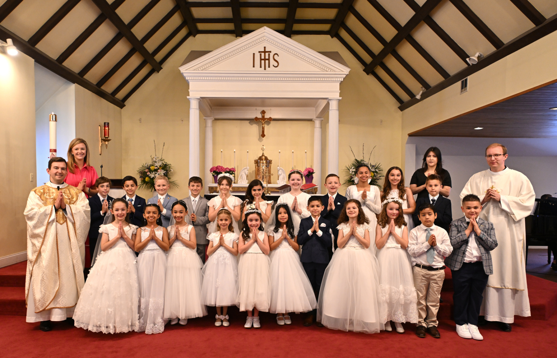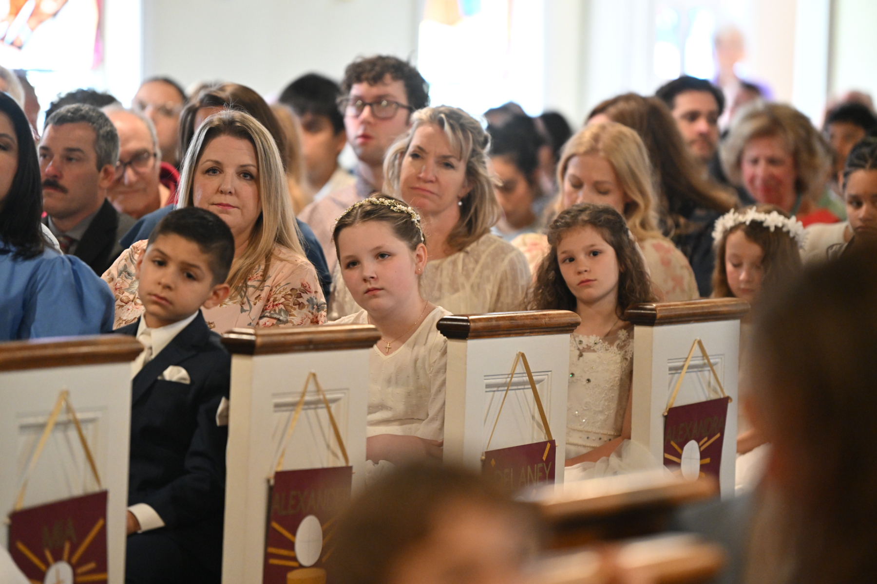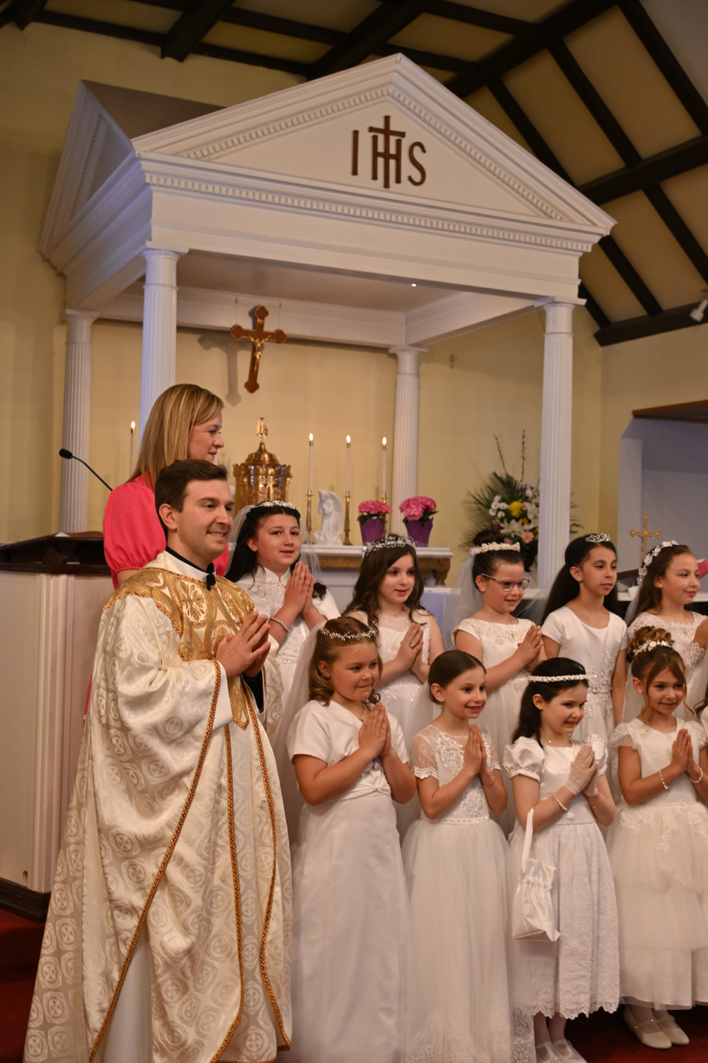 On May 10, 47 youth from the Family Faith Formation program of Holy Family Parish in Pequannock and the parish school received Jesus’ Body and Blood in the Eucharist for the first time during two Masses at 10 a.m. and noon.