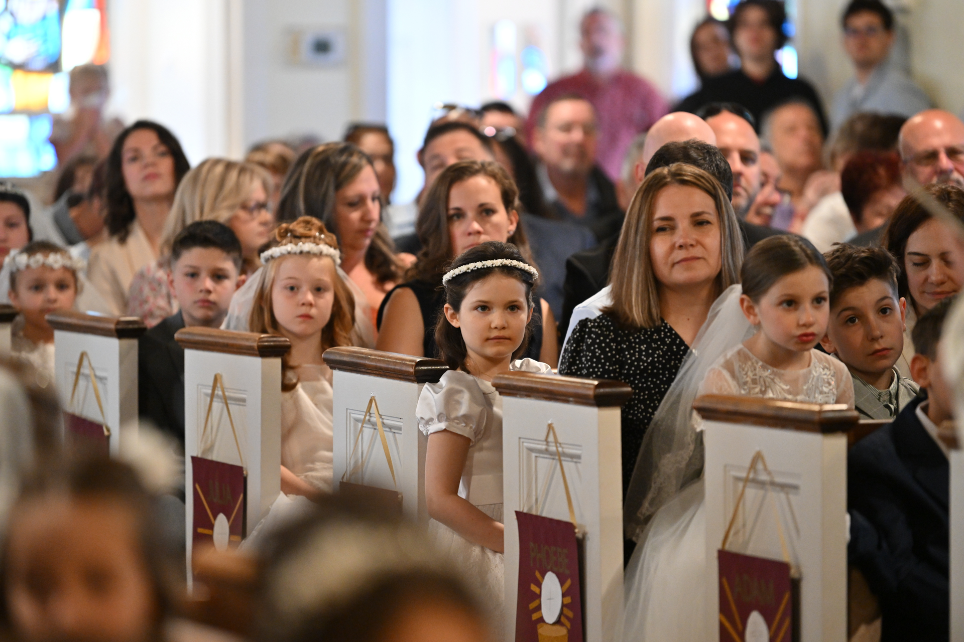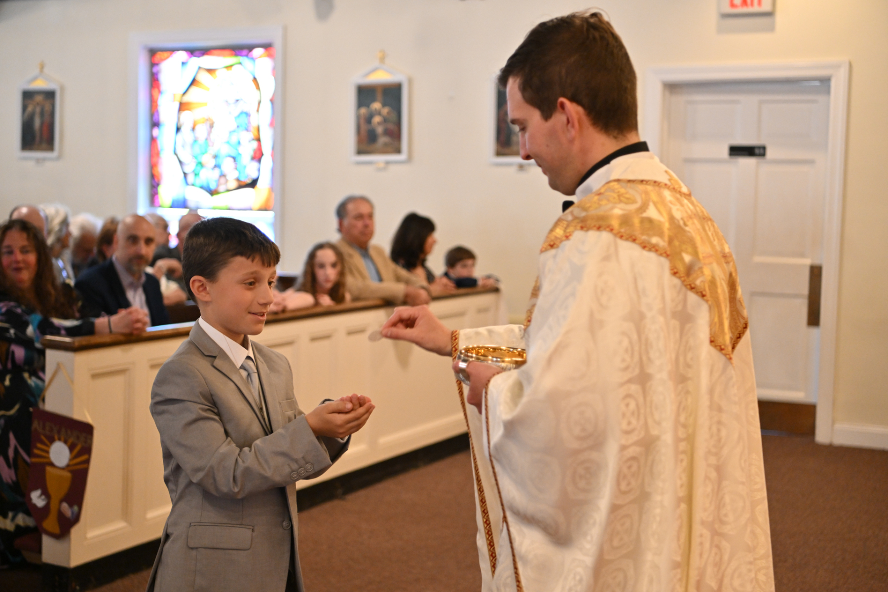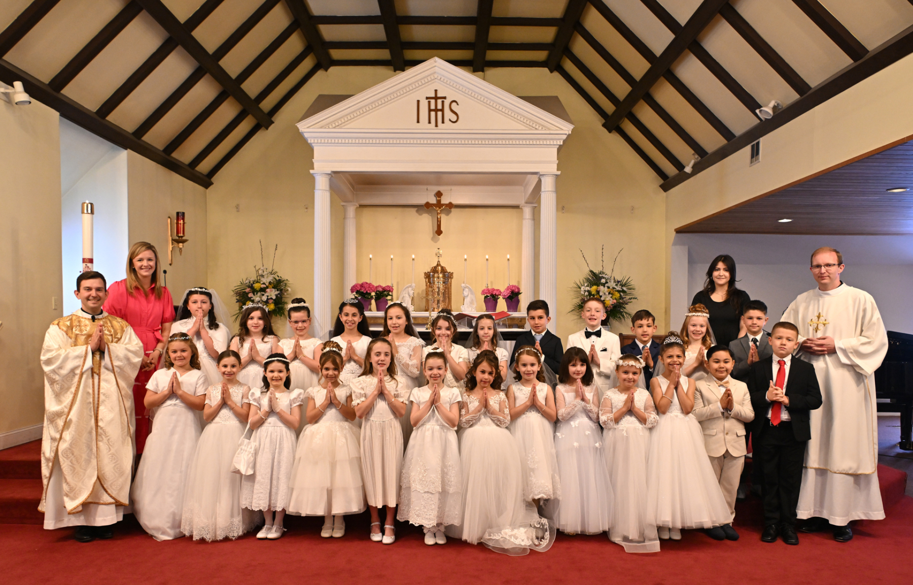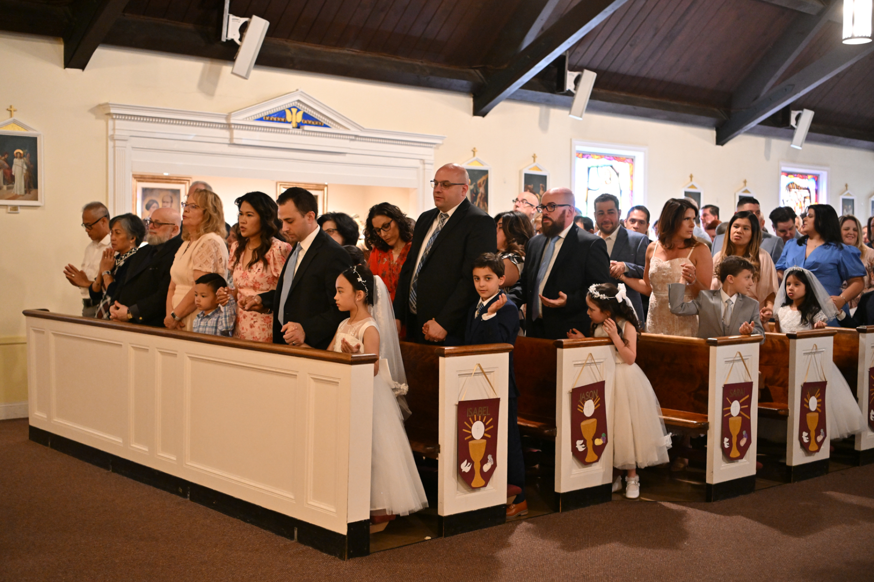 On May 10, 47 youth from the Family Faith Formation program of Holy Family Parish in Pequannock and the parish school received Jesus’ Body and Blood in the Eucharist for the first time during two Masses at 10 a.m. and noon.