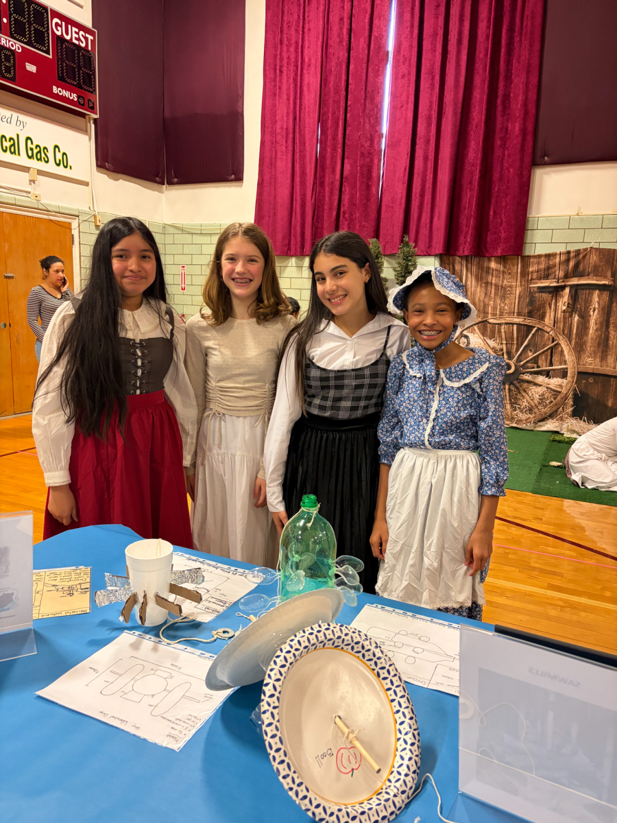 Sixth-grade students presented their research on a variety of colonial topics, including trade, occupations, roles of women, fashion, food, medicine, spies, the military, notable figures such as George Washington and Phillis Wheatley, and Native Americans. They also demonstrated how to make clay beads and marbles. Seventh grade students explored colonial engineering as millwrights, designing and building waterwheels used to power sawmills, flour mills, and textile mills. They calculated the work, power, and horsepower generated by their waterwheels.