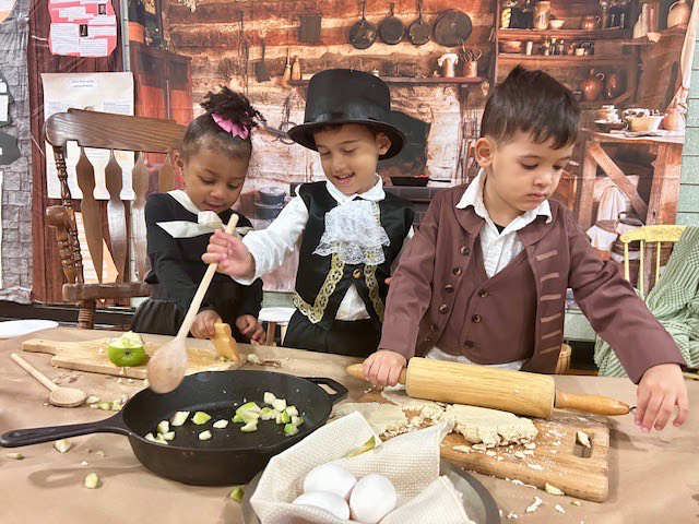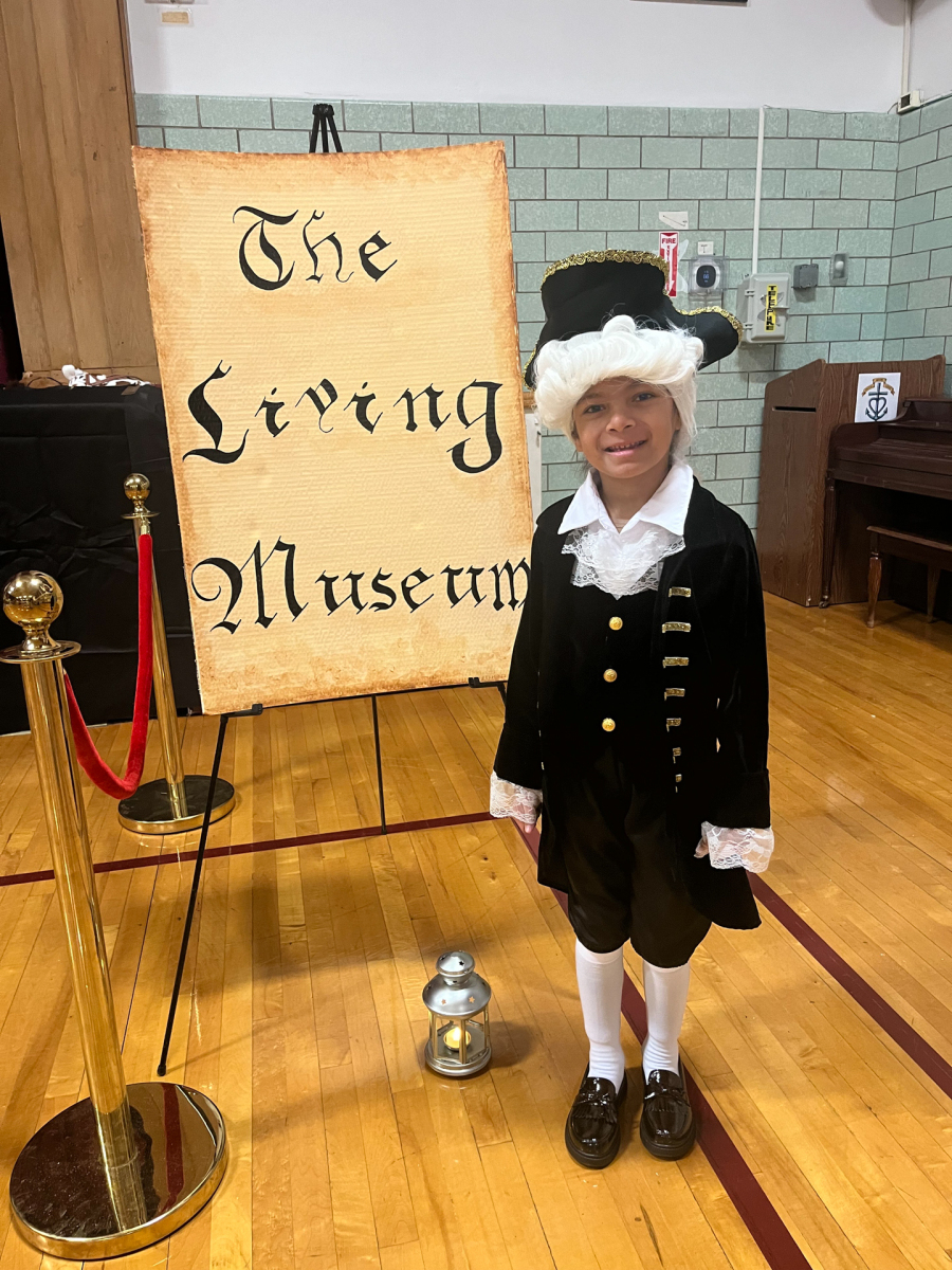 Students from pre-K to first grade depicted the life of a child in 1776 through hands-on activities such as completing chores, playing games, doing schoolwork, and participating in social dancing. Second grade brought the Founding Fathers to life through a living museum, while the third grade re-enacted the Boston Tea Party.