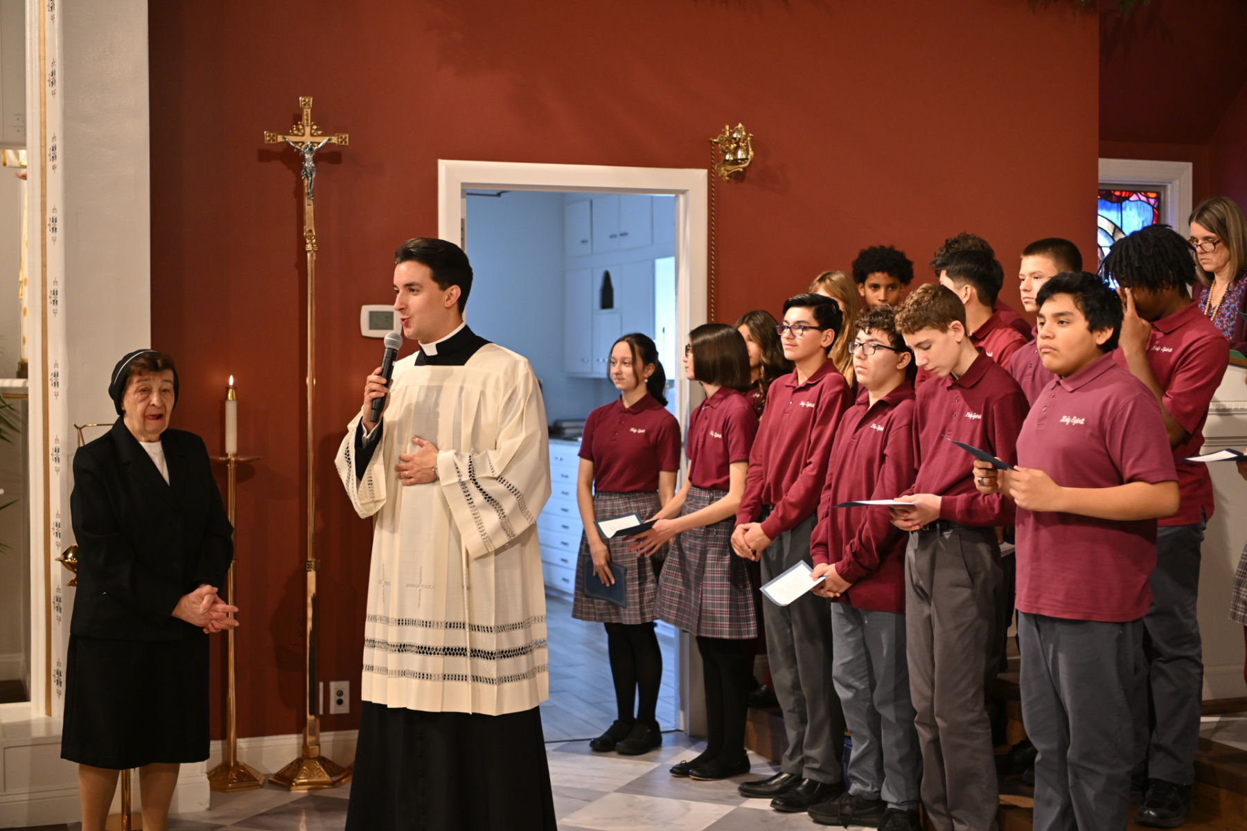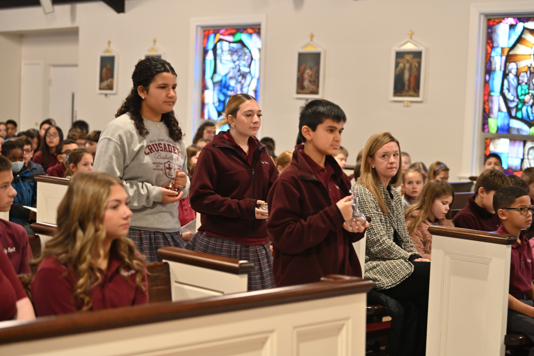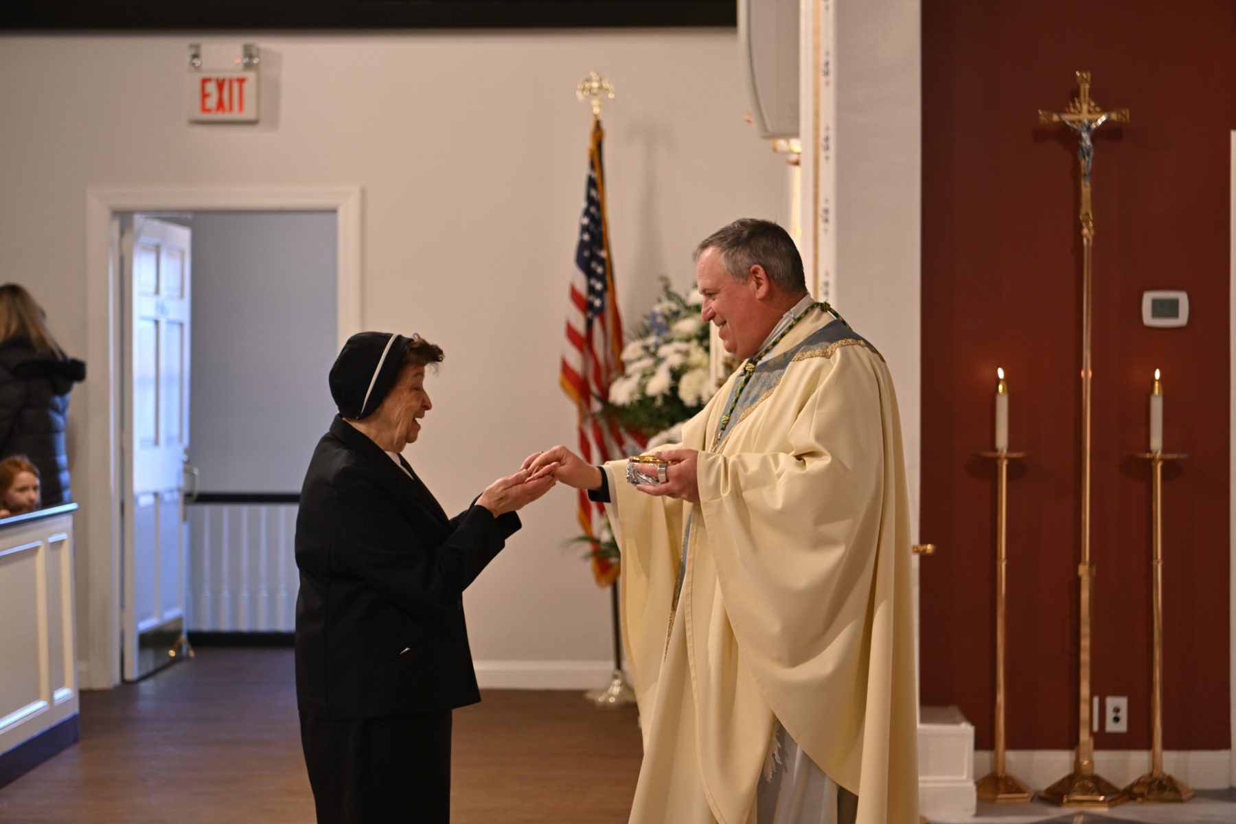 Filippini Sister Marie Antonelli, principal of Holy Spirit School, assisted Bishop Sweeney with distributing the rings to the eighth-graders during the ceremony, attended by parents, family, first- to seventh-grade students, and parishioners.