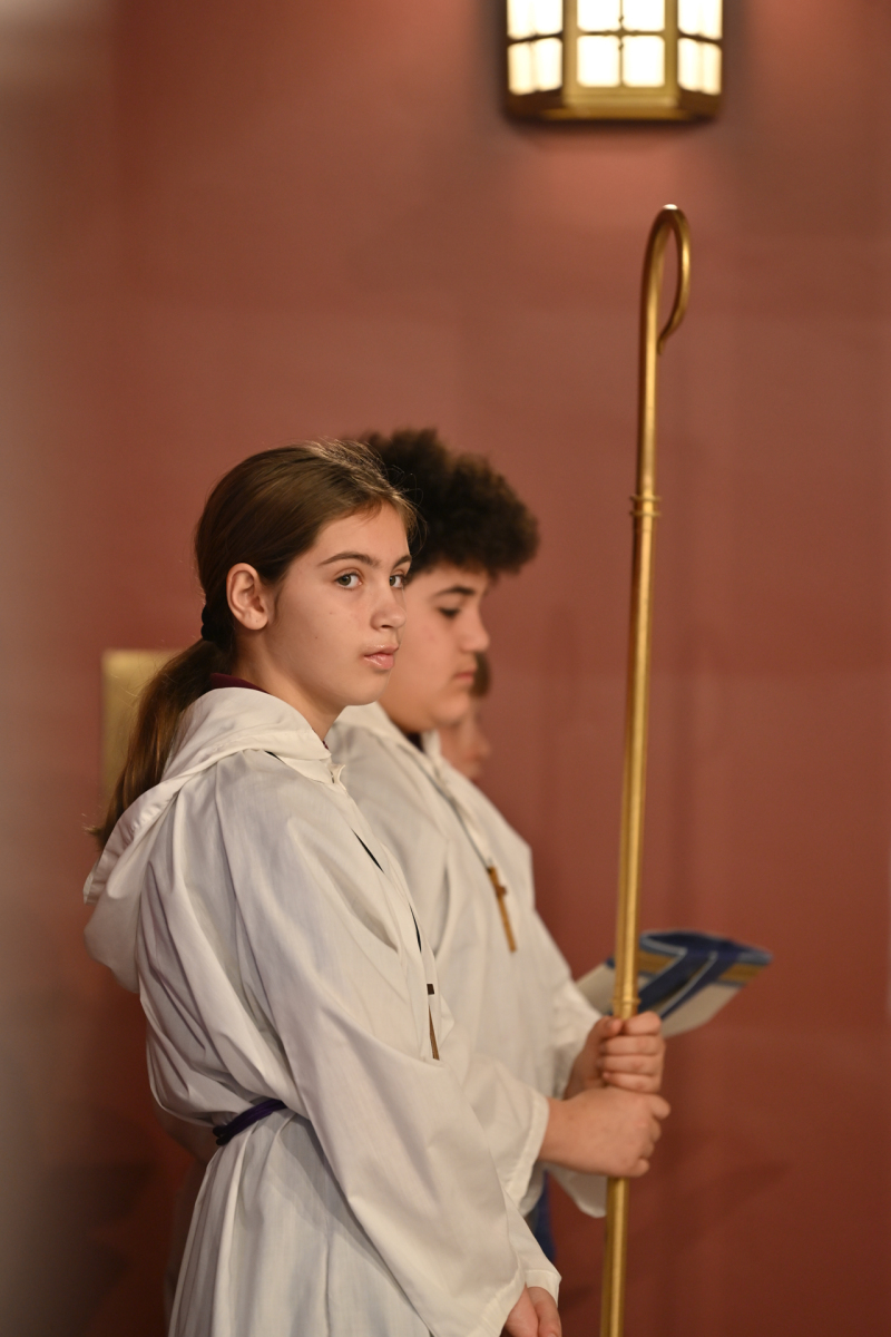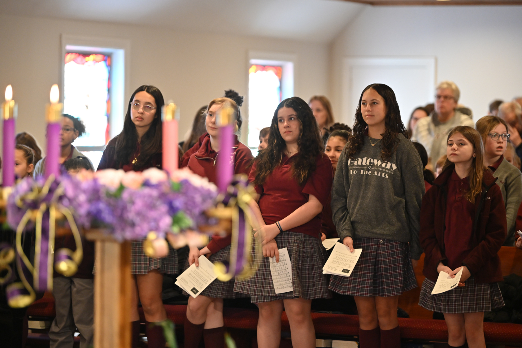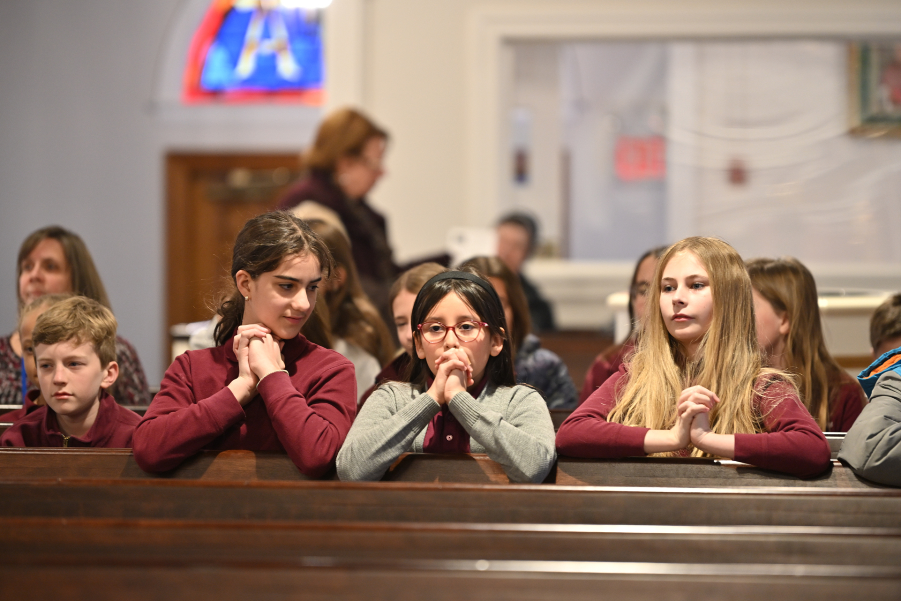 Filippini Sister Marie Antonelli, principal of Holy Spirit School, assisted Bishop Sweeney with distributing the rings to the eighth-graders during the ceremony, attended by parents, family, first- to seventh-grade students, and parishioners.