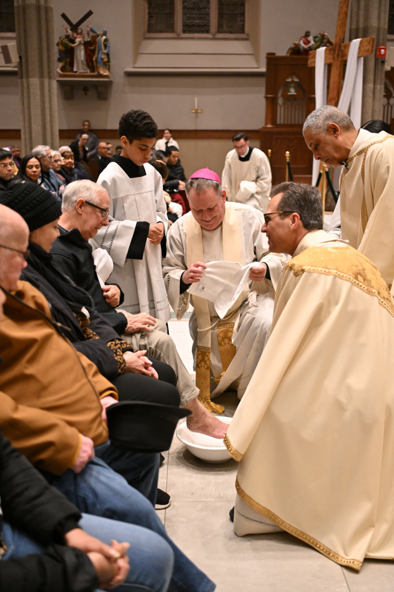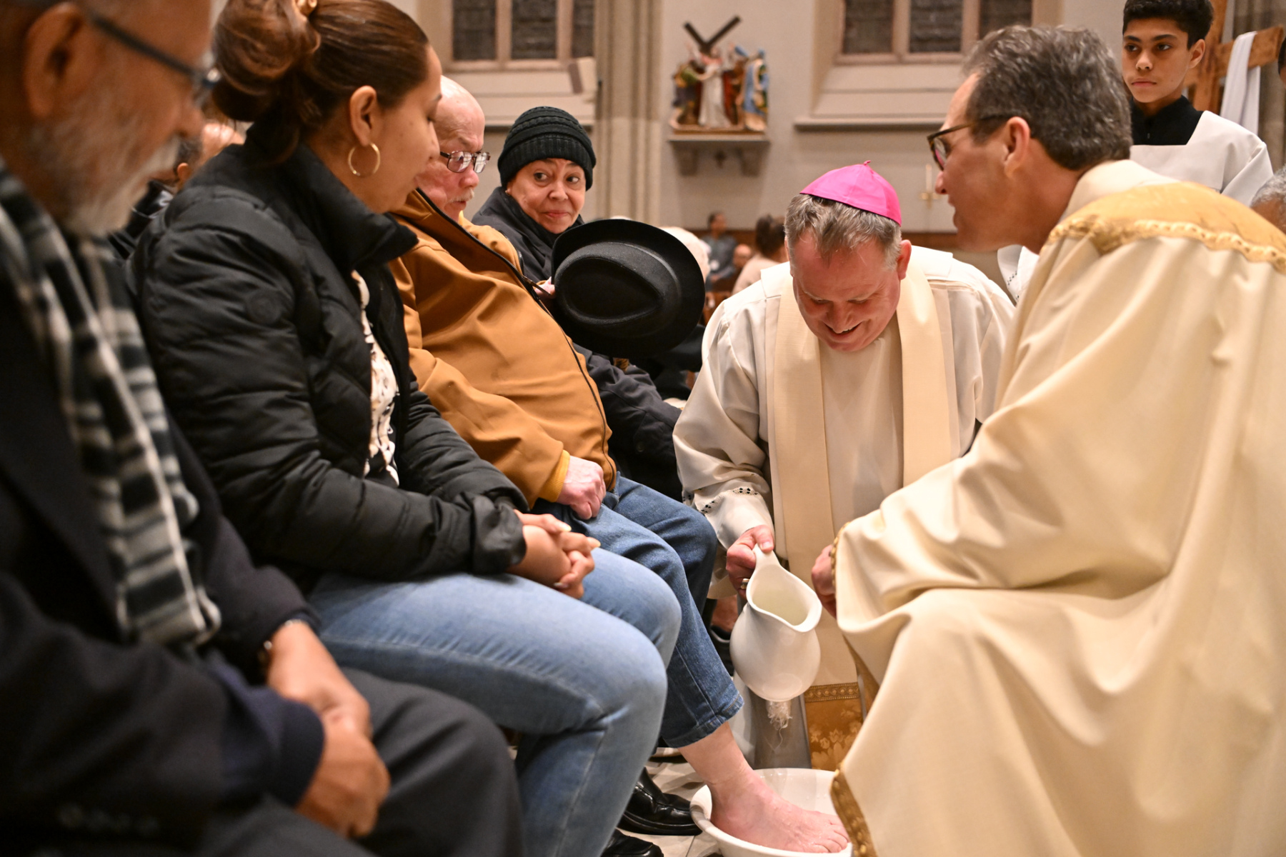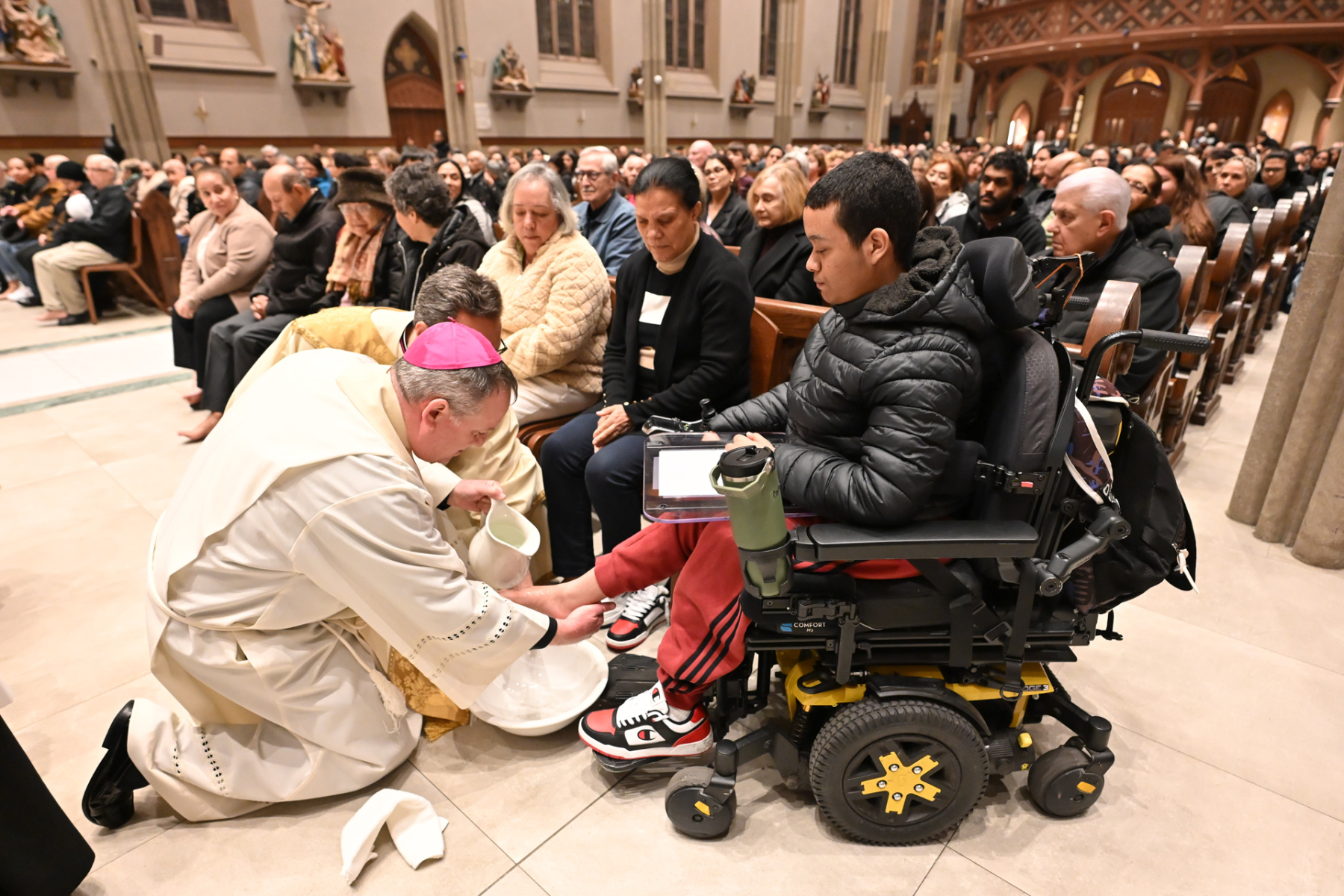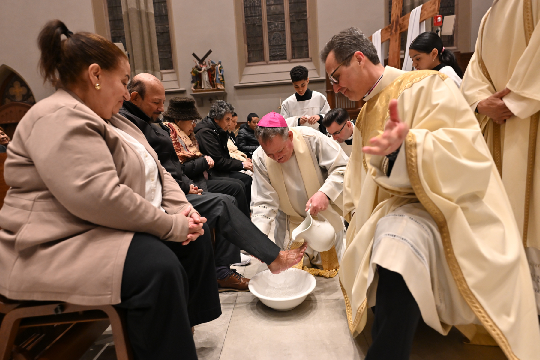 The Mass commemorates the institution of the sacraments of the Eucharist and Holy Orders by Jesus Christ. Just as Jesus washed the feet of his disciples at the Last Supper, Bishop Sweeney washed the feet of select faithful to symbolize the service and charity of Christ, who came “not to be served, but to serve.” By example of washing his disciples’ feet, Jesus demonstrated how Christians are to love one another through humble service.