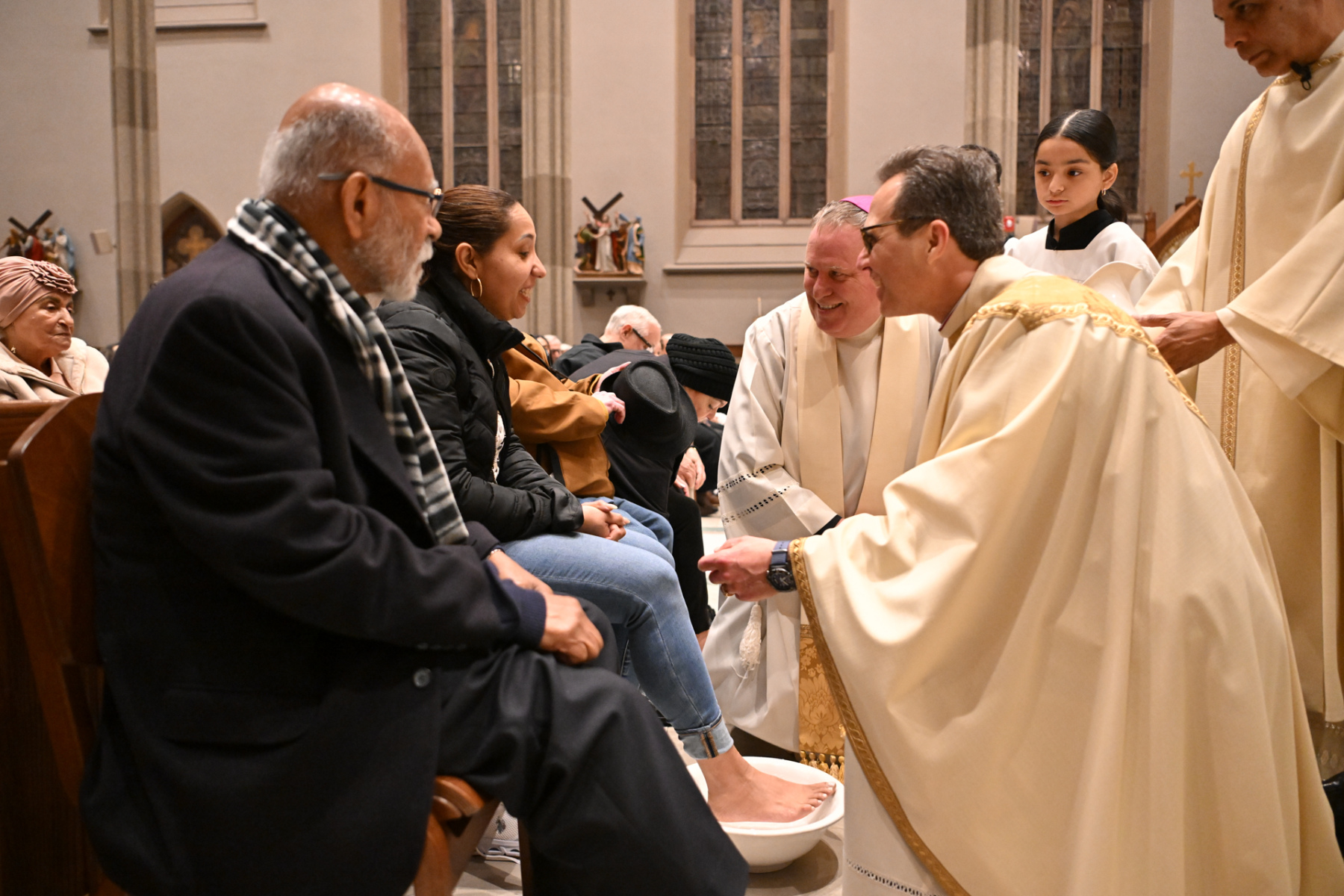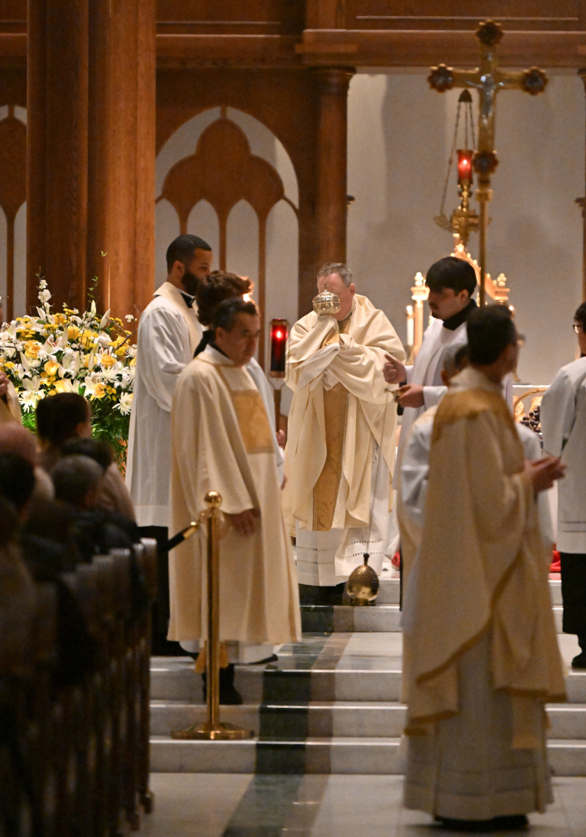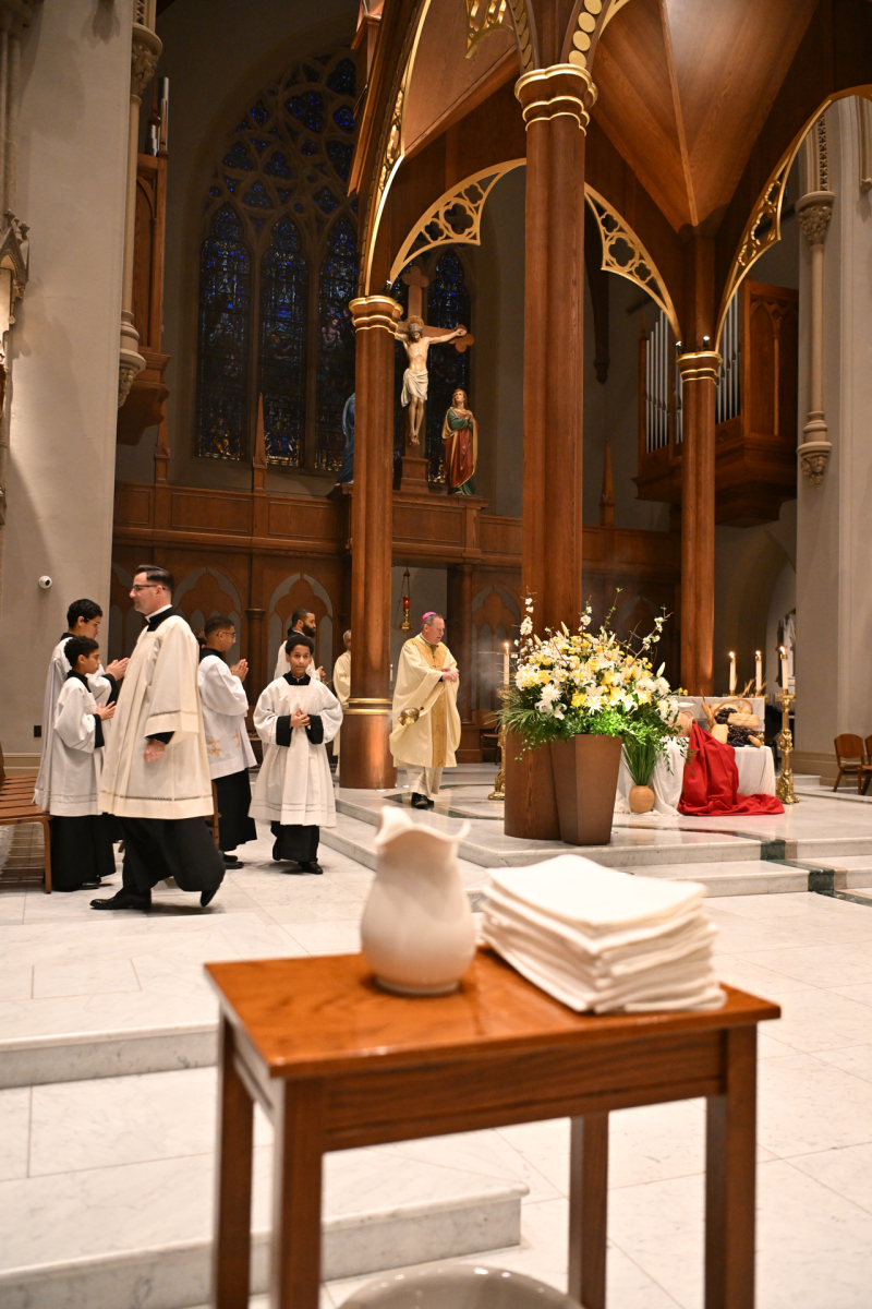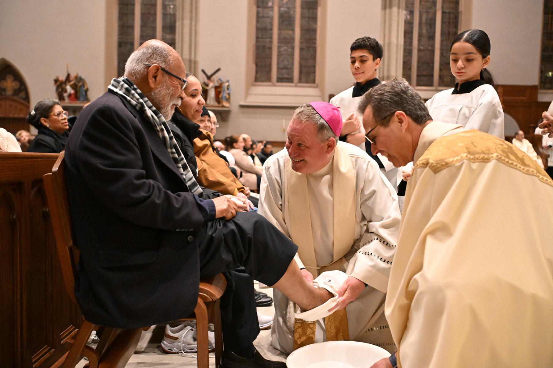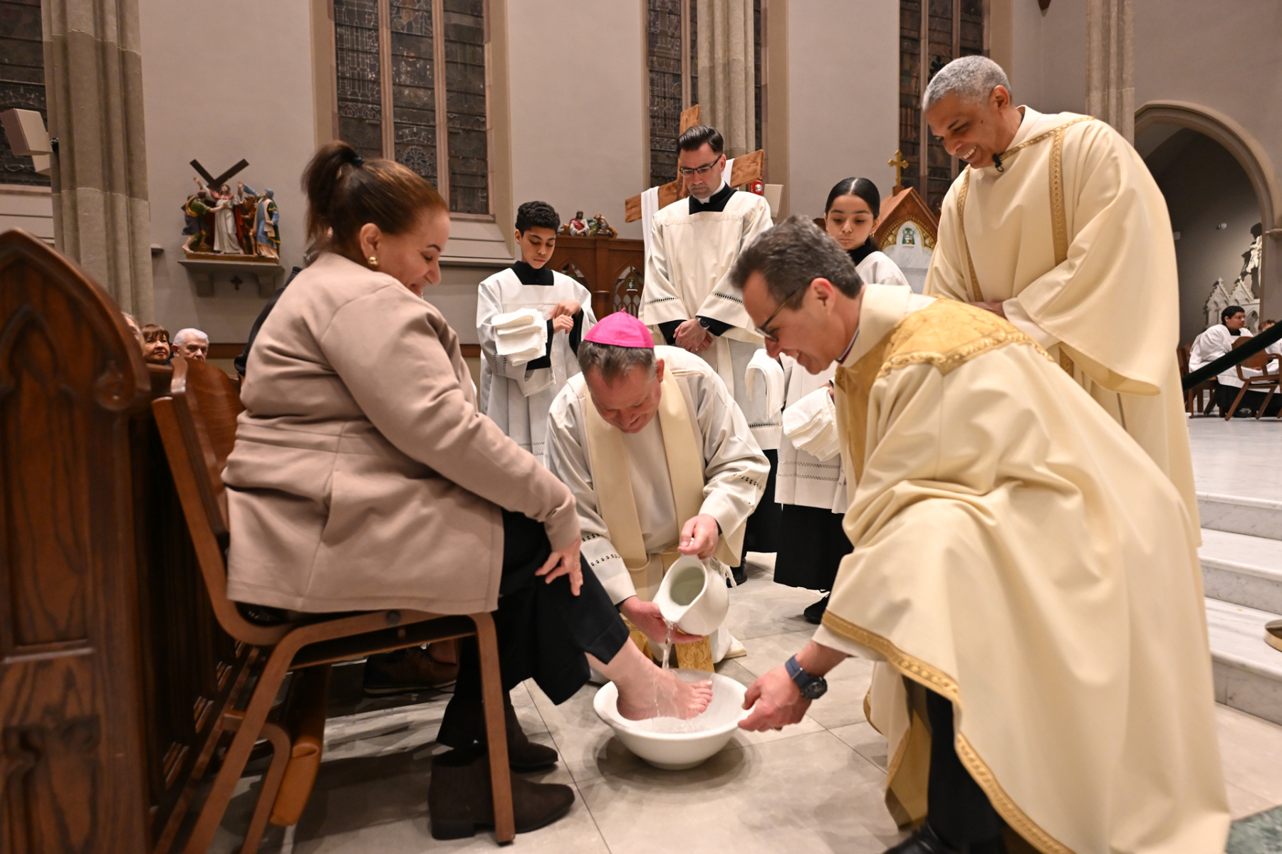 The Mass commemorates the institution of the sacraments of the Eucharist and Holy Orders by Jesus Christ. Just as Jesus washed the feet of his disciples at the Last Supper, Bishop Sweeney washed the feet of select faithful to symbolize the service and charity of Christ, who came “not to be served, but to serve.” By example of washing his disciples’ feet, Jesus demonstrated how Christians are to love one another through humble service.