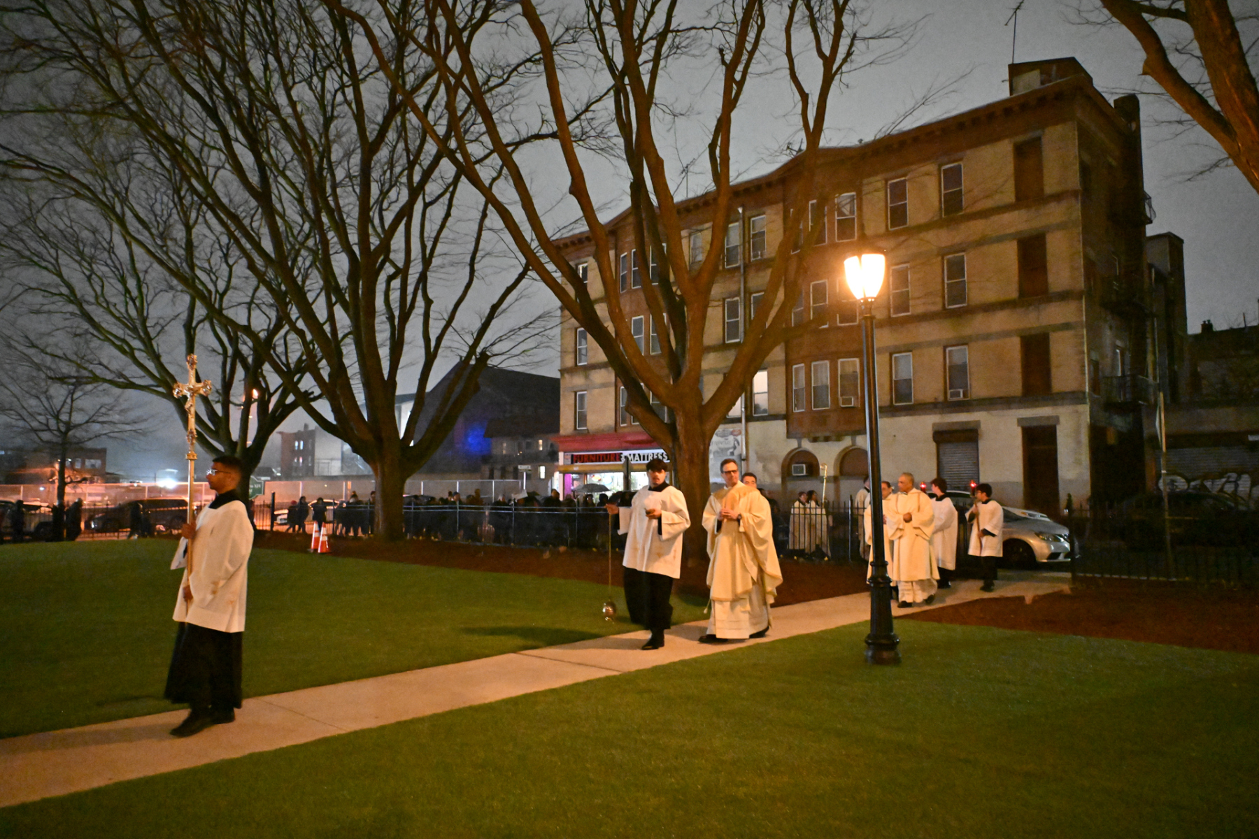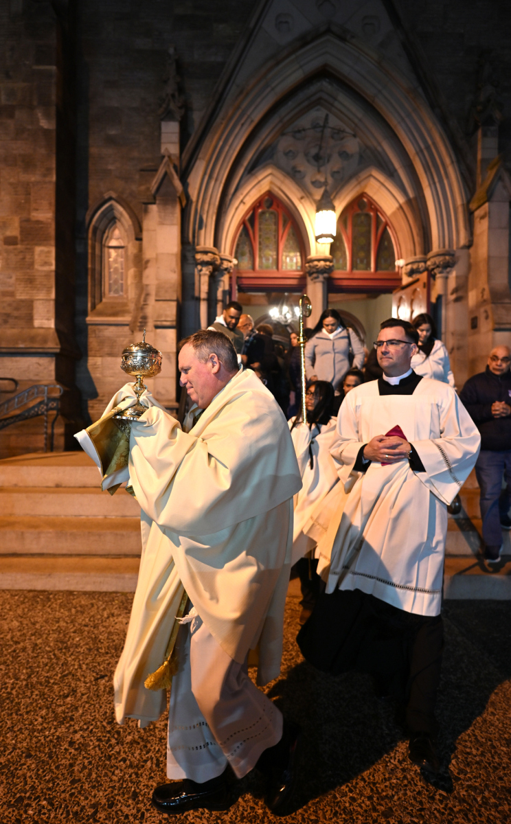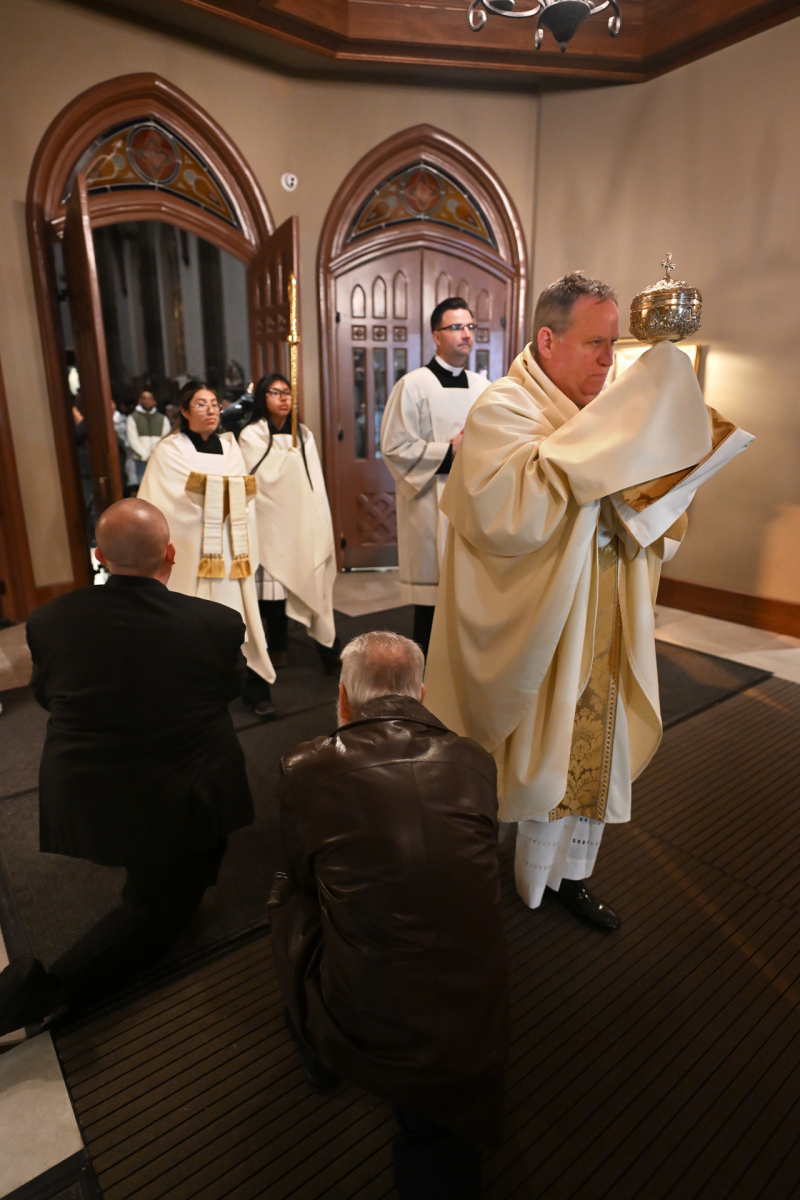 The Mass was followed by an outdoor procession with the Blessed Sacrament to the gym, where adoration was held until midnight.
