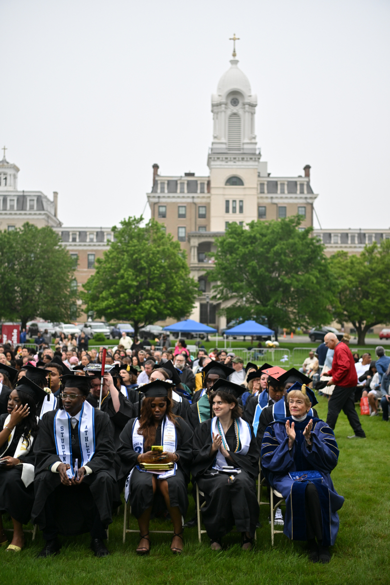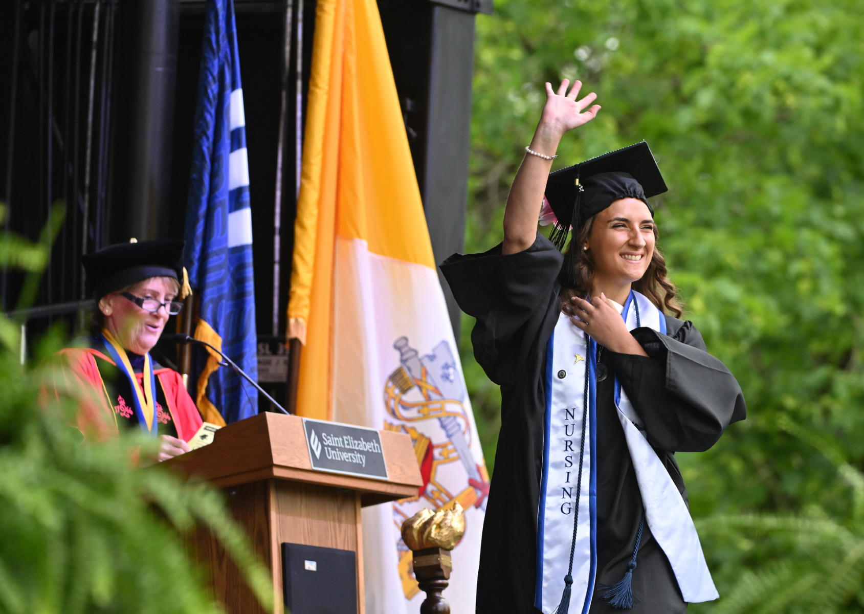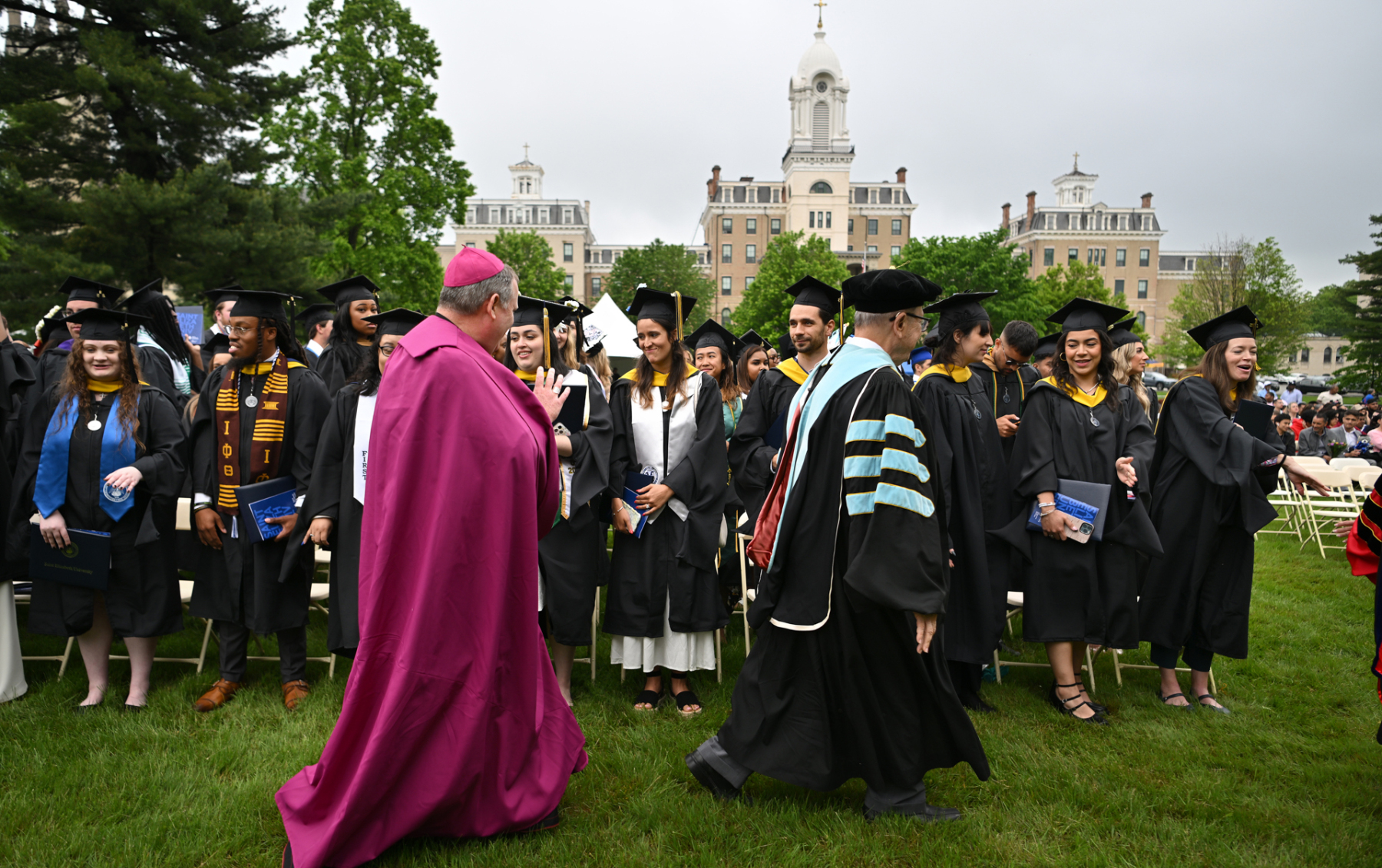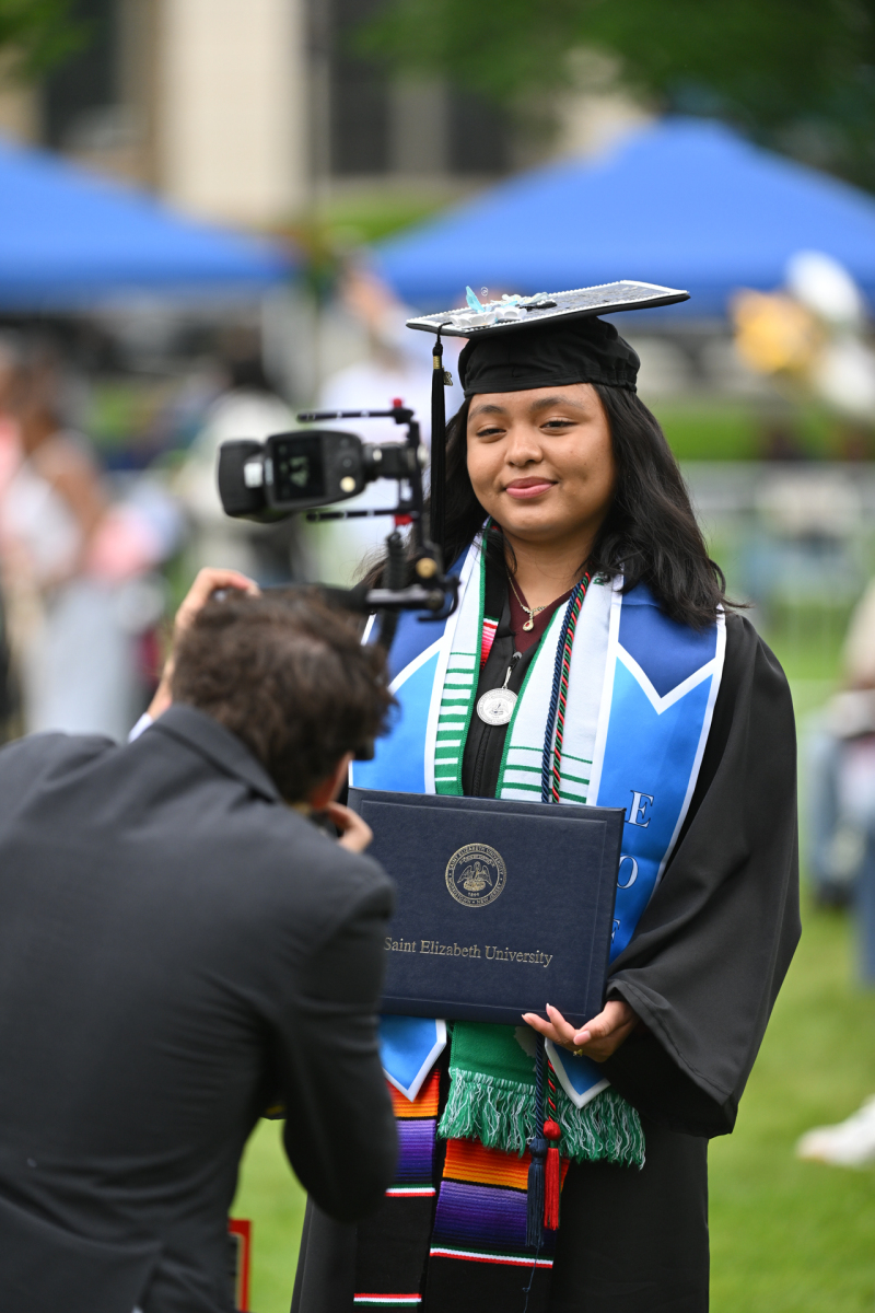 Saint Elizabeth University in the Convent Station neighborhood of Morris Township held its 123rd commencement for the proud graduates of the Class of 2025 who received their academic degrees on May 15. The ceremony occurred on the front lawn of the motherhouse of the Sisters of Charity of St. Elizabeth, who founded and continue to operate the university. Bishop Kevin J. Sweeney and Gary B. Crosby, Ph.D., Saint Elizabeth’s president, were among those who participated in the commencement. Hope Dmuchowski, who earned a bachelor’s degree in psychology in 2001 and a master’s in business management in 2006 at Saint Elizabeth’s, was the commencement speaker. She is senior executive vice president and chief financial officer for First Horizon Corporation.
