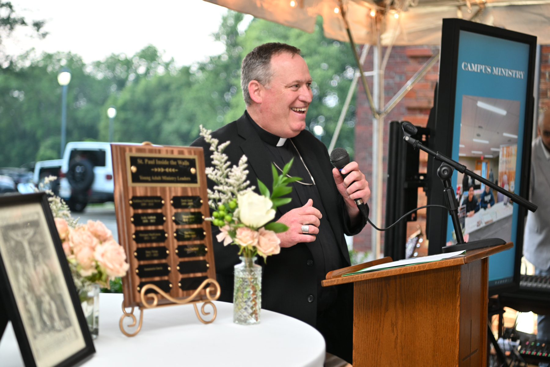 The event’s 125 attendees included staff from St. Paul’s, members of the Young Adult Ministry, benefactors, and friends and family of community members. Bishop Kevin J. Sweeney and Father Paul Manning, the diocesan vicar for evangelization and education, delivered separate addresses on St. Paul’s. The event included a dinner.