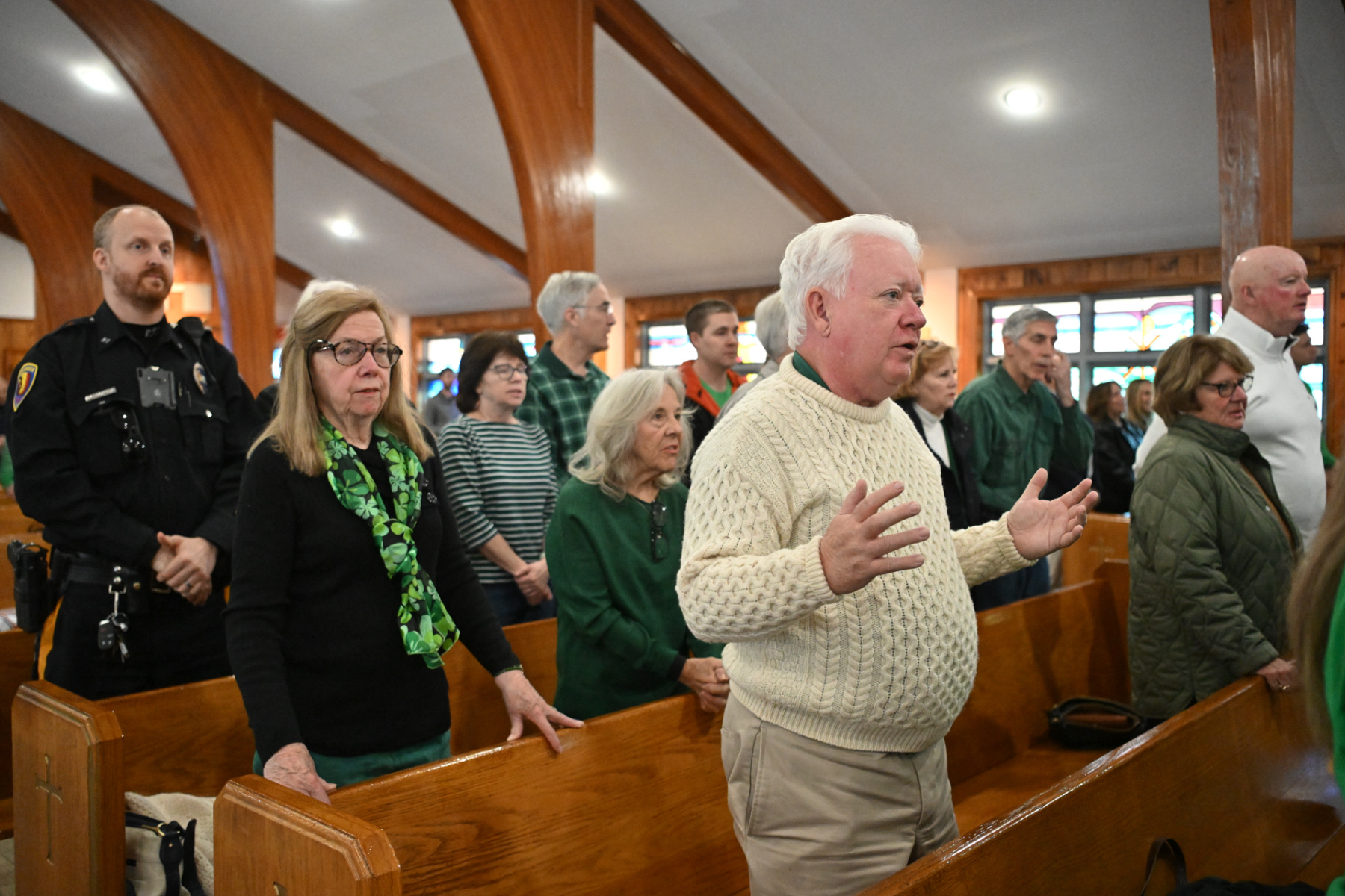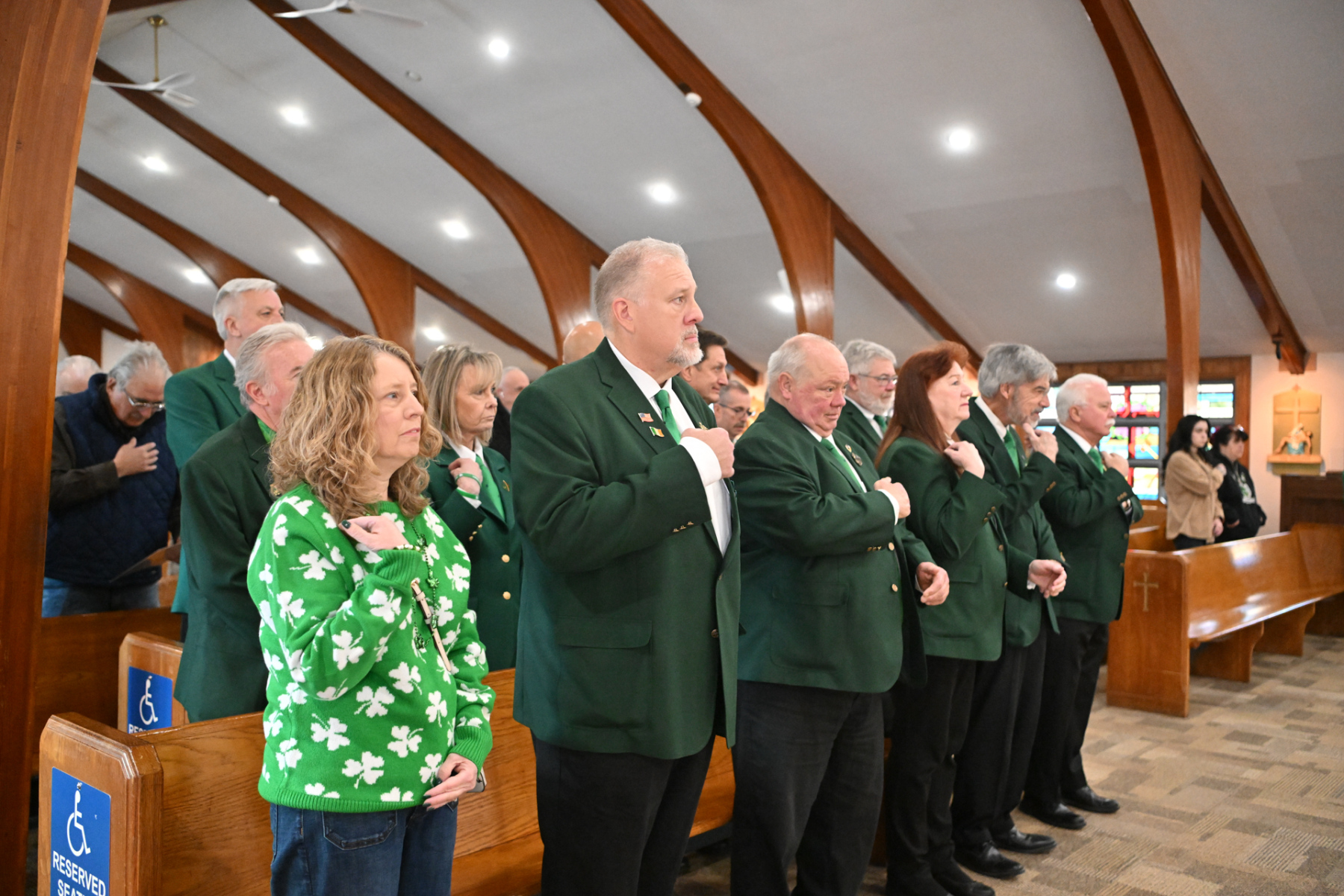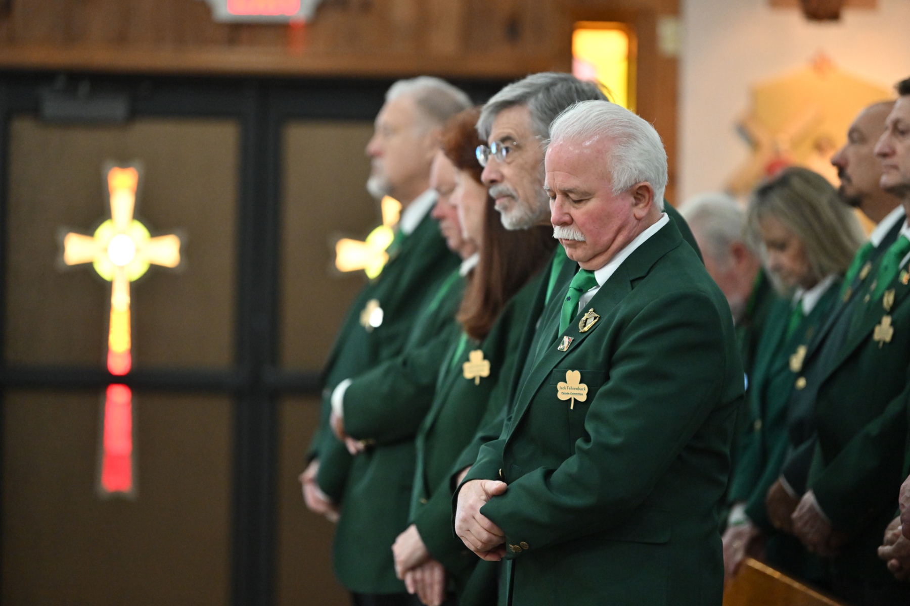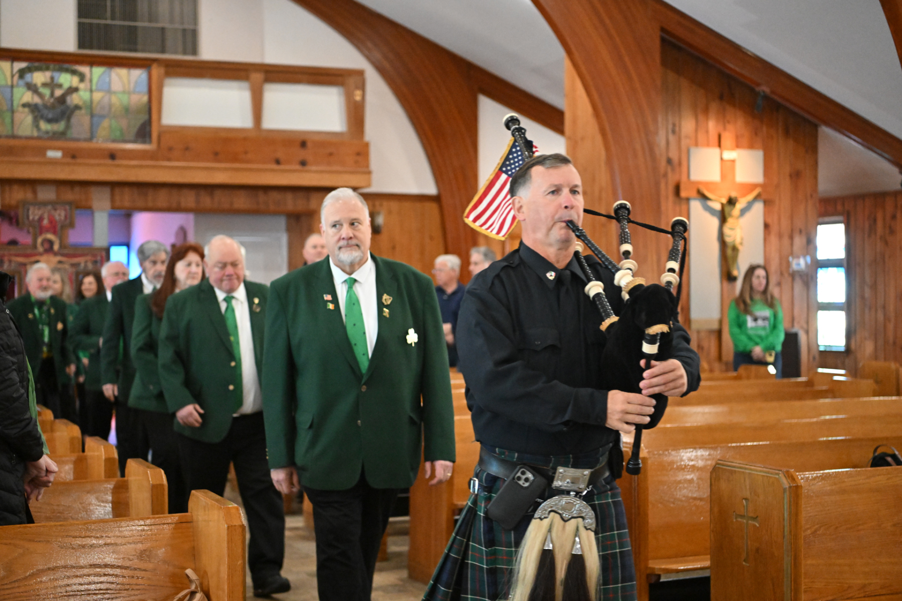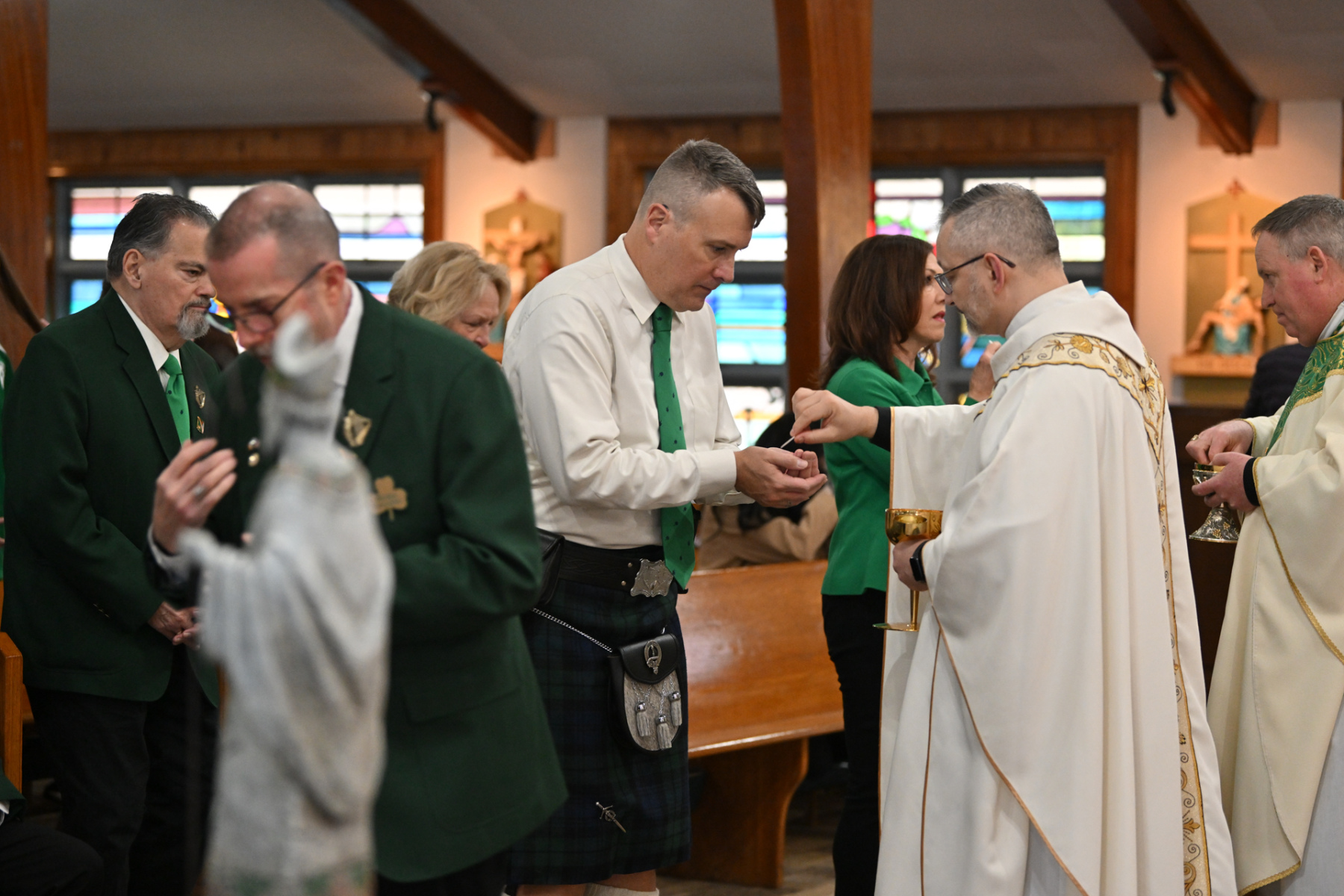 Parade officials and dignitaries, the Knights of Columbus, and a bagpiper were among those who participated in the liturgy, many wearing festive Irish green. This year’s parade honorees were Jim Blomquist, grand marshal; Scott Fitterman, outstanding citizen; and the late Robert Lyons and the late Dennis Law, parade dedications.