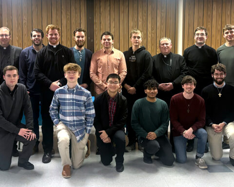 More than 45 men from parishes in the Paterson Diocese and the Newark Archdiocese attended the latest Called to Courage Men’s Retreat at Sacred Heart Retreat Center in Newton. Father Daniel Murphy, a retired Paterson priest, and the Called to Courage Team led the weekend retreat, guided by the theme “Wrestling with God” — struggling with the challenge of living up to being one holy, Catholic, and apostolic church.