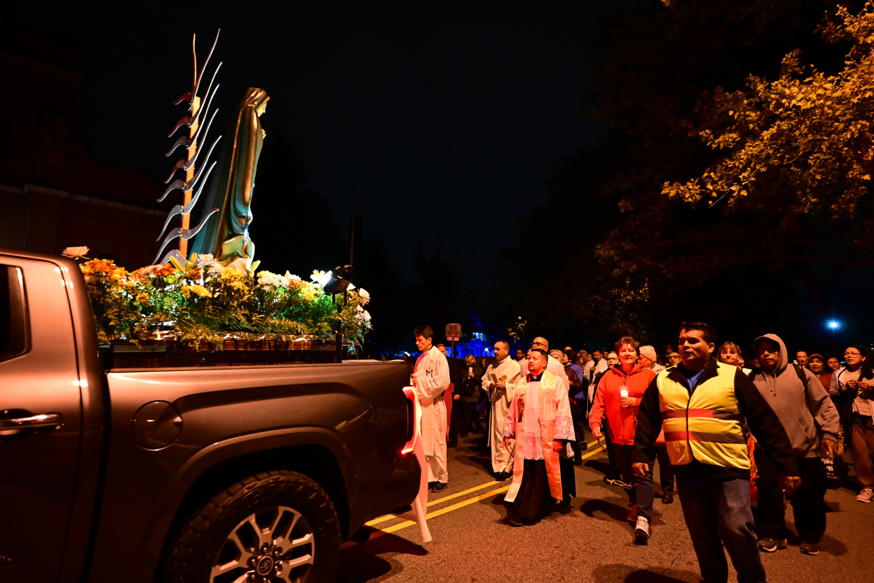 On a mountain of white flowers, a statue of Our Lady of Guadalupe stood on the bed of a pickup truck. Each parish also carried statues of the Blessed Mother along with banners displaying the parish’s name.