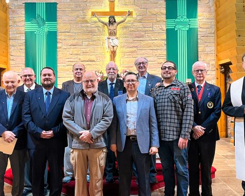 Last year, the Bishop McLaughlin Council 3495, a Knights of Columbus chapter affiliated with St. Virgil’s Parish in Morris Plains, N.J., formed a Charity, Unity, & Fraternity (CUF) team to support a Paterson Federation CUF degree and fraternal benefit event at the parish. Grand Knight Gary Richenaker and CUF ceremony team leader Deputy Grand Knight Dan Andretti led more CUF degree ceremonies this year, according to District Deputy Mike Spiecker. In addition to Exemplifying new brothers into the council, the ceremonies have been attended by members of other area councils. The latest ceremony on March 10 (pictured) brought the council to 100 percent of its membership goal for the current year.