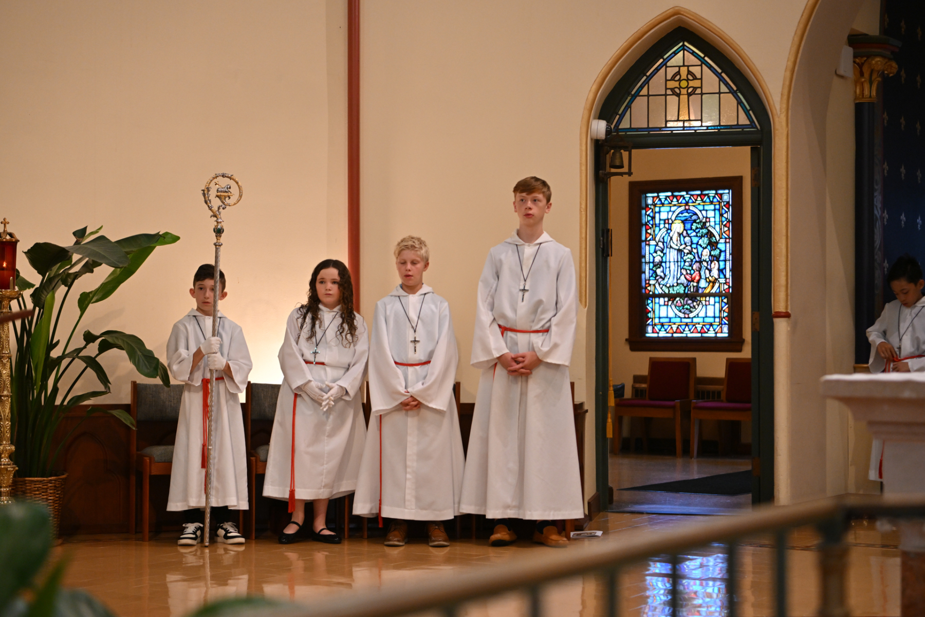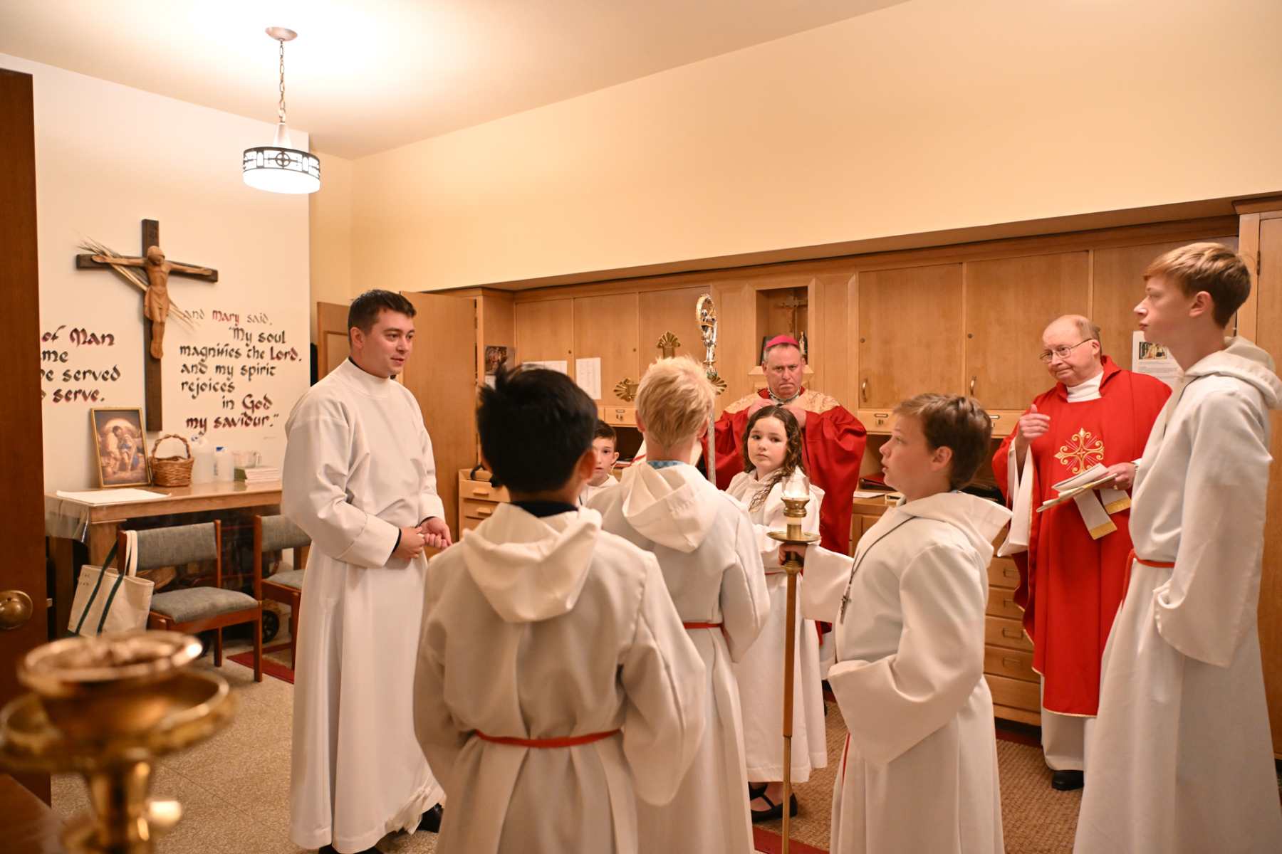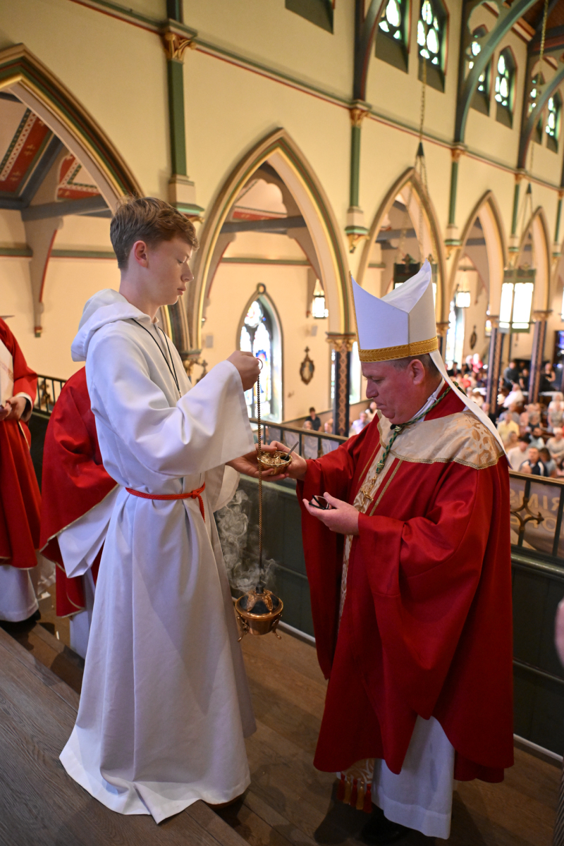 Kusler used the new organ to lead the choir and congregation in hymns of praise, accompanied by the Brass Quartet and Timpani during the June 29 Mass. The organ case features a fleur-de-lis design, a symbol associated with the Blessed Virgin Mary, which matches similar images found throughout the worship space’s design.