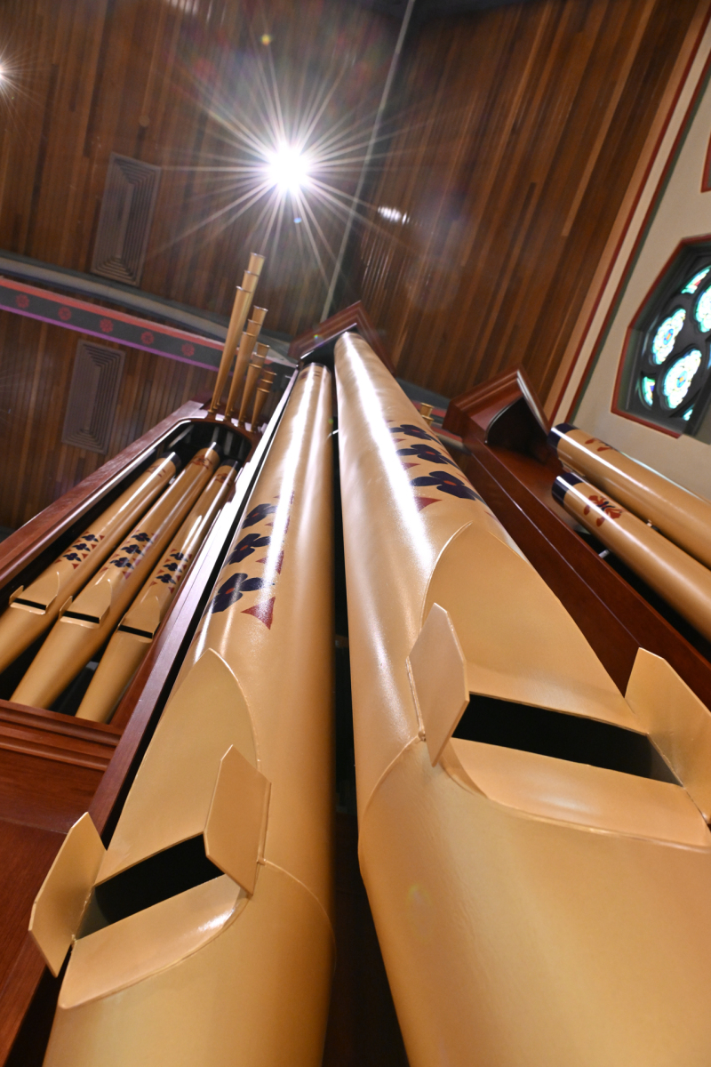 The new organ’s dynamic sound originates from 33 ranks (sets) of new pipes, with 2,024 speaking pipes. Three ranks were retained from the old organ pipes that Peragallo was able to salvage. The organ has 36 digitally sampled stops, or sounds, including ones for trumpets and tuba.