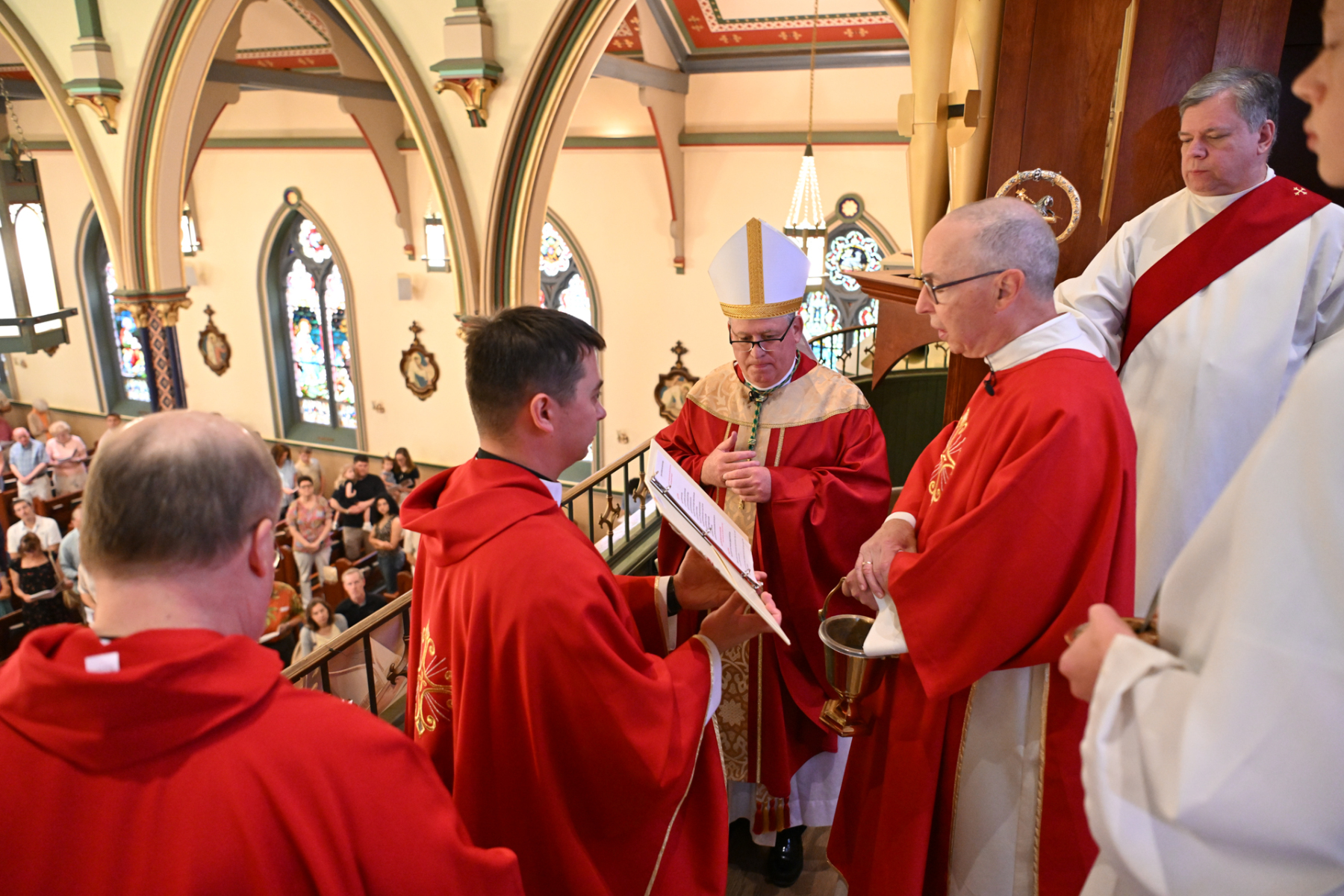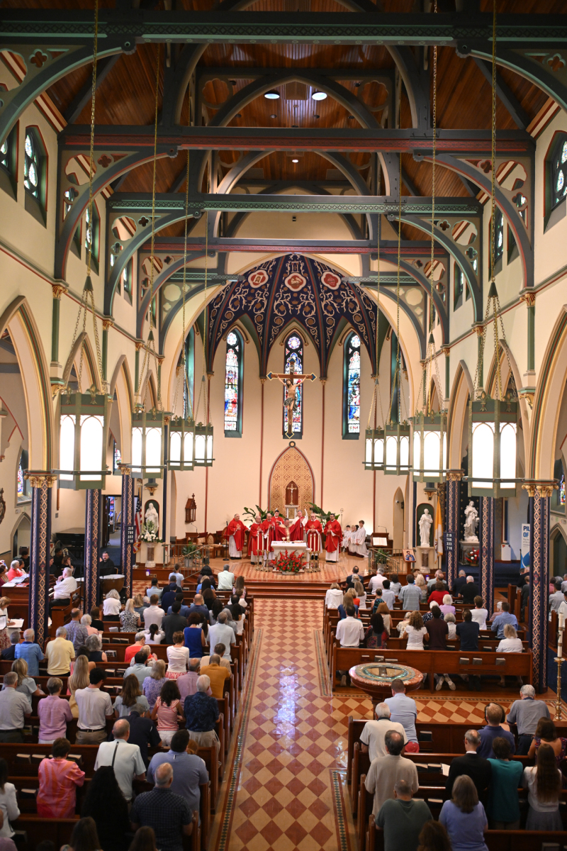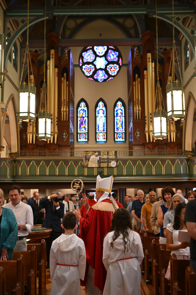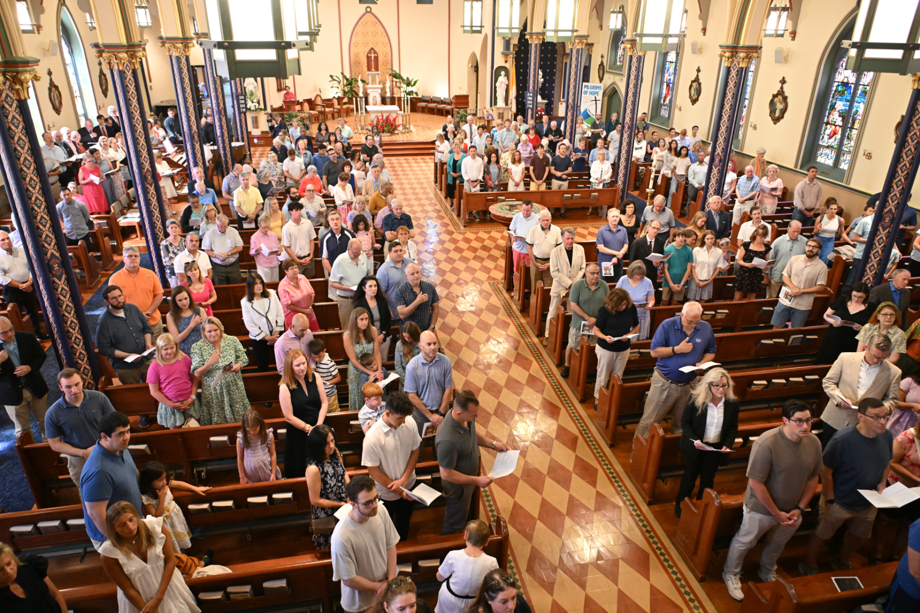 After the Mass, the parish community gathered for light refreshments in Rauscher Hall. There, Bishop Sweeney blessed a plaque with the names of the donors to the Faith, Family, Future Capital Campaign, which celebrated the 175th anniversary of the Gothic Revival style church. Msgr. John Hart, Assumption’s pastor, thanked the donors for their generosity and Kusler and the parish organ committee for their work on the new organ project.