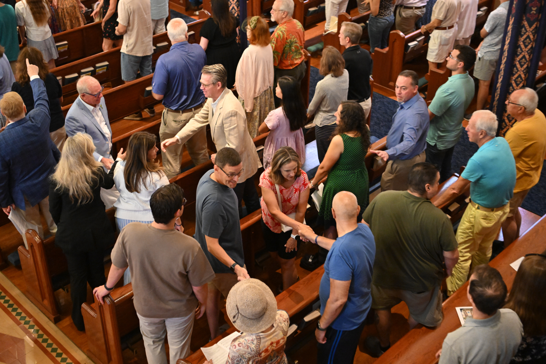 “It’s a beautiful instrument. It’s a joy to play,” said Paul Kusler, Assumption’s music minister. He played flourishes before the start of Mass to introduce the congregation to the organ’s new sounds. He then started the liturgy with the hymn “All People on Earth Did Well,” also known as the Old 100th Psalm Tone. “The people were smiling. They were happy. I was happy to show the organ’s grander and softer sounds. The organ plays like a choir. All the voices blend nicely.”