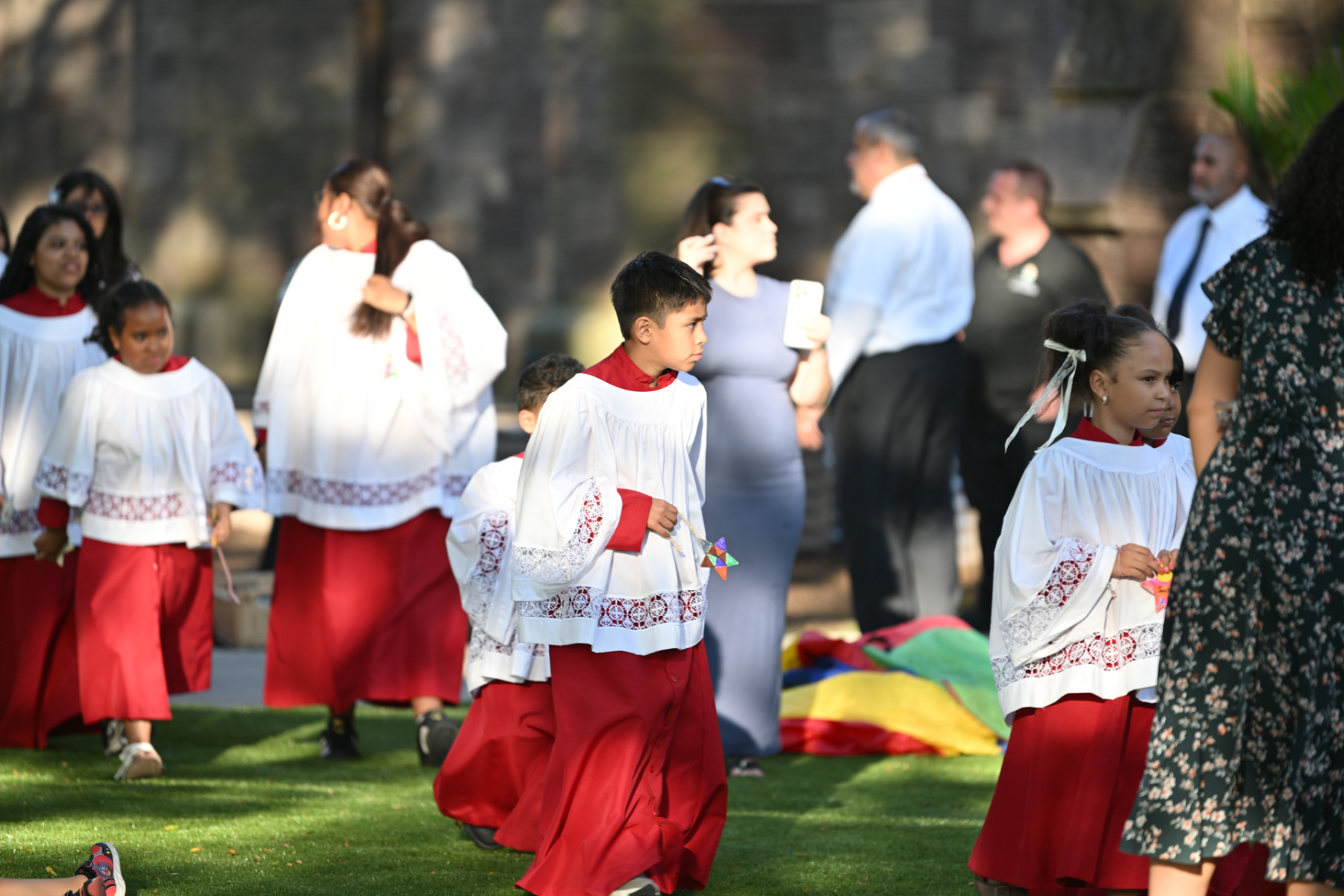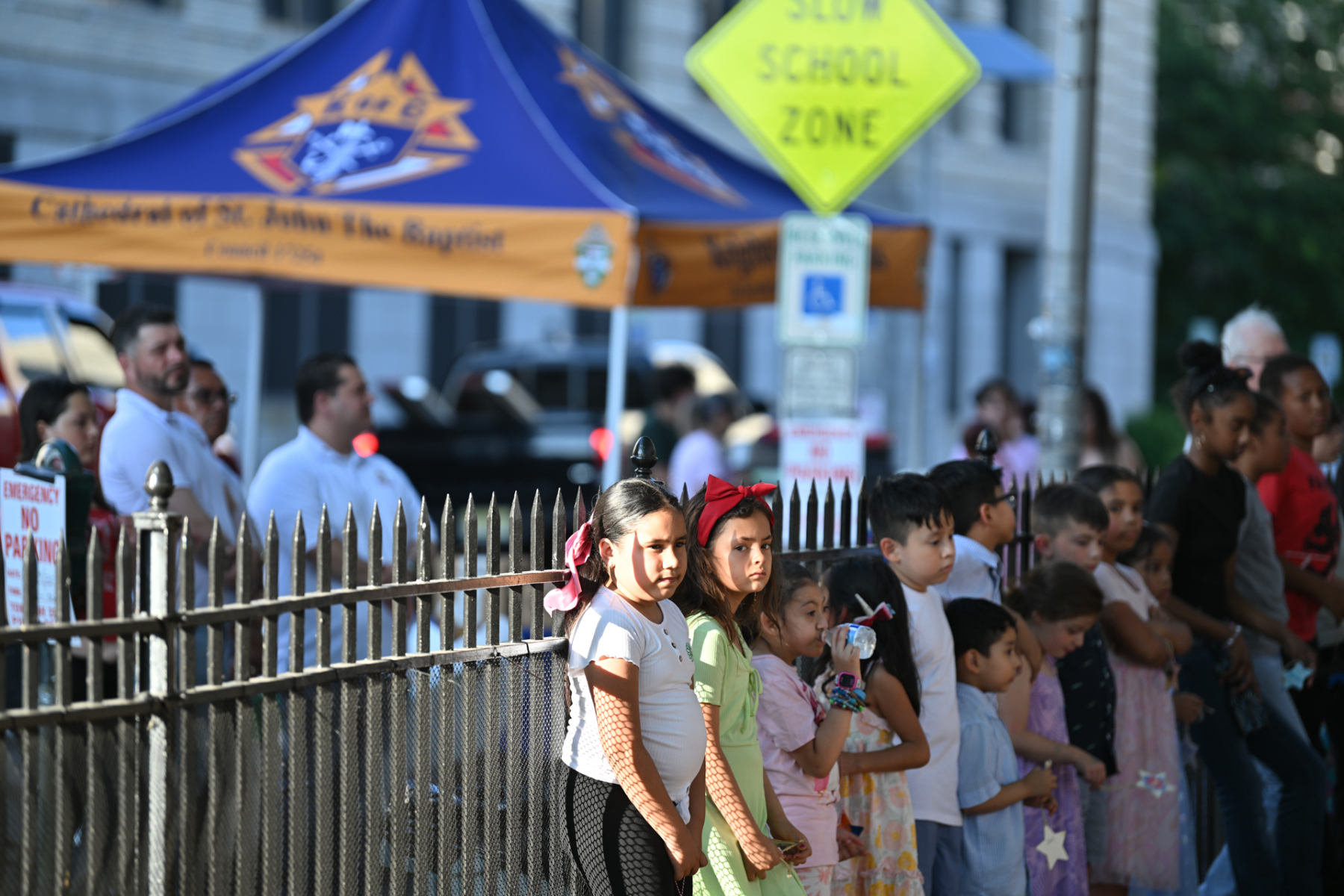 After the Mass, worshippers returned to DeGrasse Street for a celebration that included music, treats, and fellowship. Many children played on the field with special frisbees bearing an image of the cathedral.
