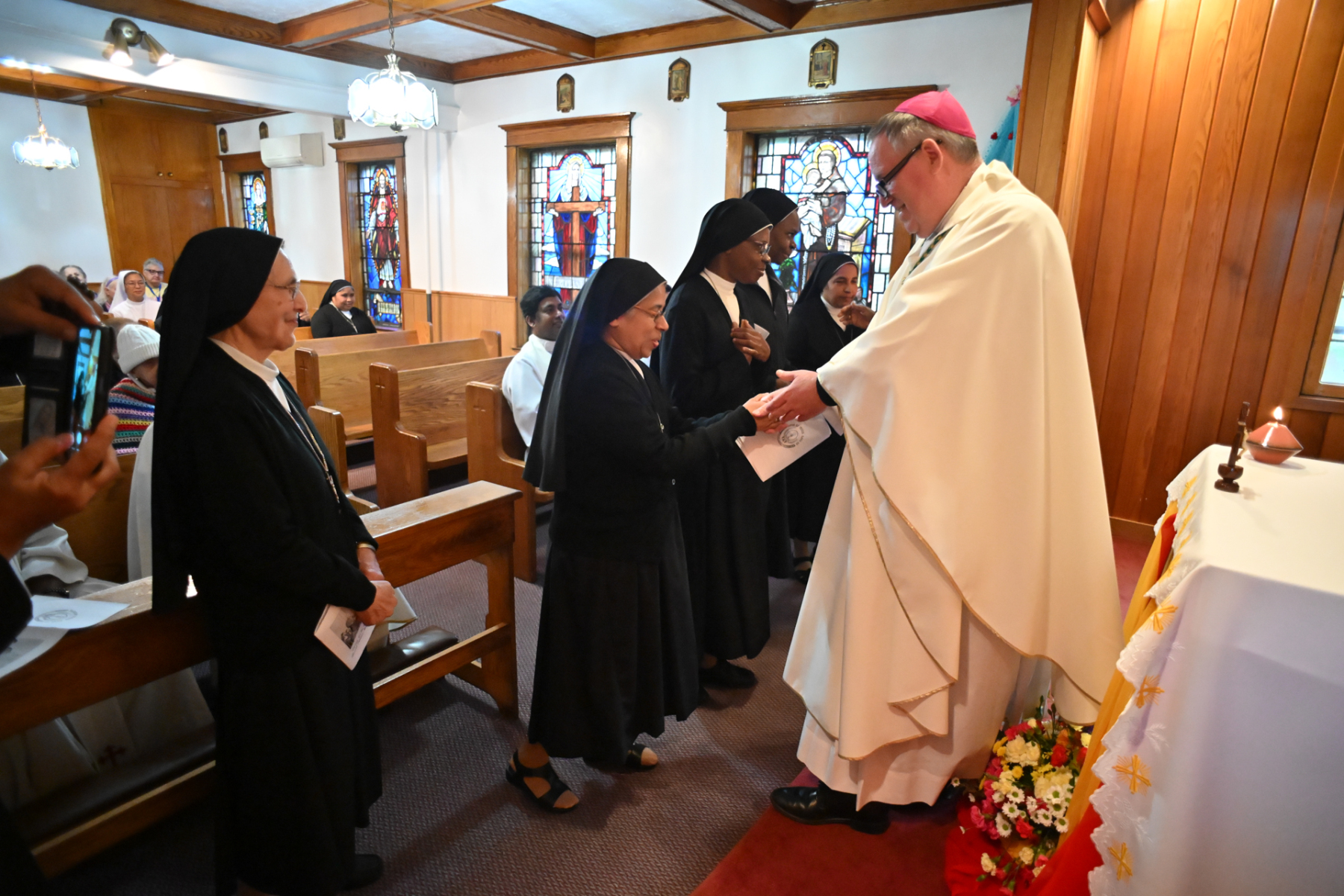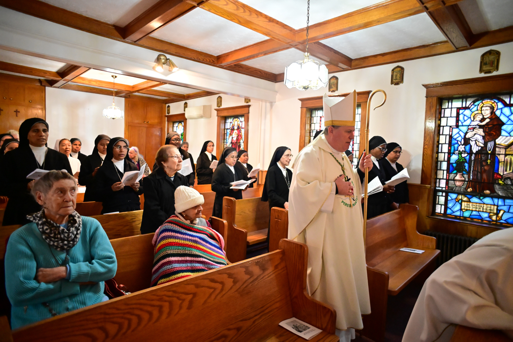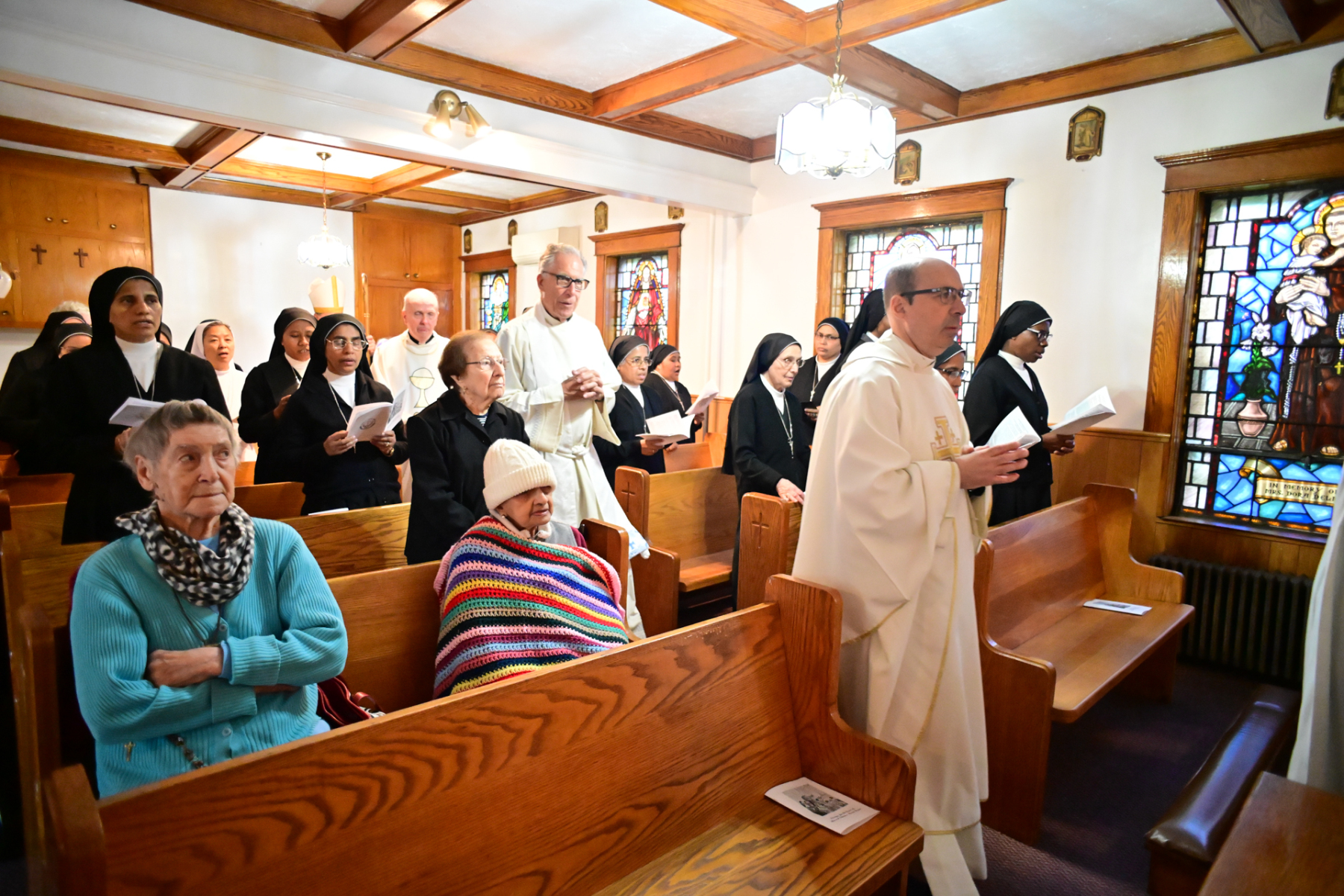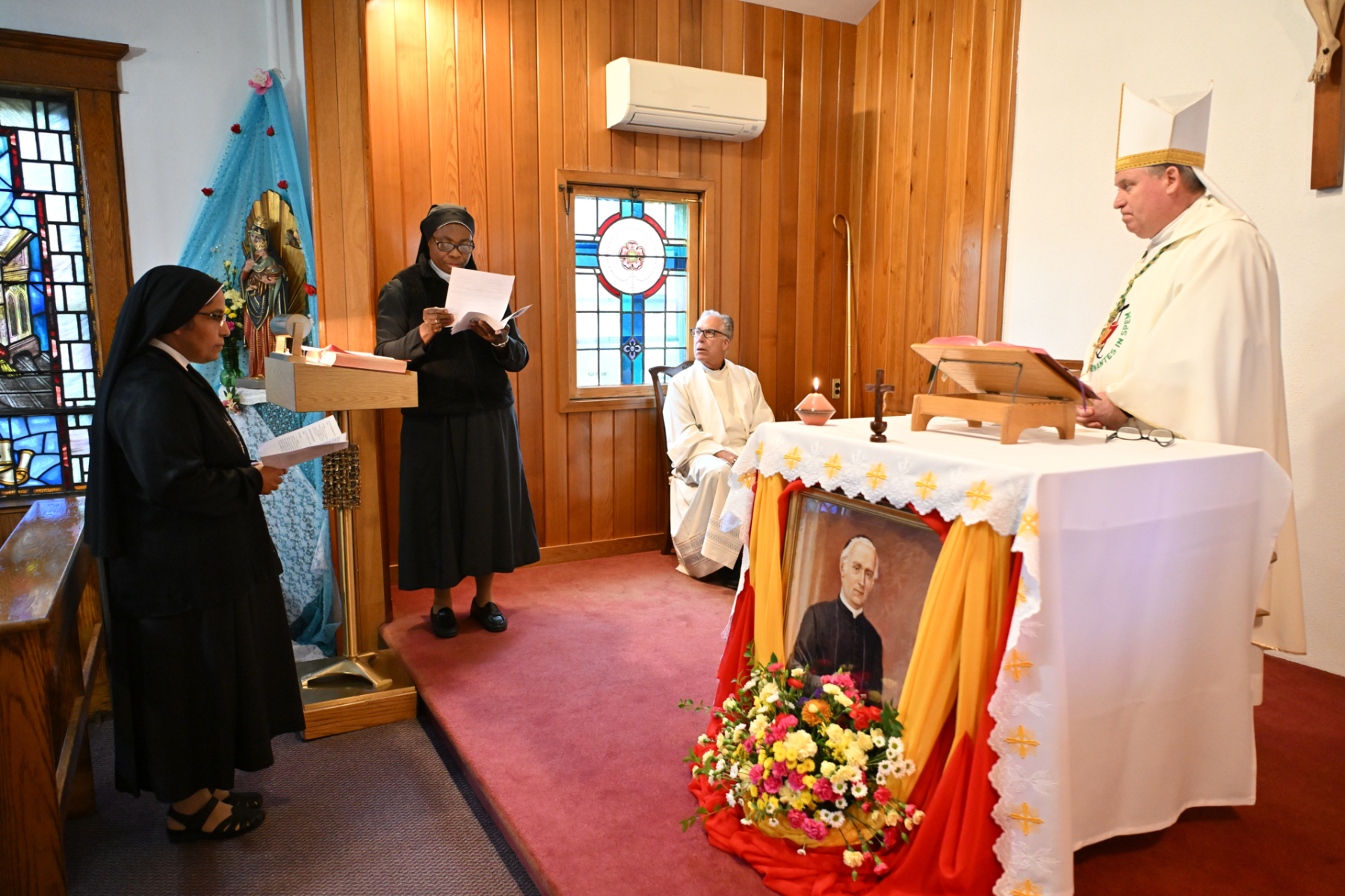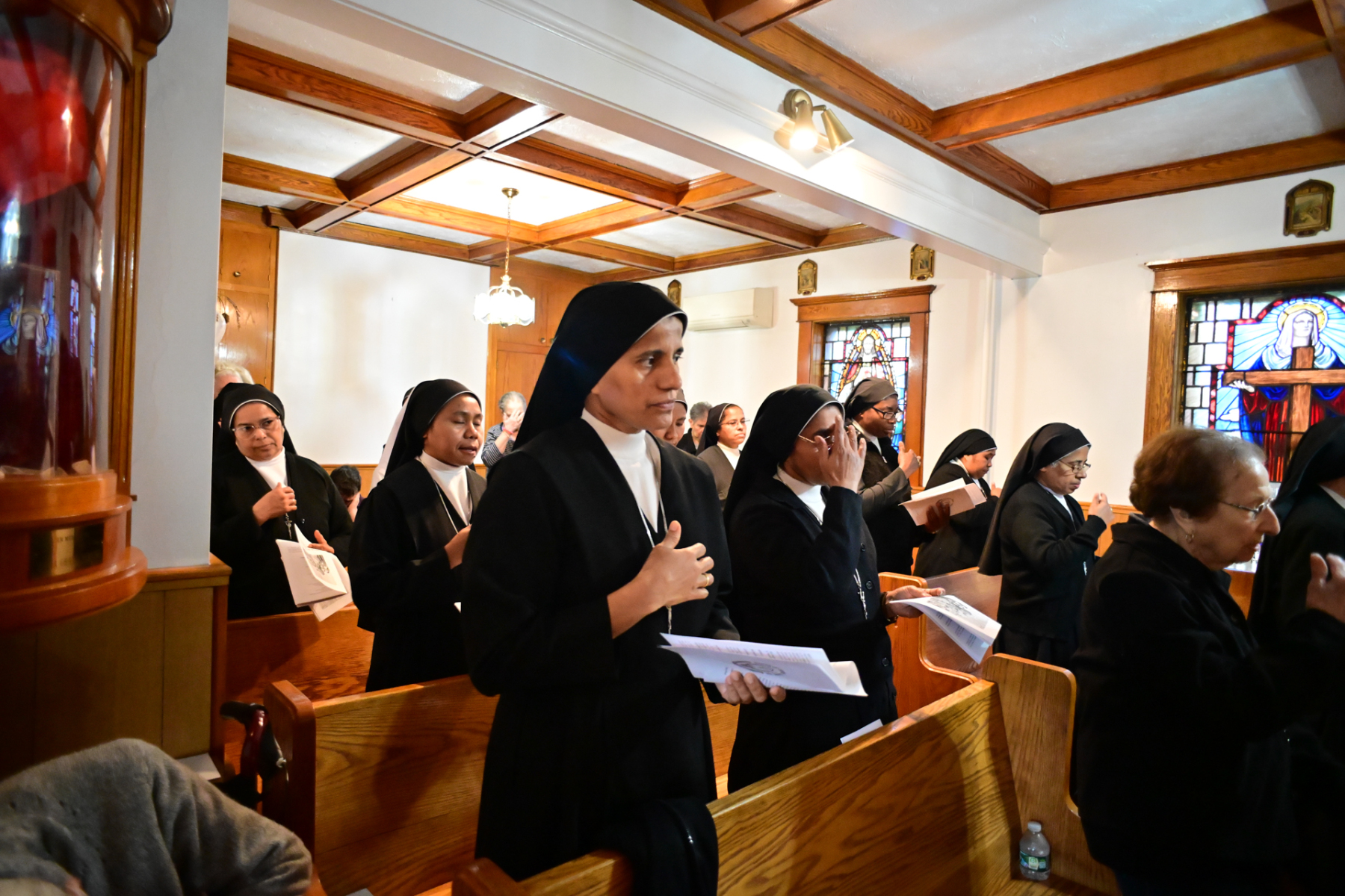 Bishop Sweeney was the main celebrant and homilist of the Mass. The concelebrants were Father Charles Waller, a retired diocesan priest and chaplain to the sisters; Msgr. George Hundt, pastor of St. Gerard Majella and Our Lady of Pompei parishes, both in Paterson; Father Marc Mancini, pastor of St. James of the Marches Parish in Totowa, N.J.; Father Manuel Alejandro Cuellar, parochial vicar of St. Gerard Majella and Our Lady of Pompei; and Father Erasmus Okere, parochial vicar of Blessed Sacrament/St. Charles Borromeo Parish in Newark, N.J. These priests were joined by Father Simmy Thomas, the parish vicar of St. George Syro-Malabar Catholic Church, also in Paterson.