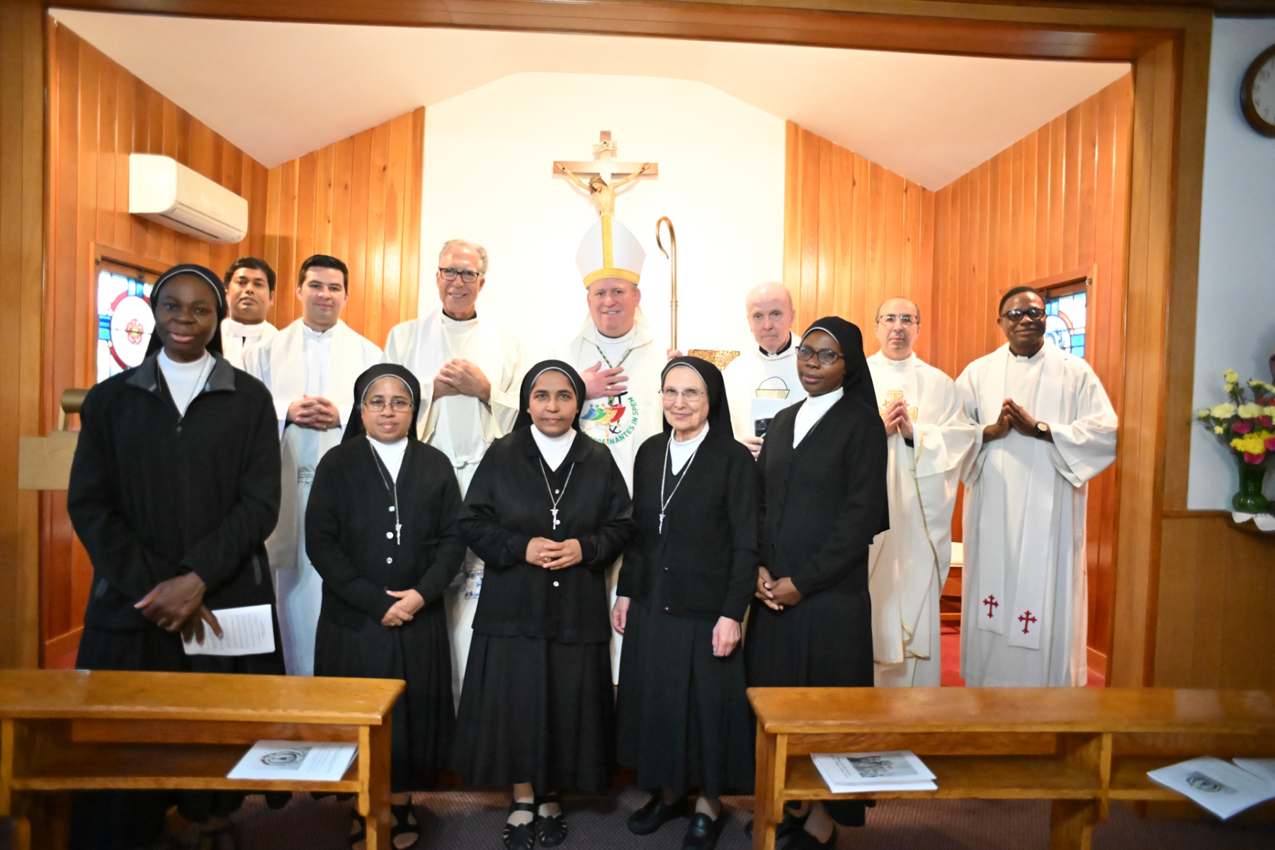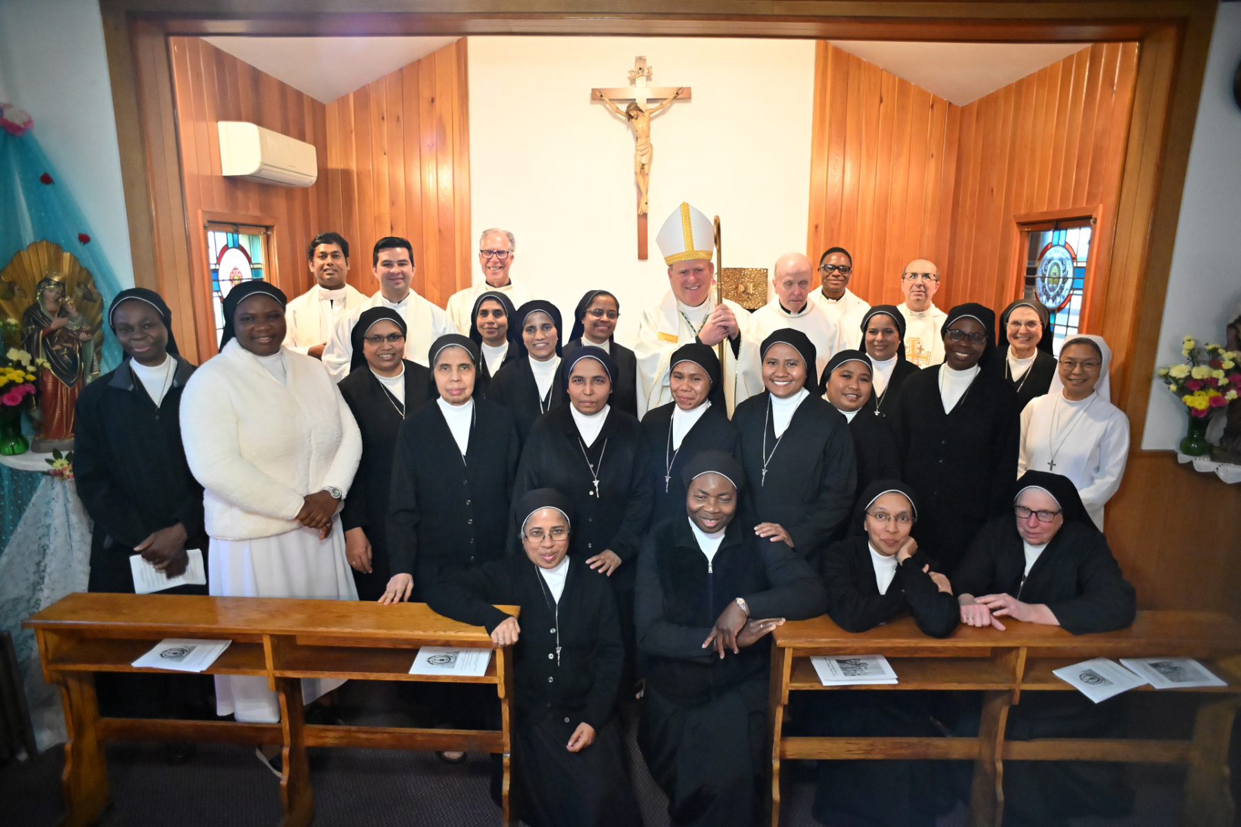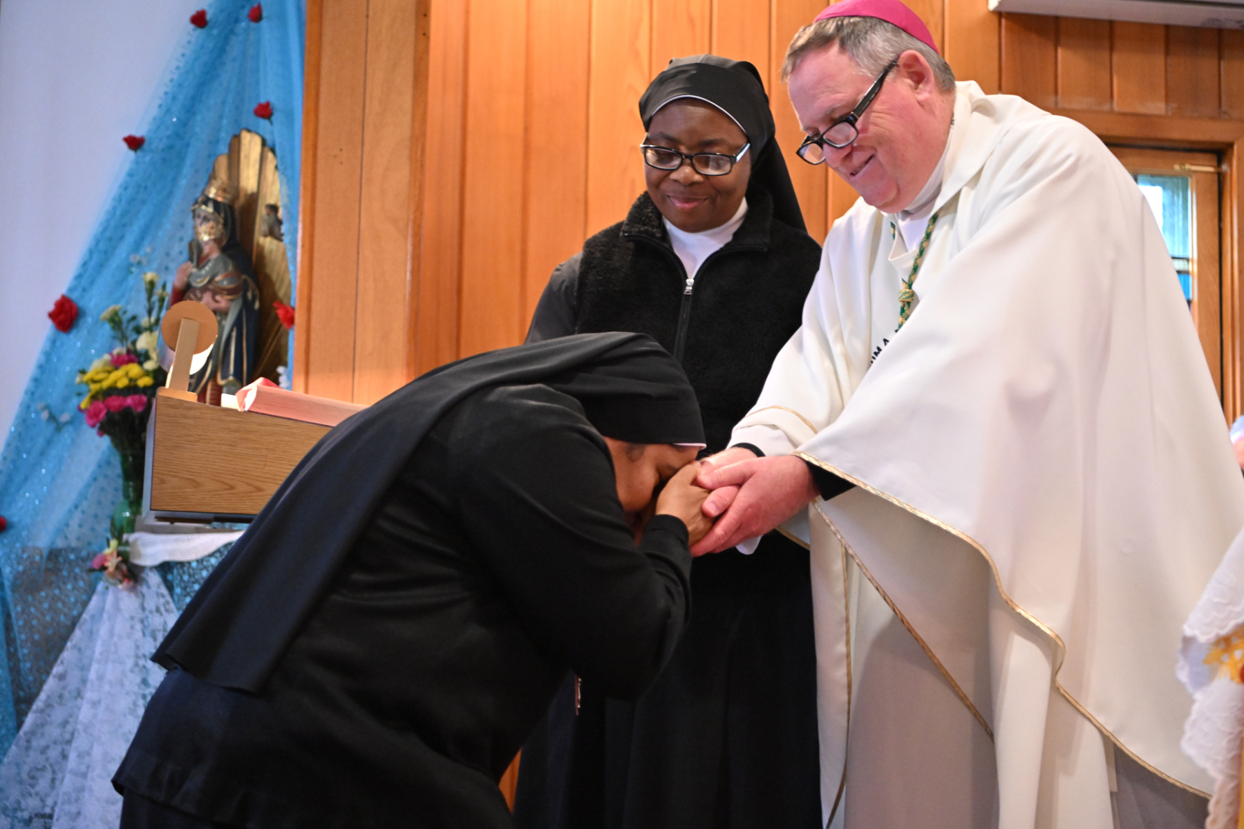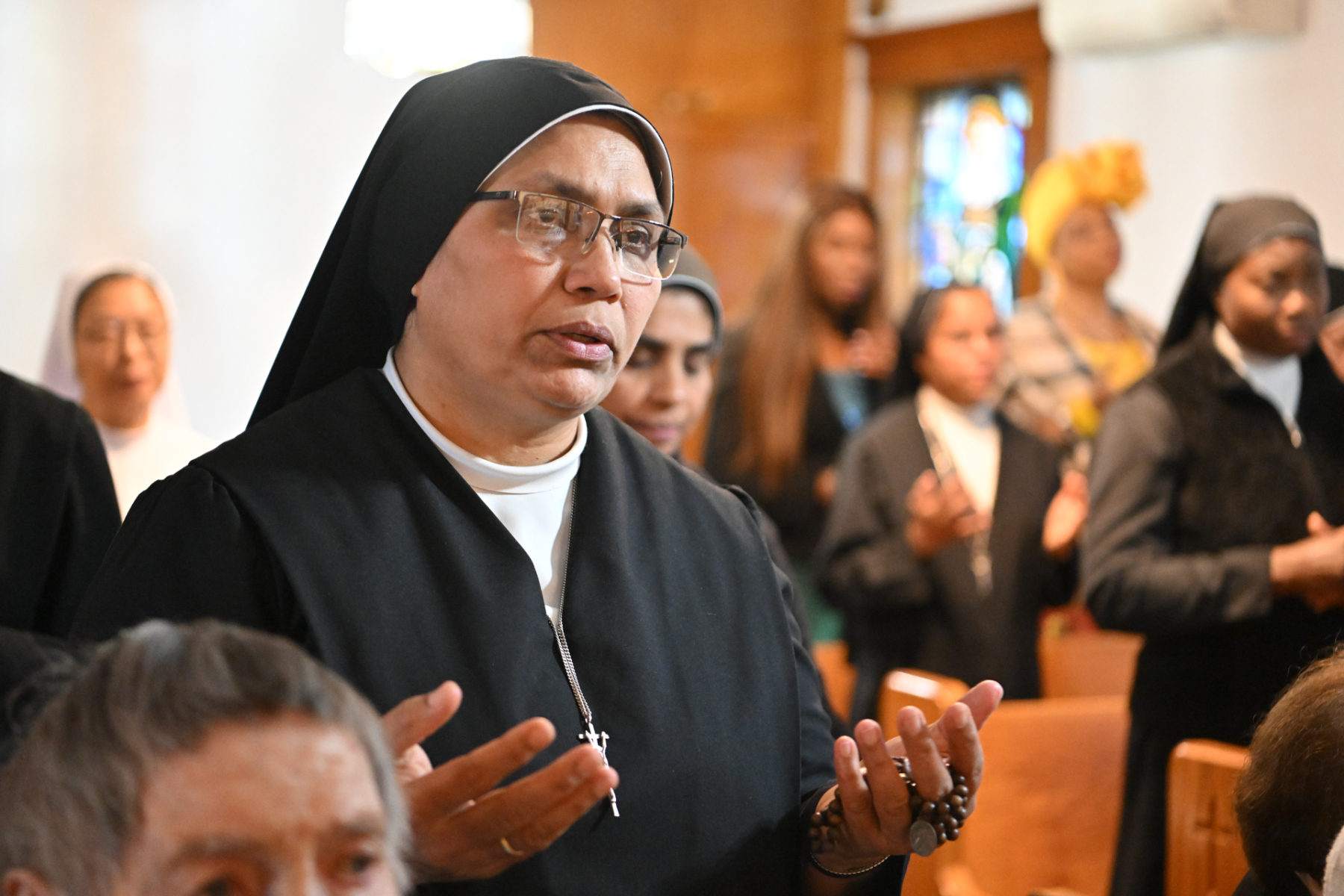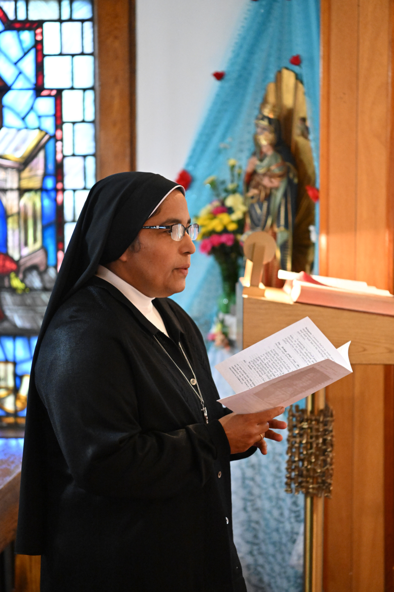 Bishop Sweeney was the main celebrant and homilist of the Mass. The concelebrants were Father Charles Waller, a retired diocesan priest and chaplain to the sisters; Msgr. George Hundt, pastor of St. Gerard Majella and Our Lady of Pompei parishes, both in Paterson; Father Marc Mancini, pastor of St. James of the Marches Parish in Totowa, N.J.; Father Manuel Alejandro Cuellar, parochial vicar of St. Gerard Majella and Our Lady of Pompei; and Father Erasmus Okere, parochial vicar of Blessed Sacrament/St. Charles Borromeo Parish in Newark, N.J. These priests were joined by Father Simmy Thomas, the parish vicar of St. George Syro-Malabar Catholic Church, also in Paterson.