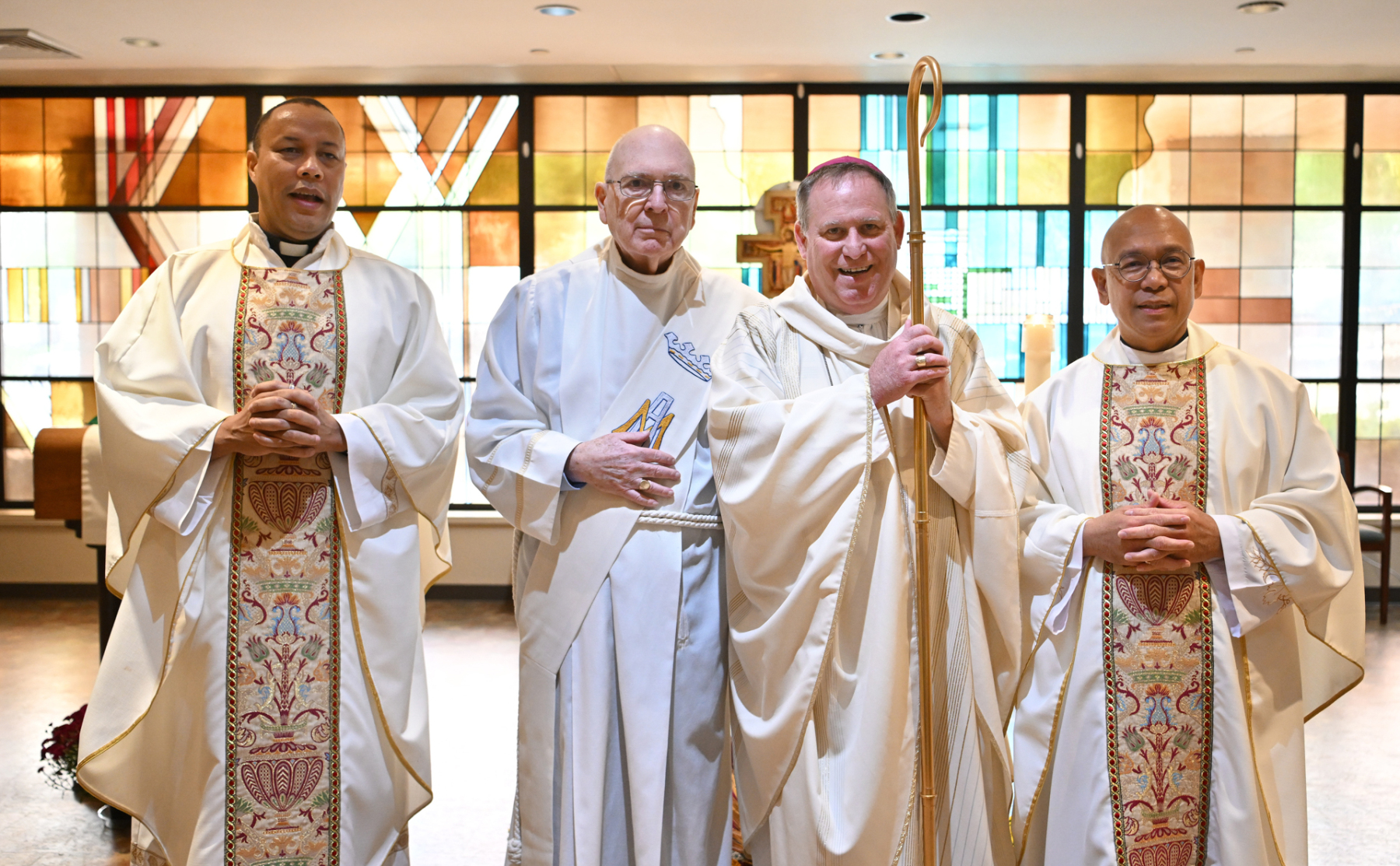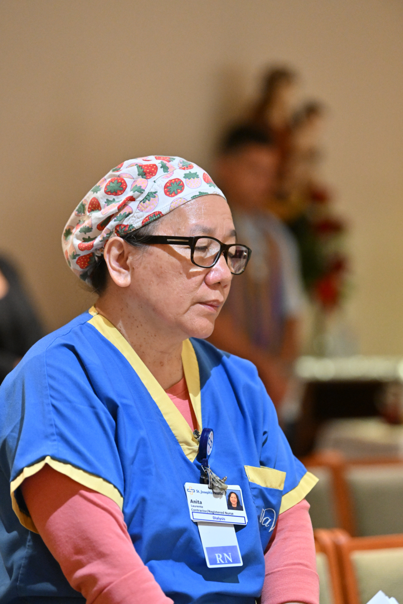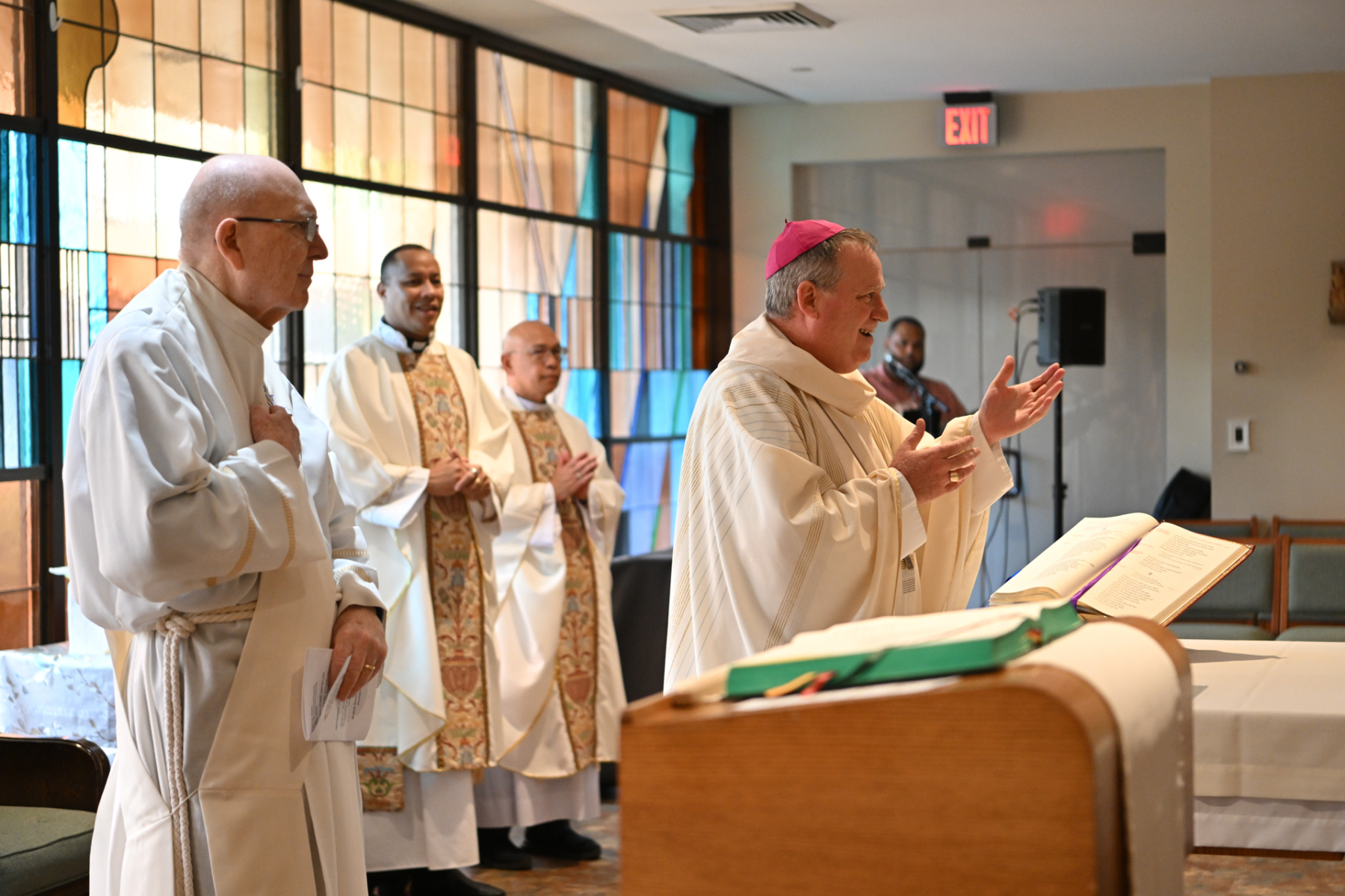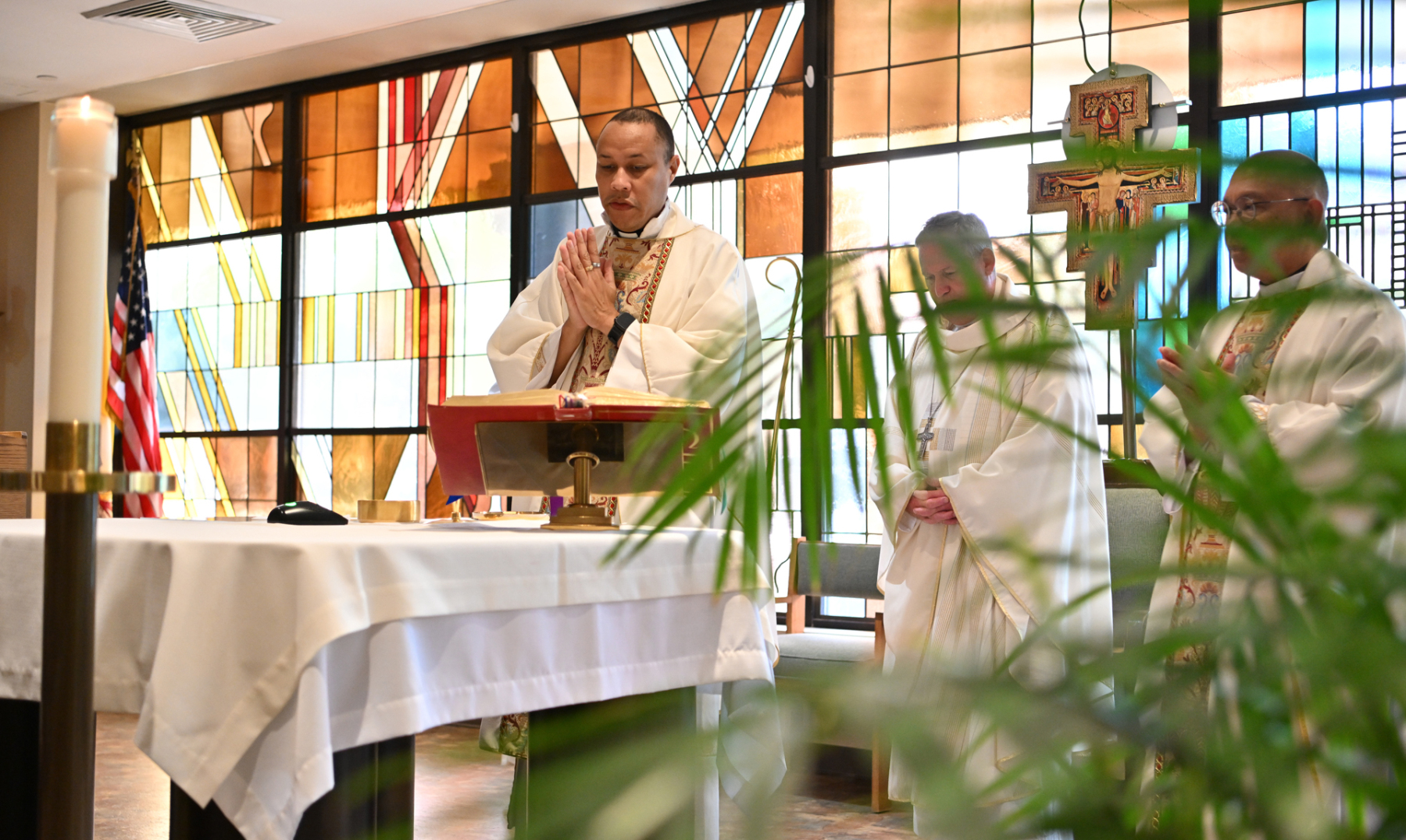 Father Francis Conde, a hospital chaplain at St. Joseph’s who has been appointed pastor of St. Clare Parish in Clifton, N.J., effective Oct. 1, and Father Alexander Wilder Londono, also a hospital chaplain at St. Joseph’s, concelebrated the liturgy with Bishop Sweeney. Deacon Lawrence Duffy, pastoral care director of St. Joseph’s Health, assisted with the liturgy.