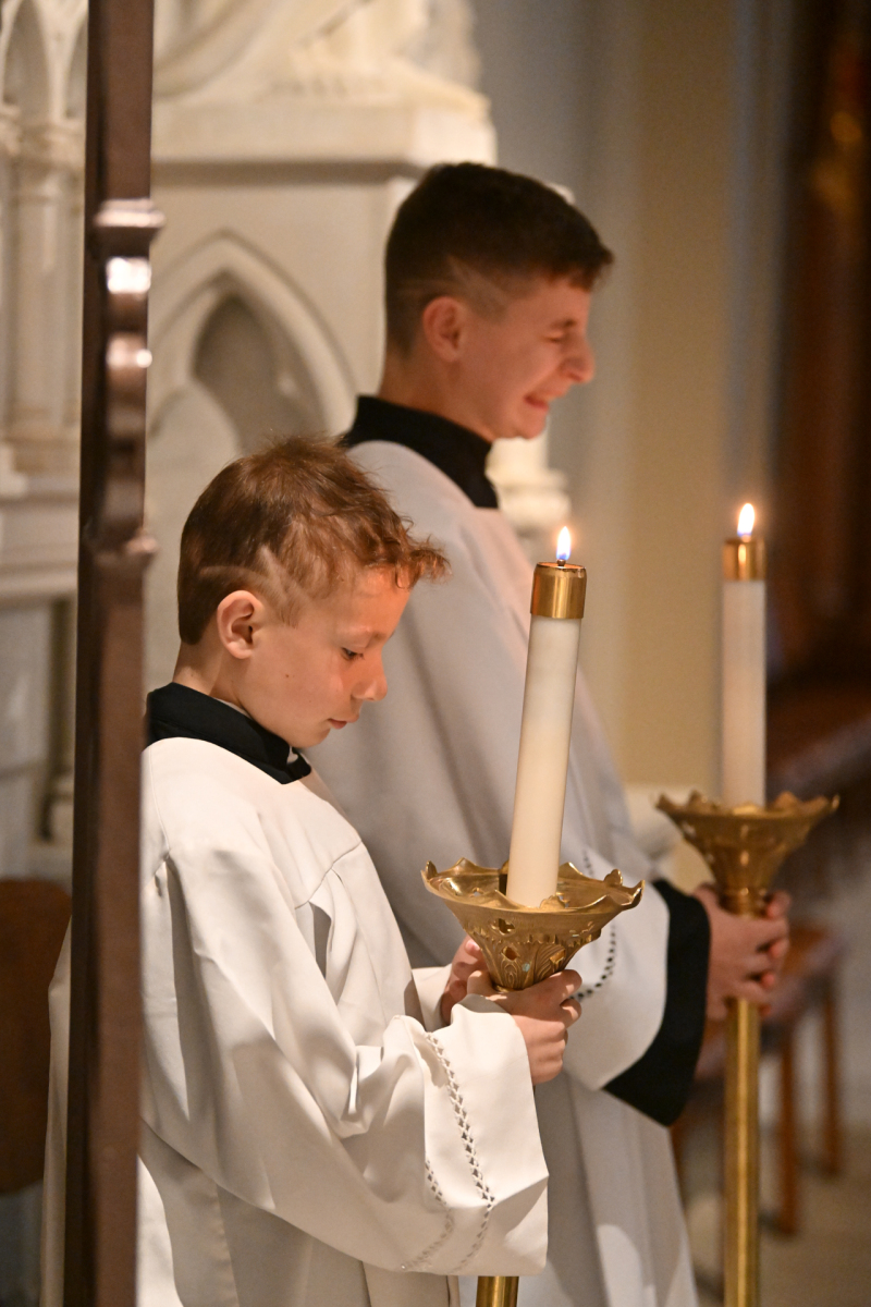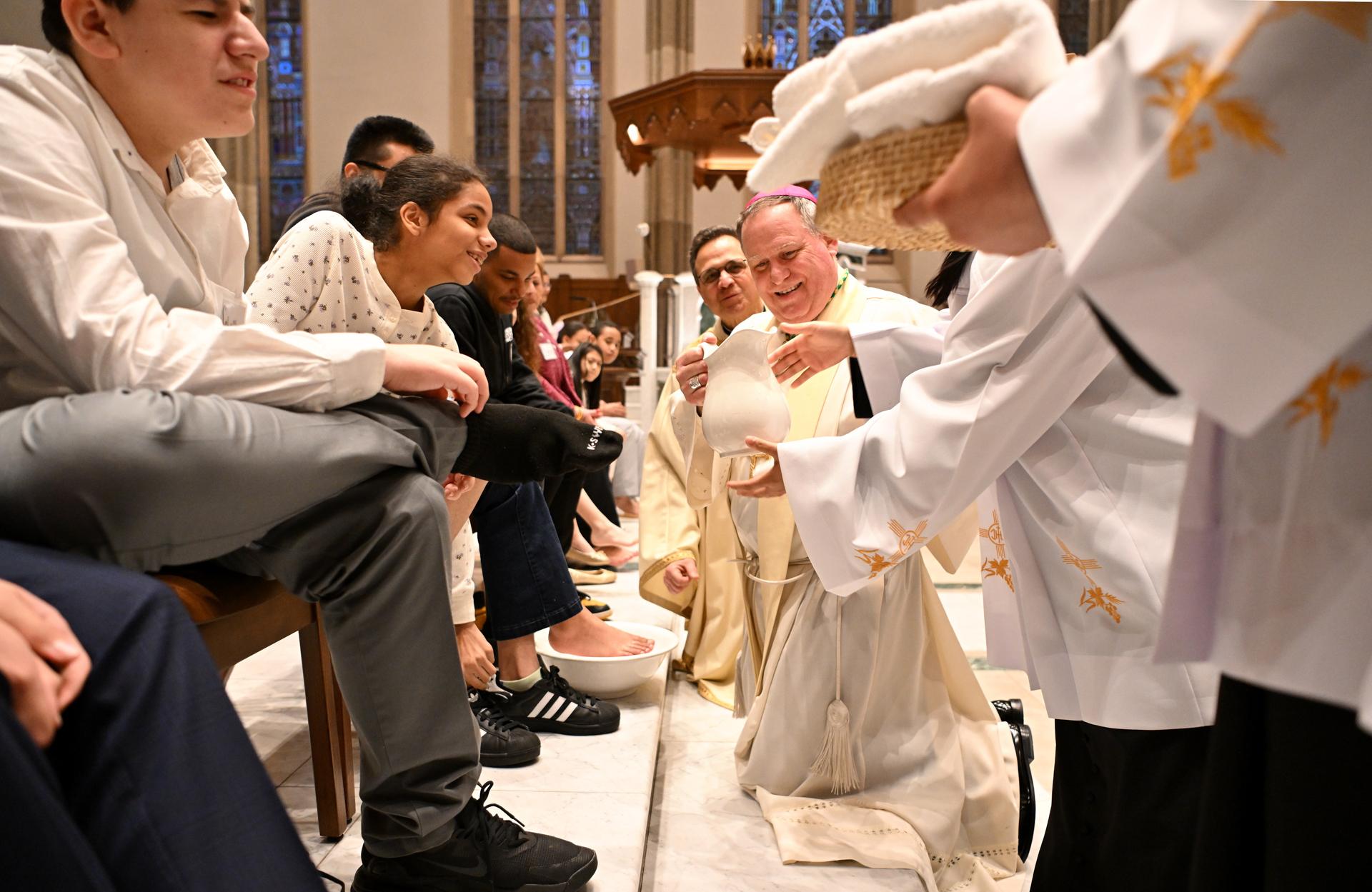The Mass commemorates Jesus’ institution of the Holy Eucharist and the priesthood in Holy Orders. Just as Jesus washed his disciples’ feet at the Last Supper, Bishop Sweeney washed the feet of members of St. John’s Special Needs Ministry, mostly youth, to symbolize the service and charity of Christ, who came “not to be served, but to serve.” By example of washing his disciples’ feet, Jesus demonstrated how Christians are to love one another through humble service.