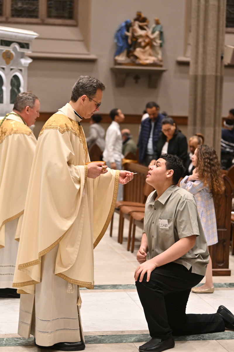 The Mass commemorates Jesus’ institution of the Holy Eucharist and the priesthood in Holy Orders. Just as Jesus washed his disciples’ feet at the Last Supper, Bishop Sweeney washed the feet of members of St. John’s Special Needs Ministry, mostly youth, to symbolize the service and charity of Christ, who came “not to be served, but to serve.” By example of washing his disciples’ feet, Jesus demonstrated how Christians are to love one another through humble service.