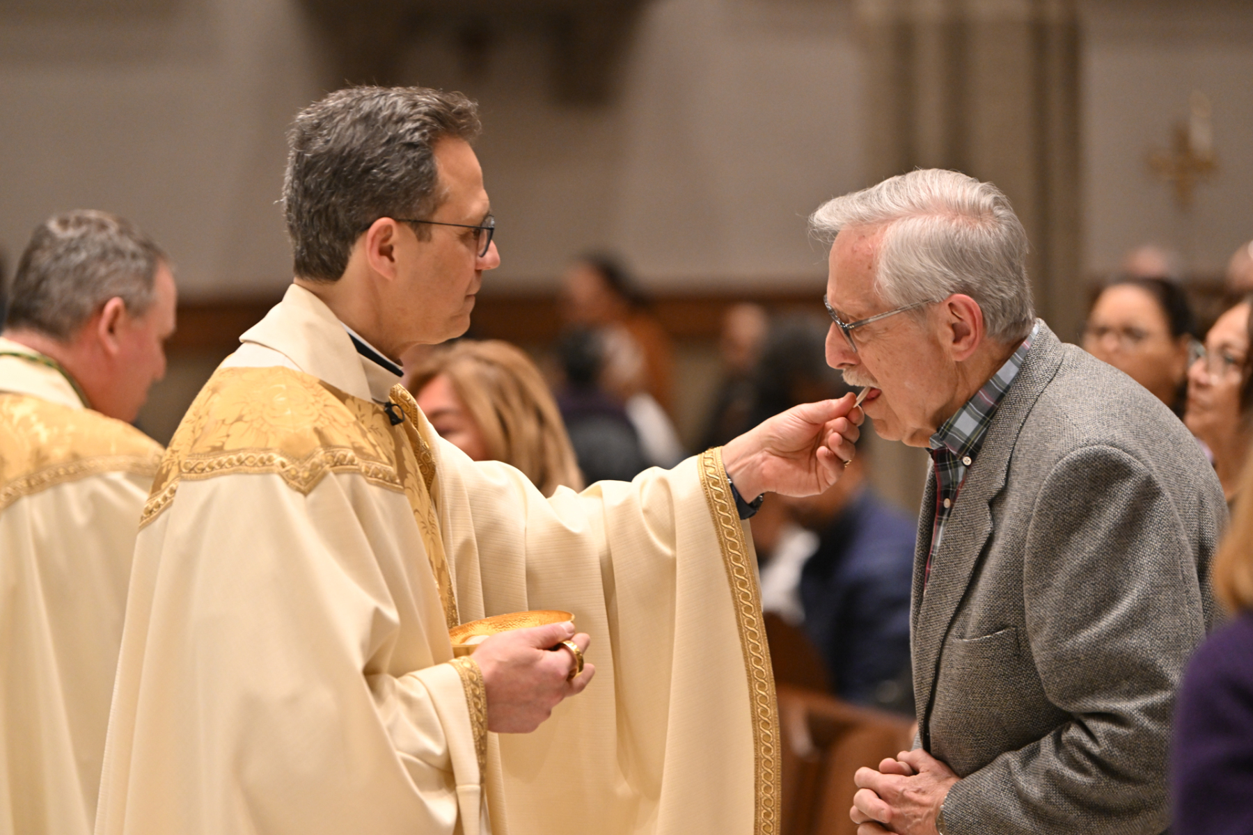 Bishop Kevin J. Sweeney led the Paterson Diocese in giving thanks to Jesus for the Holy Eucharist and for the priests who bring this “powerful gift” to the people in the liturgy while celebrating a bilingual Mass of the Lord’s Supper at the Cathedral of St. John the Baptist in Paterson on Holy Thursday evening, April 17.