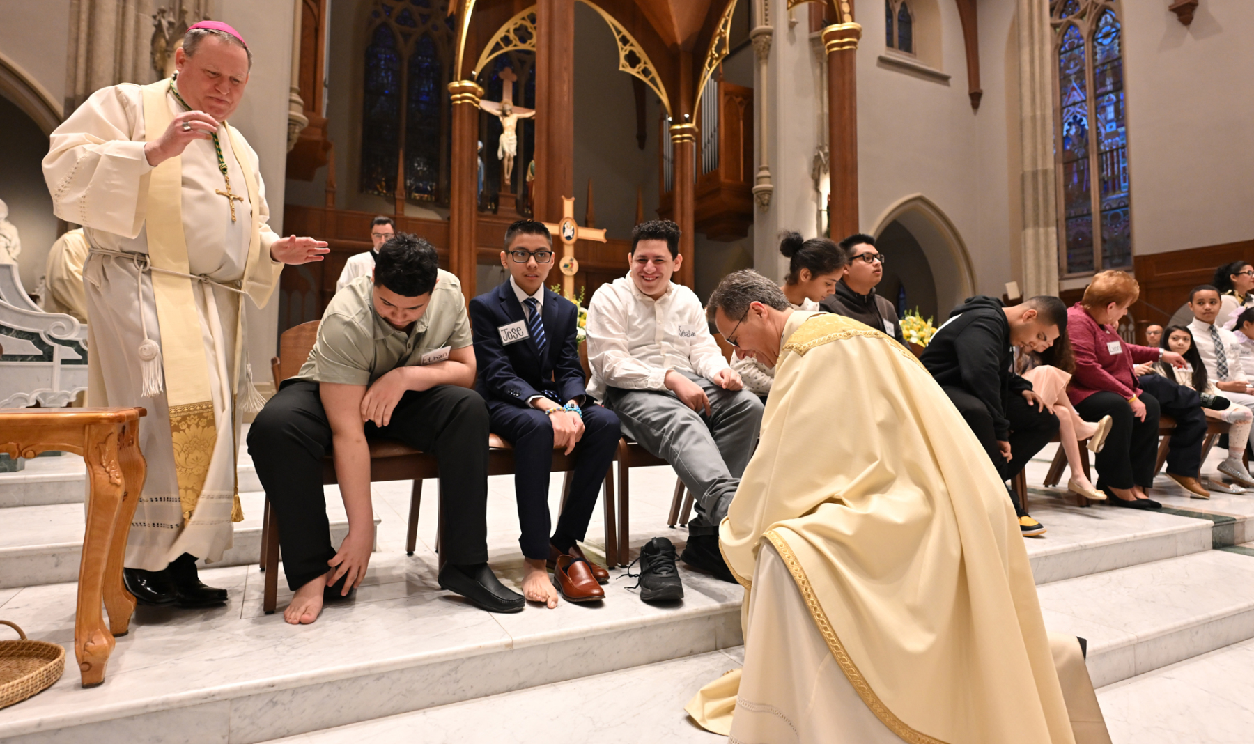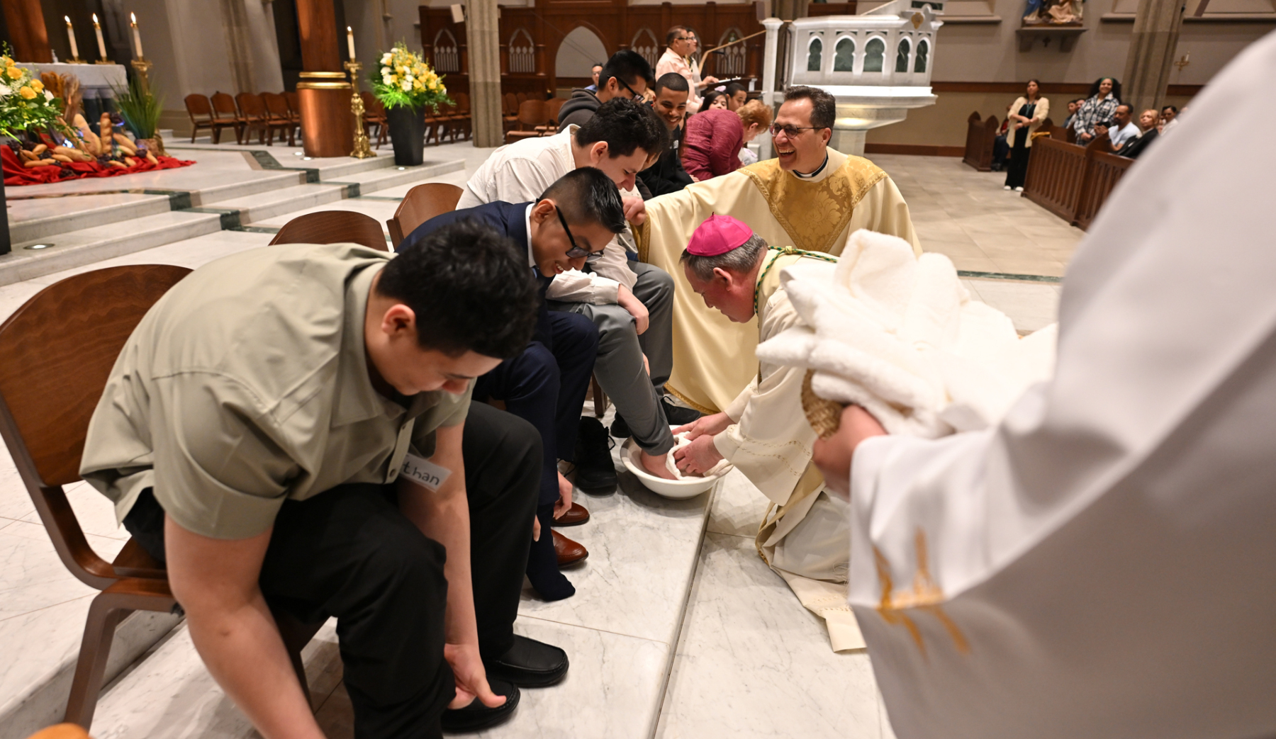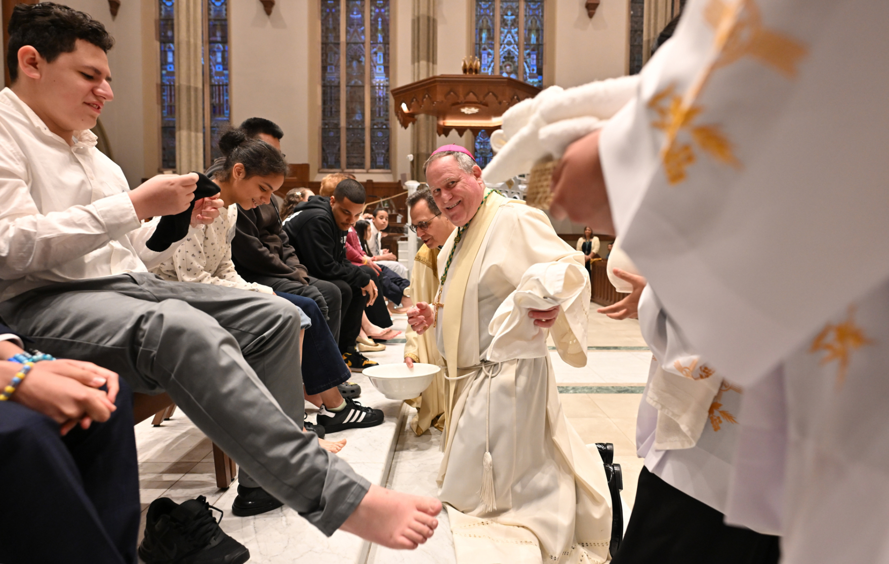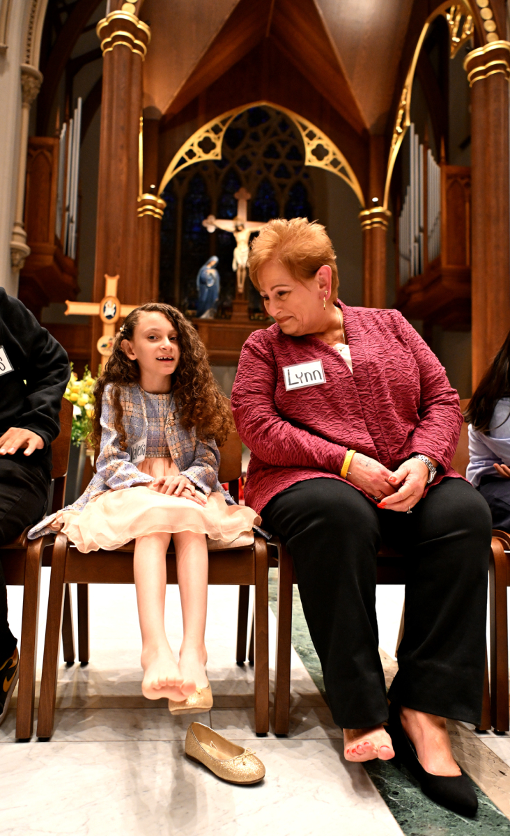 The Mass commemorates Jesus’ institution of the Holy Eucharist and the priesthood in Holy Orders. Just as Jesus washed his disciples’ feet at the Last Supper, Bishop Sweeney washed the feet of members of St. John’s Special Needs Ministry, mostly youth, to symbolize the service and charity of Christ, who came “not to be served, but to serve.” By example of washing his disciples’ feet, Jesus demonstrated how Christians are to love one another through humble service.